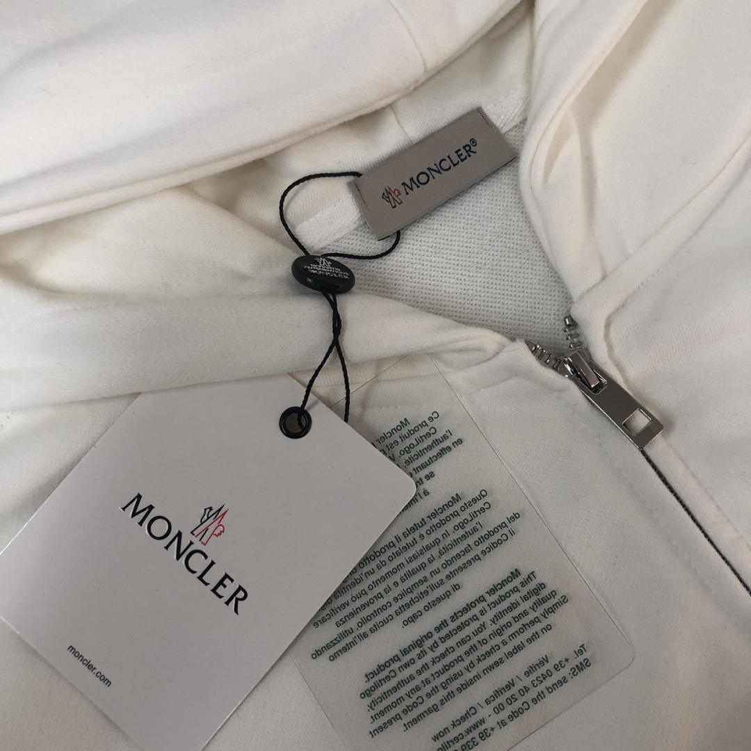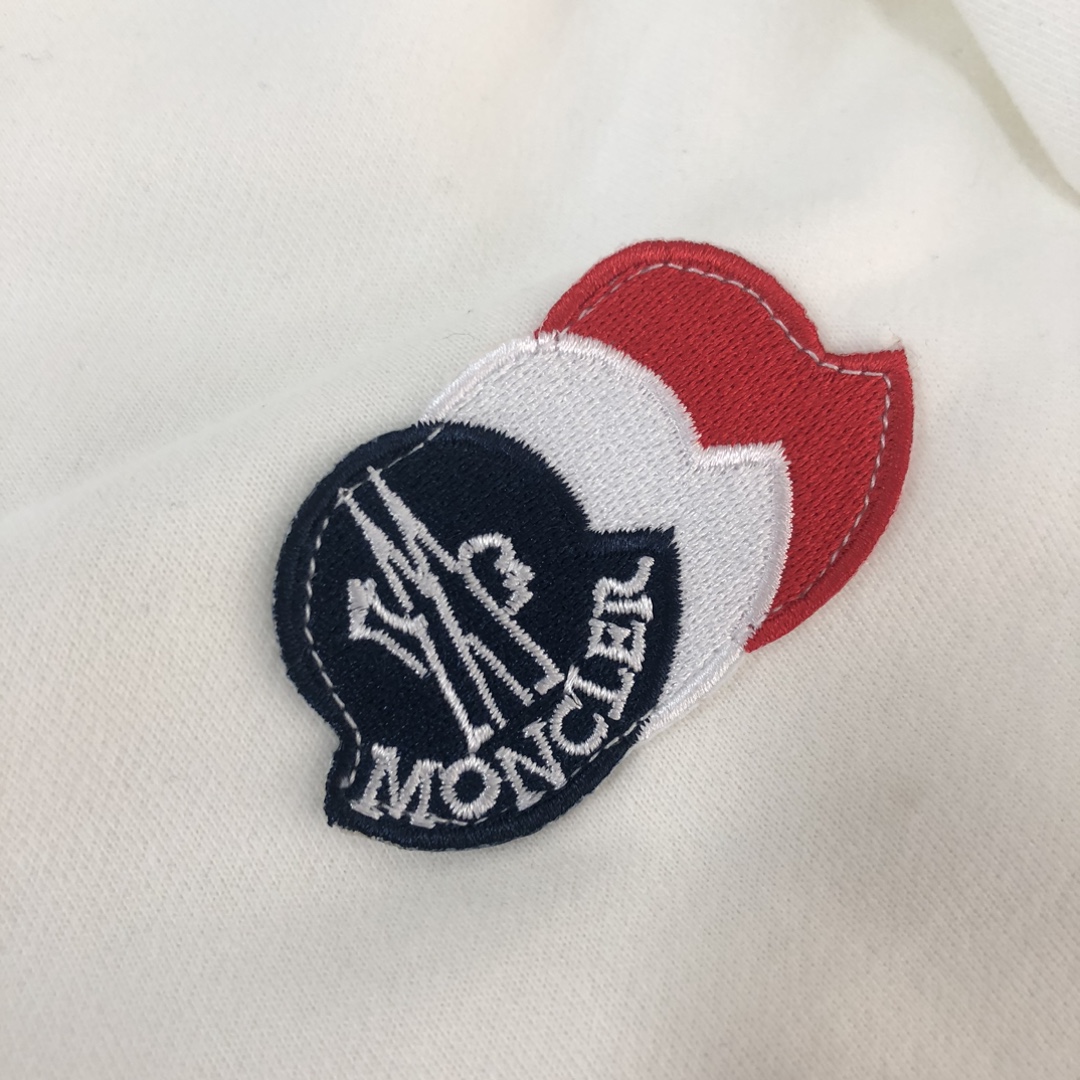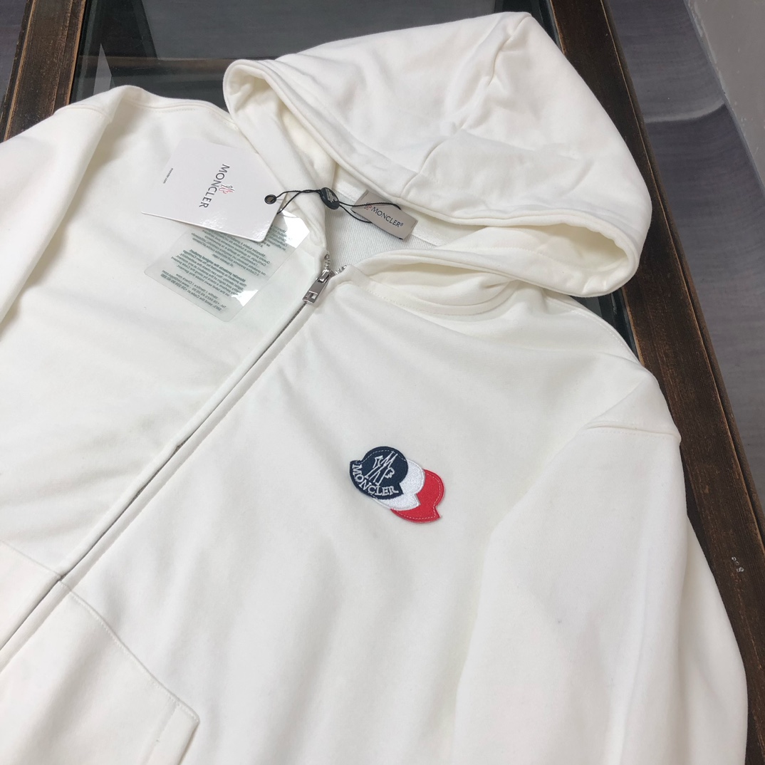 Moncler 2025 early autumn new couple's hooded zip-up sweatshirt and straight-leg pants set. Custom 420g cotton, tailored fit, available in black, white, navy, gray. Sizes S to XXL.