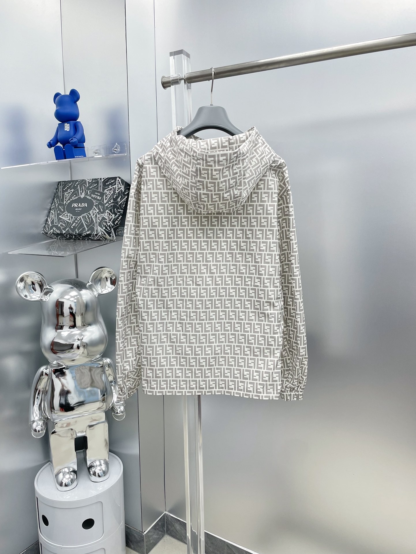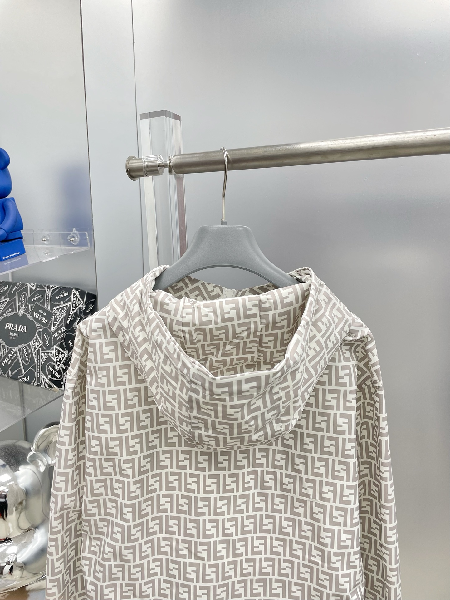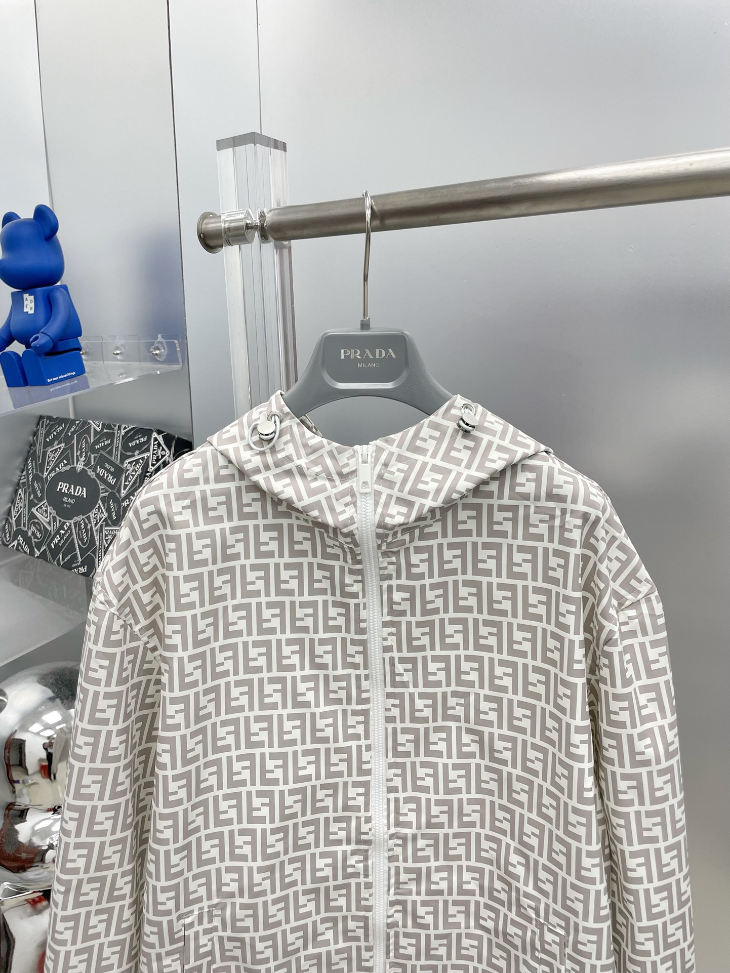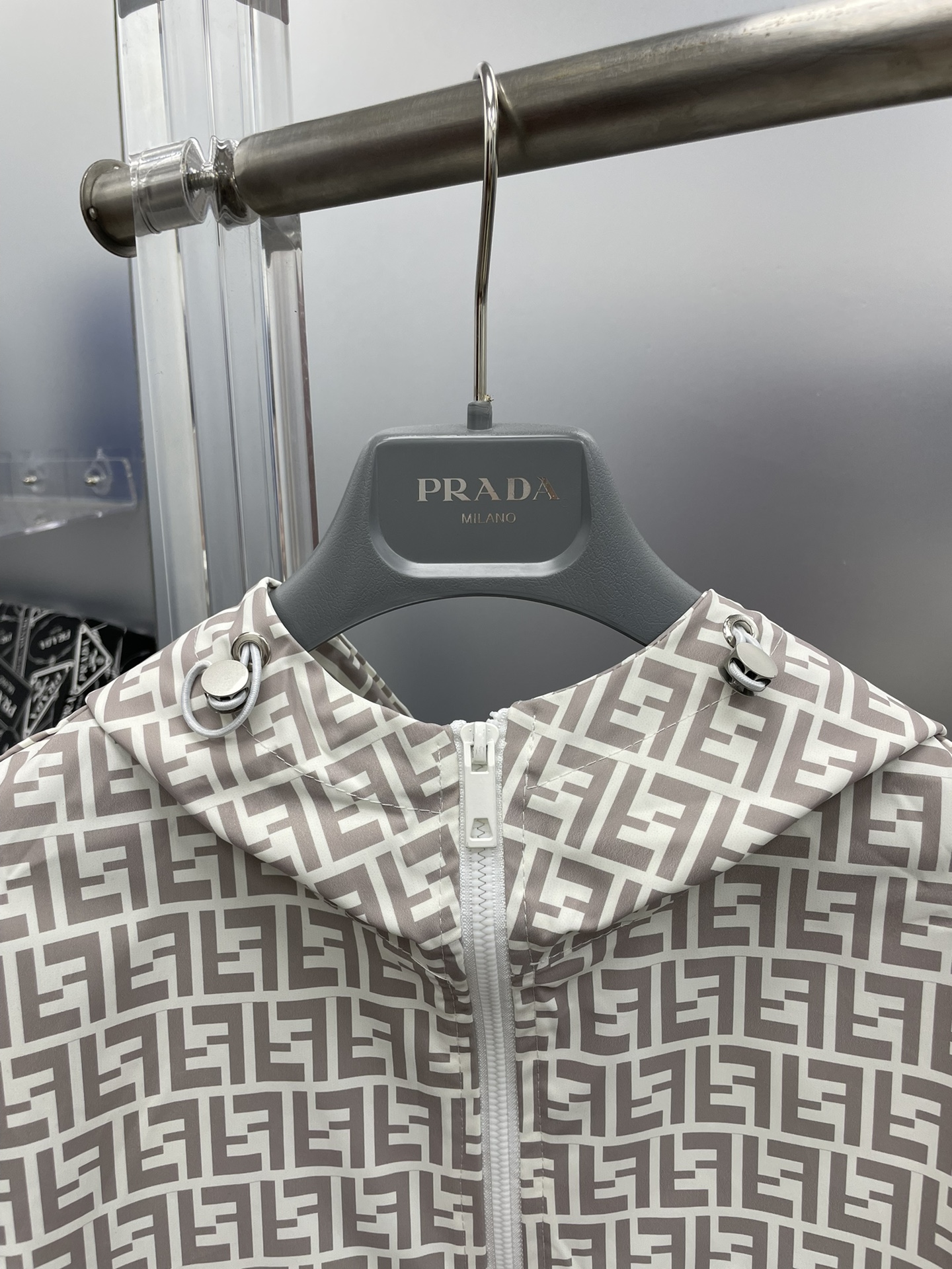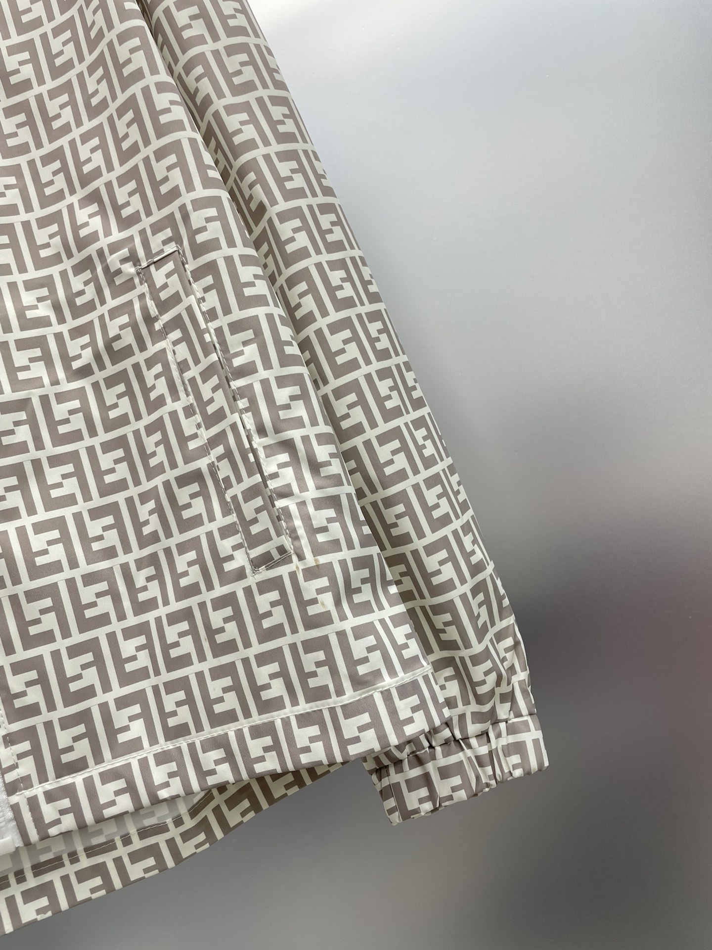 Fendi 2025 summer beige FF print sunscreen set: hooded jacket + shorts. Imported lightweight nylon, 3D print, comfortable. Sizes M-XXXL.