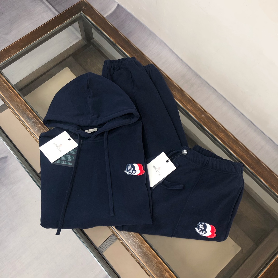 Moncler 2025 early autumn new couple's hoodie and pants set. Custom 420g cotton, premium quality. Colors: black, white, blue, gray. Sizes: S to XXL.