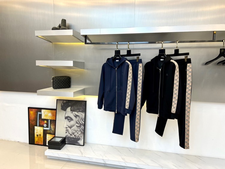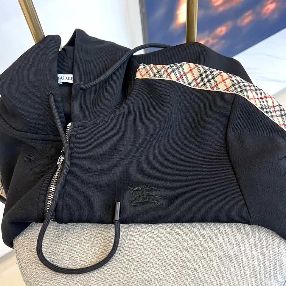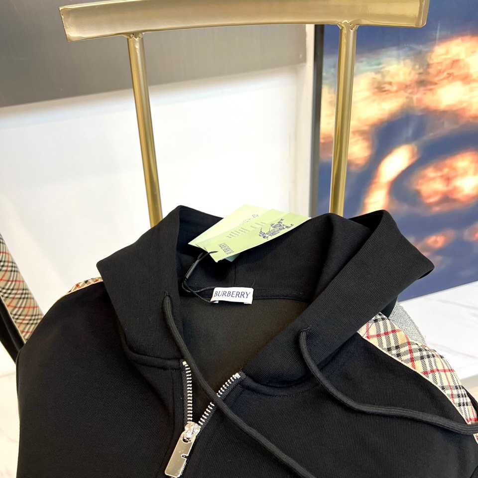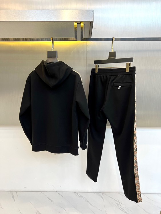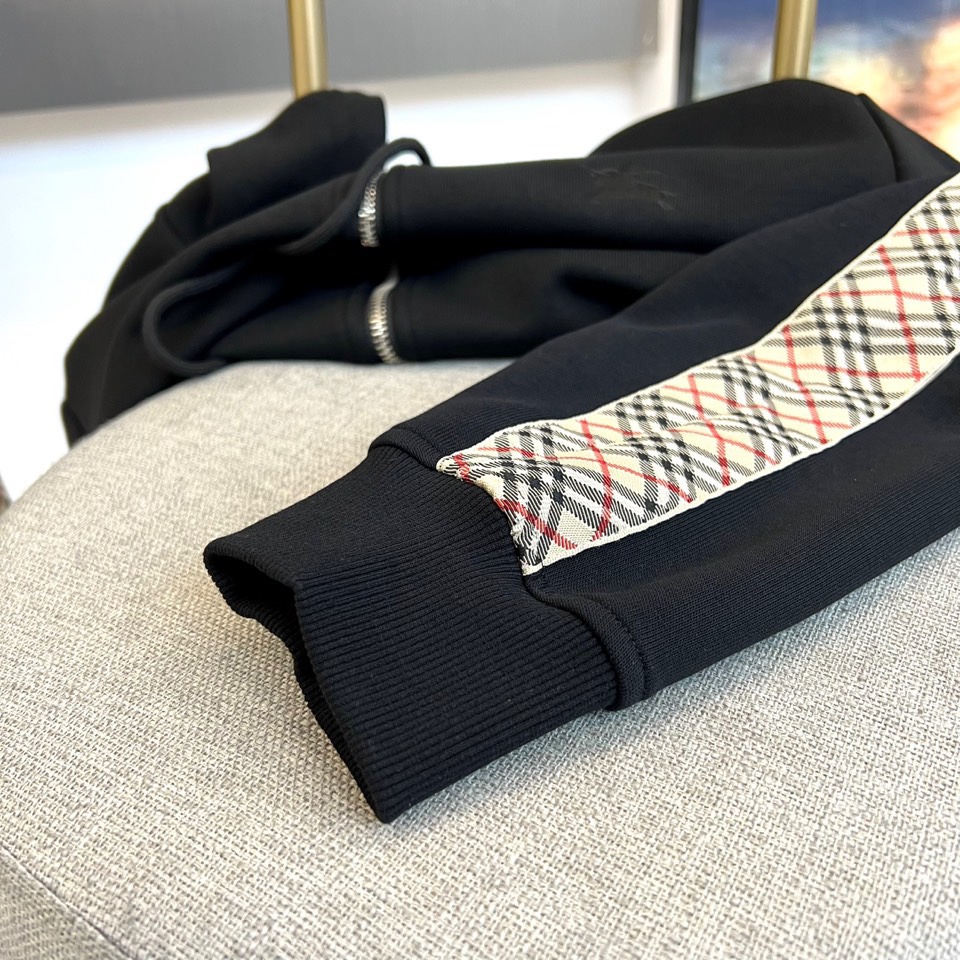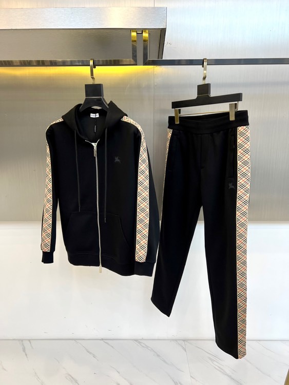Burberry 2025 autumn-winter hooded sportswear set in matte black with gray check trim. Features zip-up jacket and elastic waist pants. Combines luxury materials with sporty design for versatile urban style.