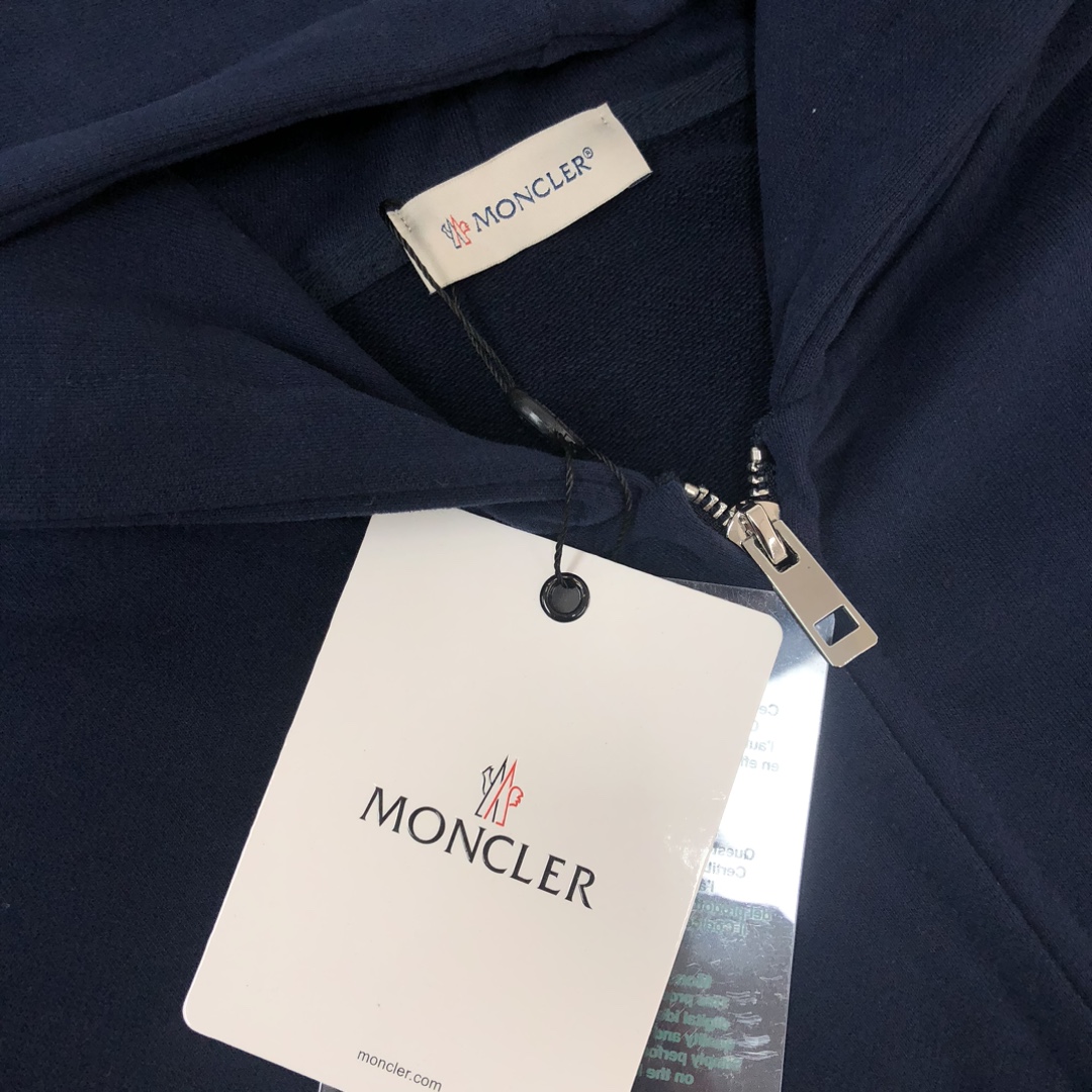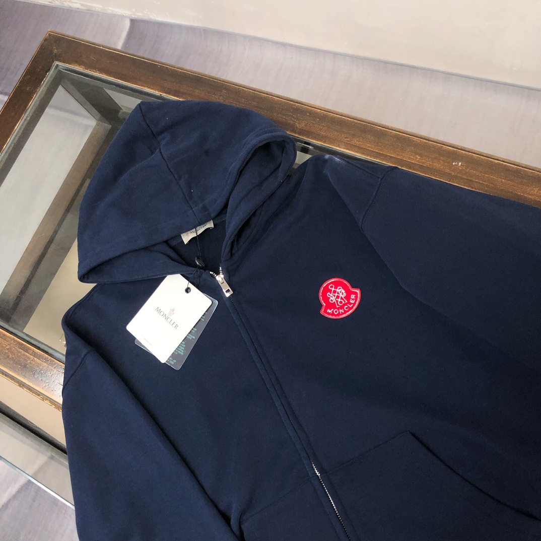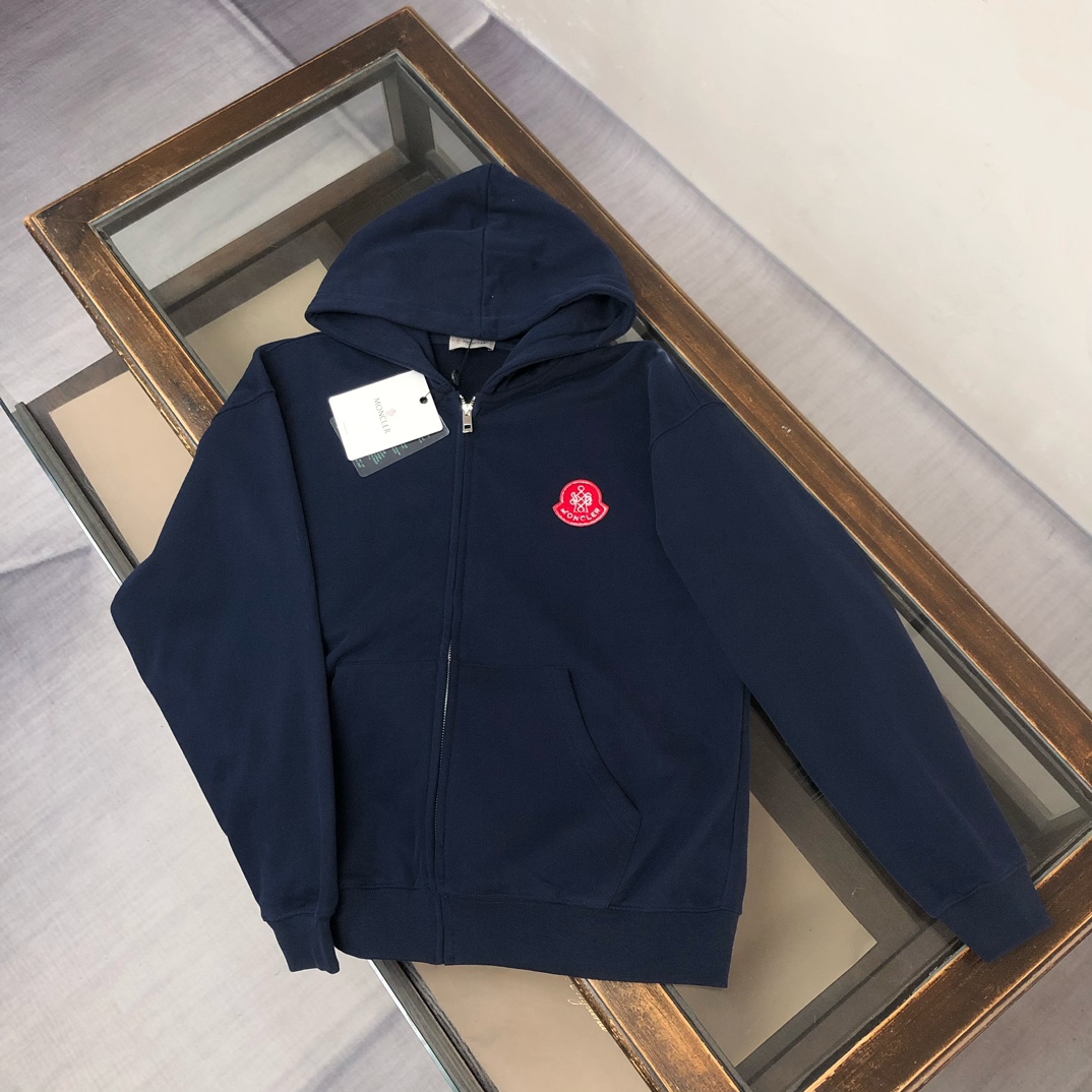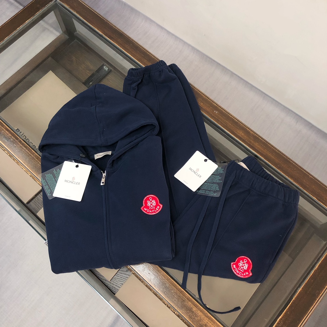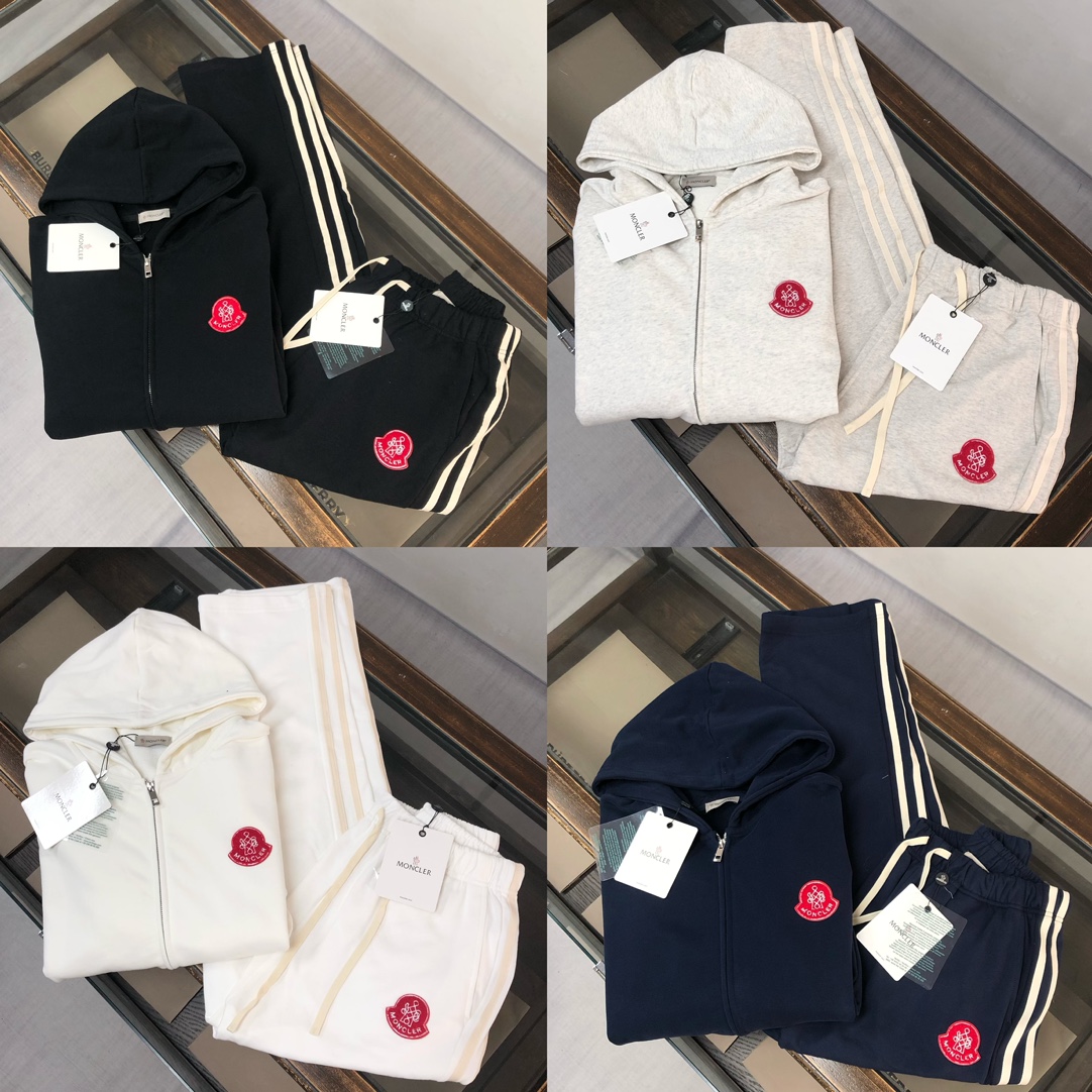 MONCLER 2025 early autumn hoodie & pants set. Custom 420g cotton, 3D cut, breathable. Colors: Black, White, Blue, Gray. Sizes: S-XXL. Provide height/weight when ordering.