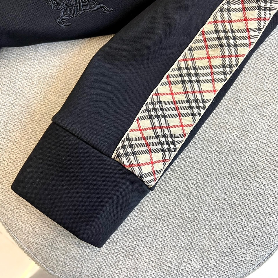 Burberry 2025 autumn/winter sportswear set in black with signature beige checkered trim on sleeves and pants. Features stretch fabric, embroidered emblem, and versatile design for workouts or casual wear.