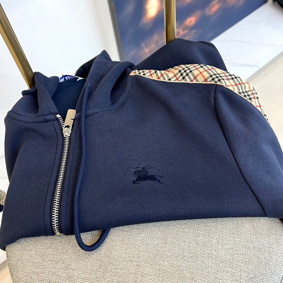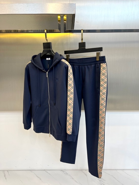 Burberry 2025秋冬连帽运动套装。哑光黑配深灰格纹饰边。立领拉链夹克配防风帽,弹力腰长裤。融合奢华面料与运动功能,适合休闲或混搭造型。尺码48-56。