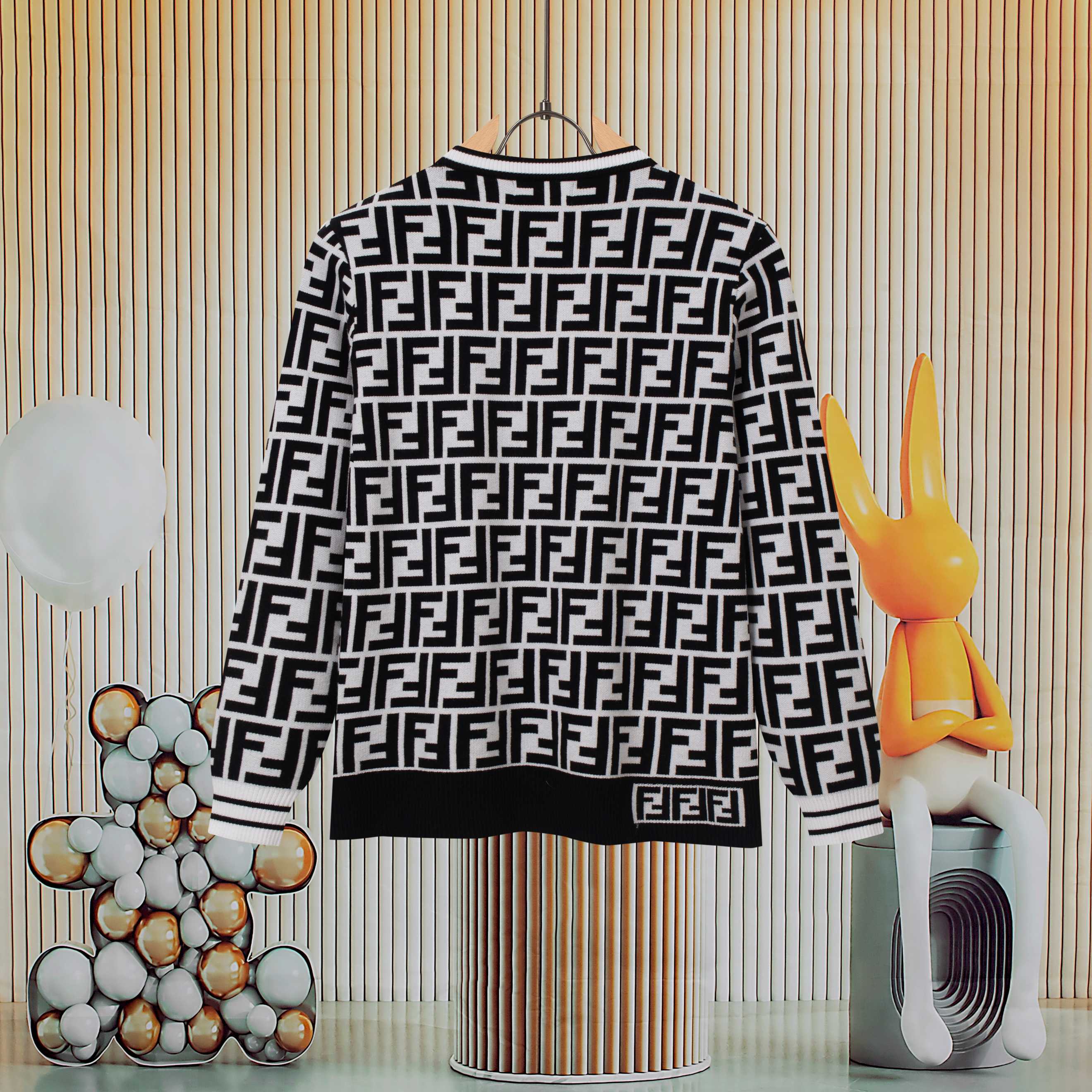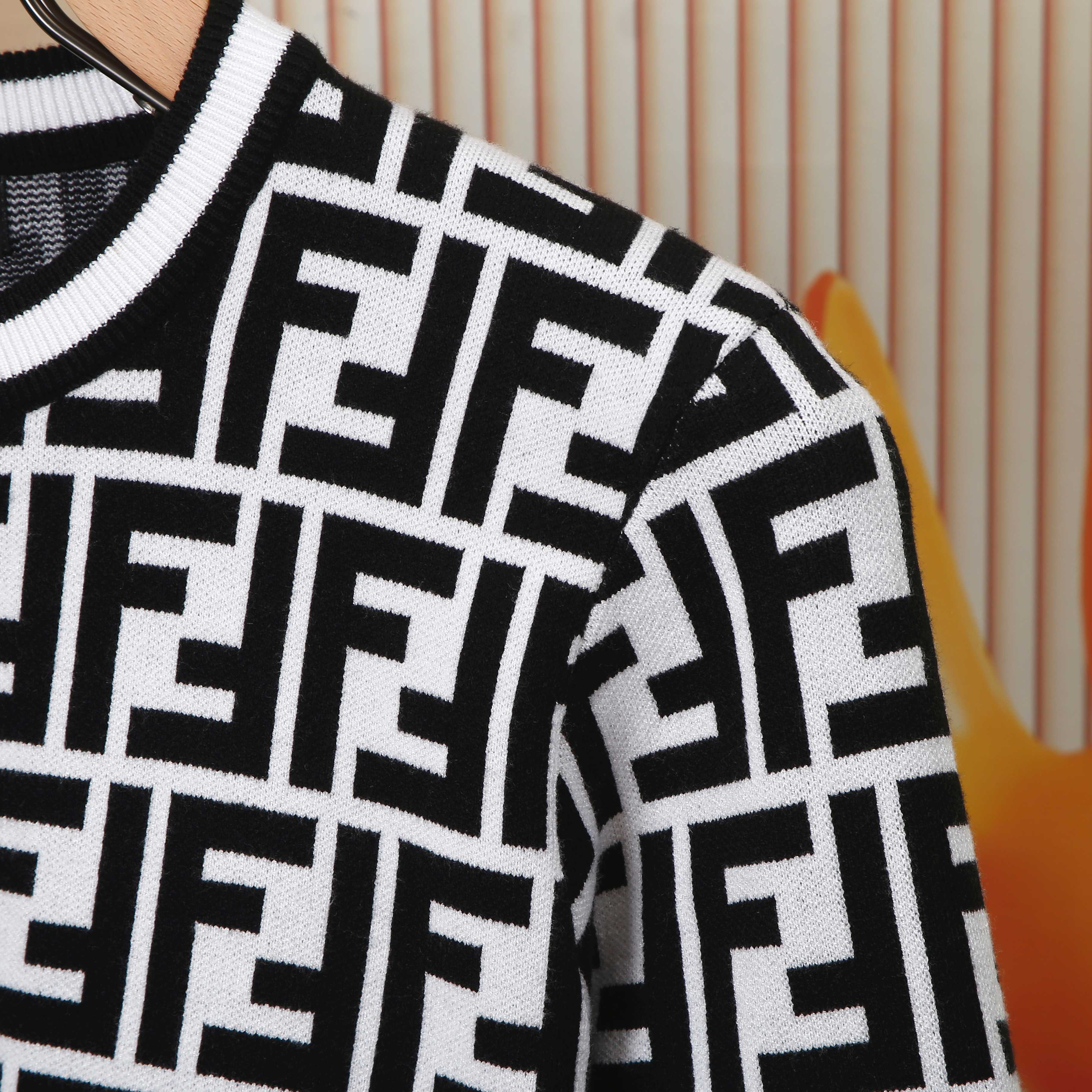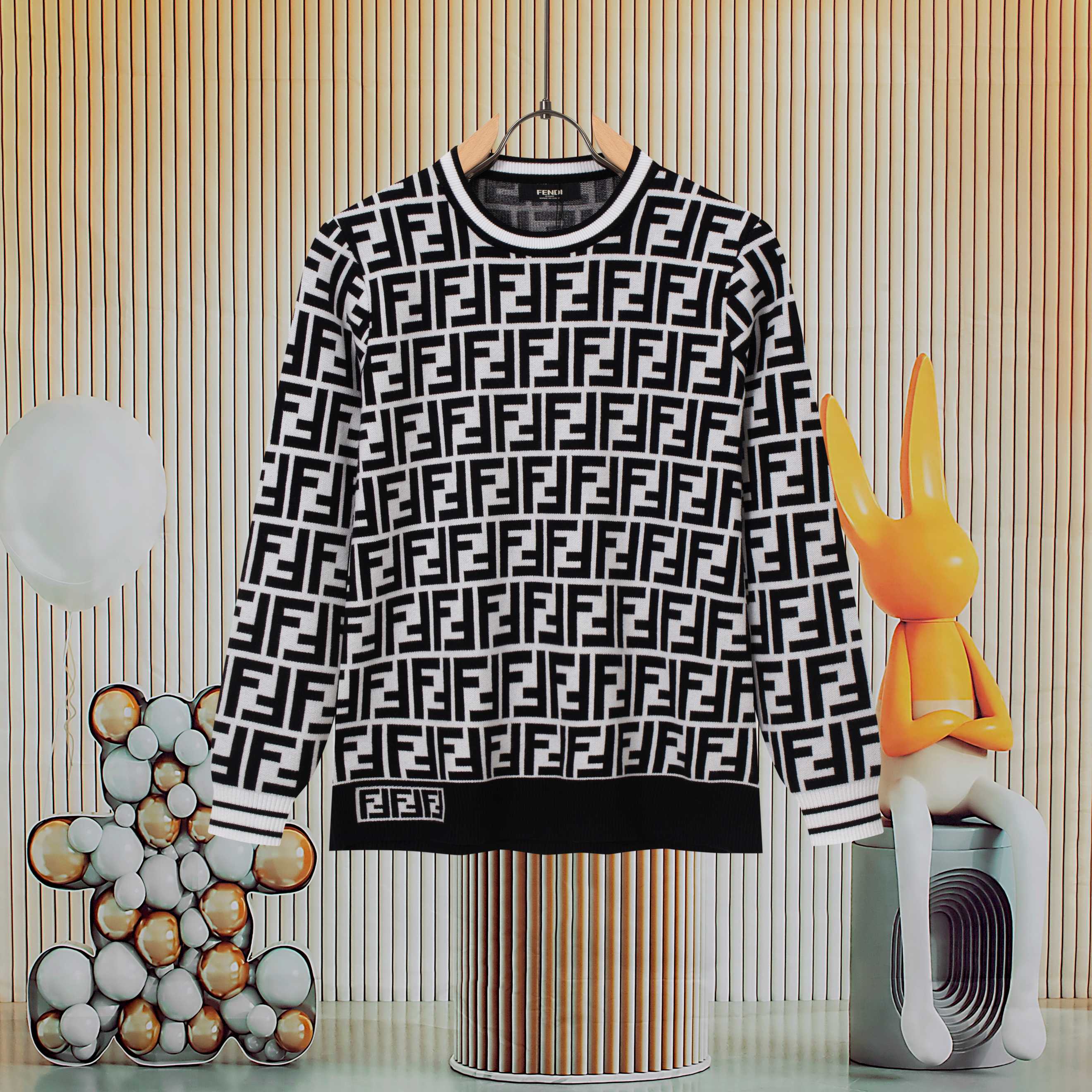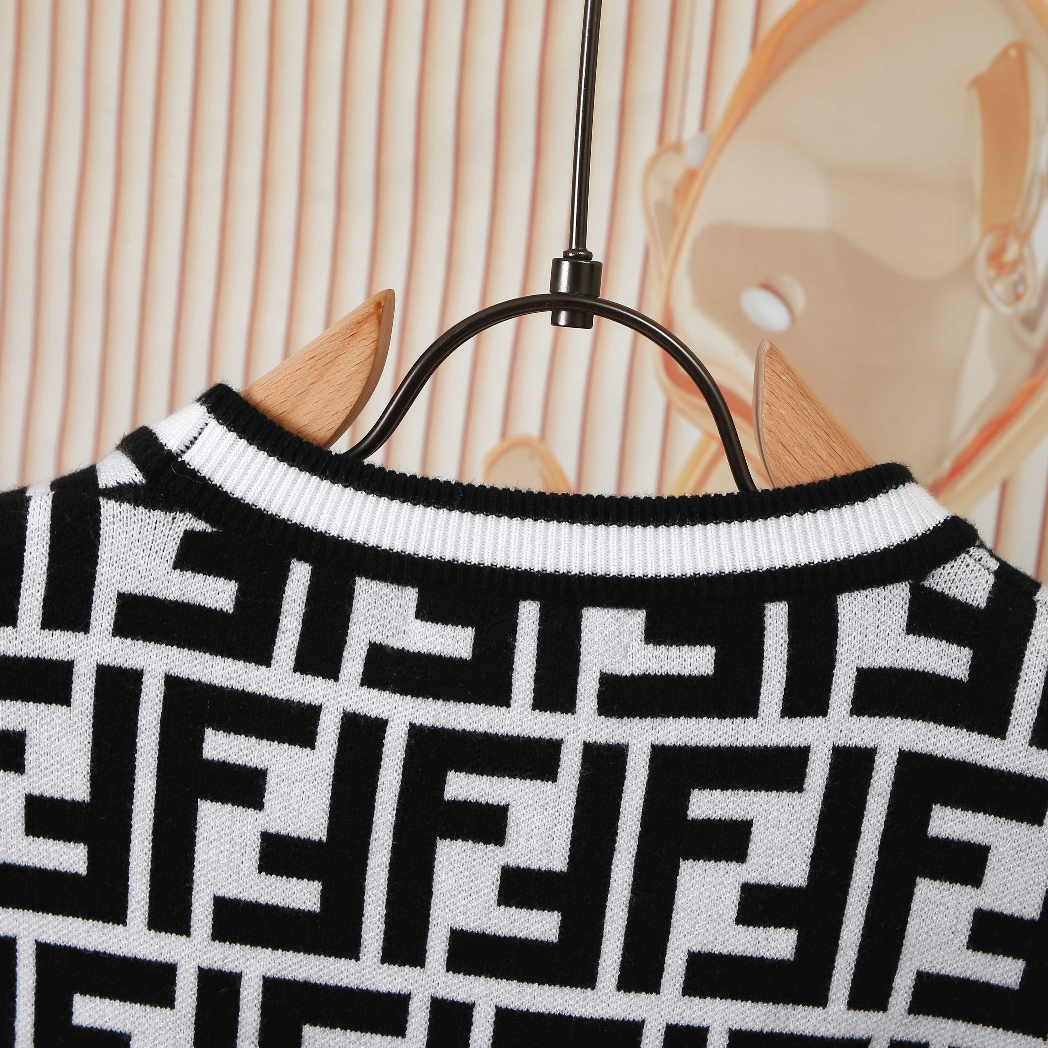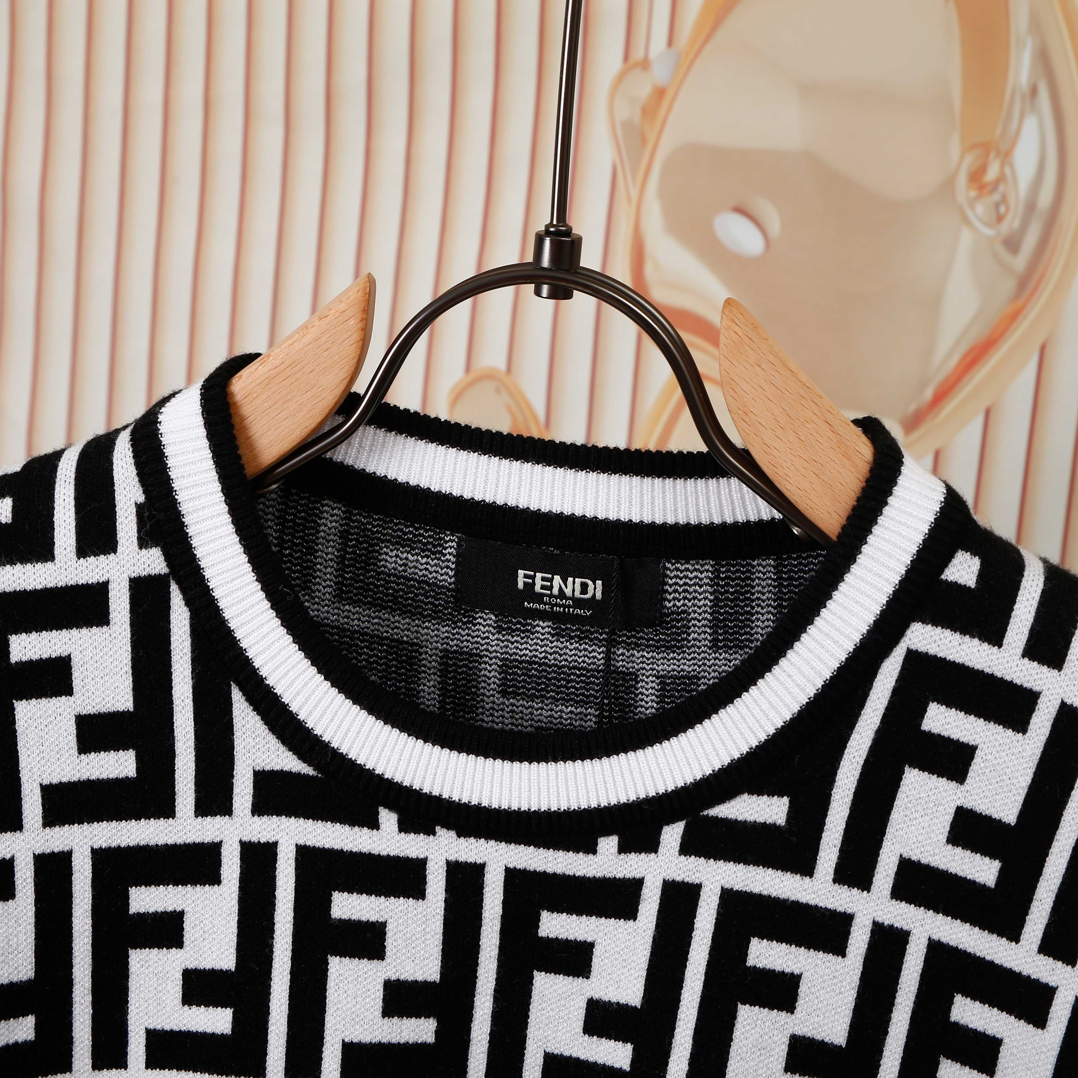 New popular FENDI item, full-body double F round neck knit. Uses high-end core-spun yarn fabric, unique collar design, hem features double F logo, really excellent. Pairs effortlessly with anything for a great sense of style. Workmanship and details are 1:1 synchronized with the official website. Absolutely does not pill, not scratchy to the skin, feels super comfortable to the touch. The cut is particularly comfortable, appearance is very high, color combination is beautiful, workmanship is extremely detailed. Highly recommended. Quality can be compared to the market, not afraid to compare with other products.