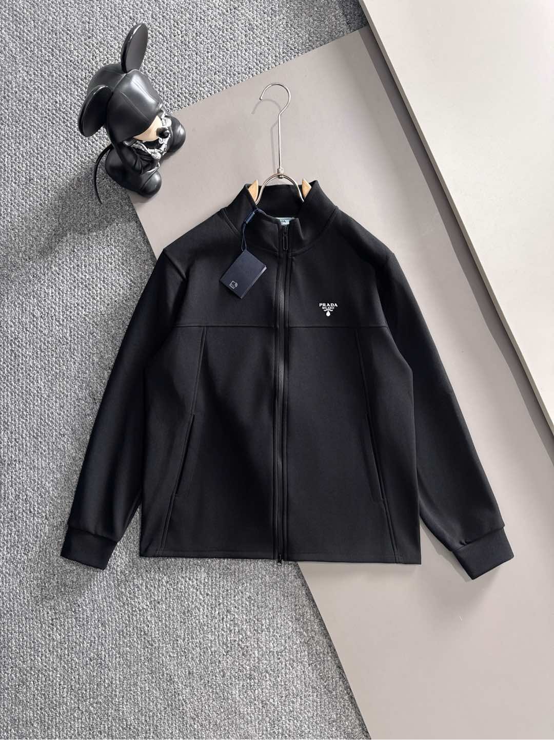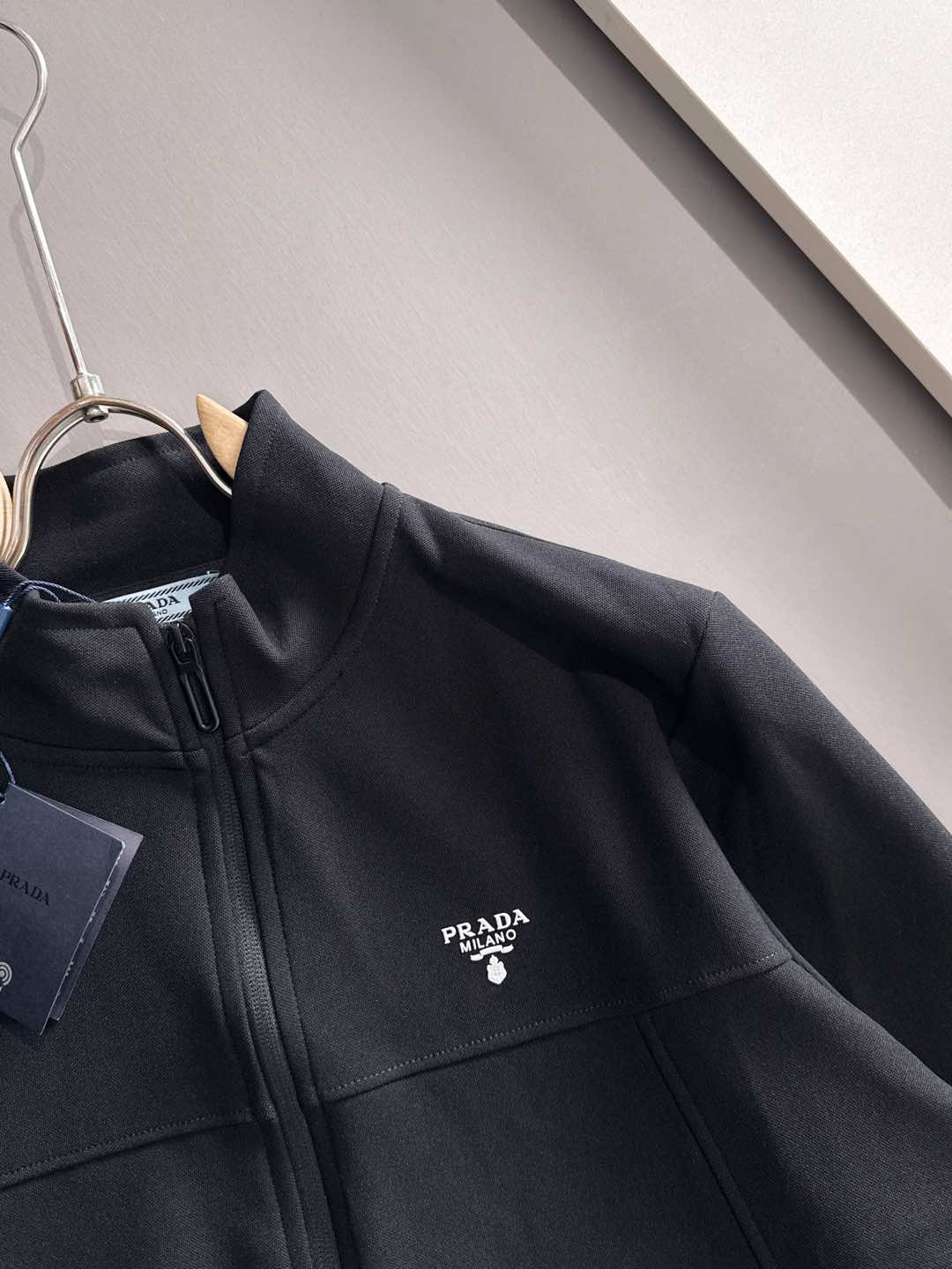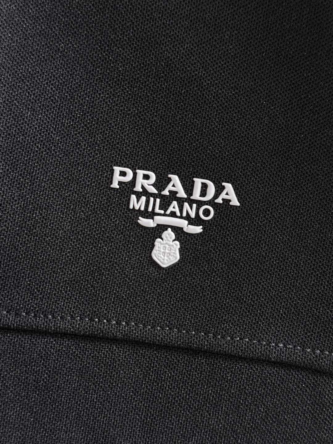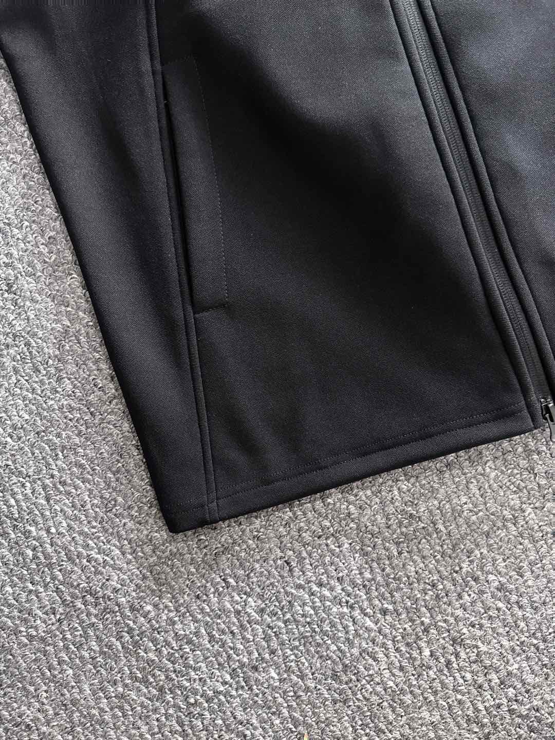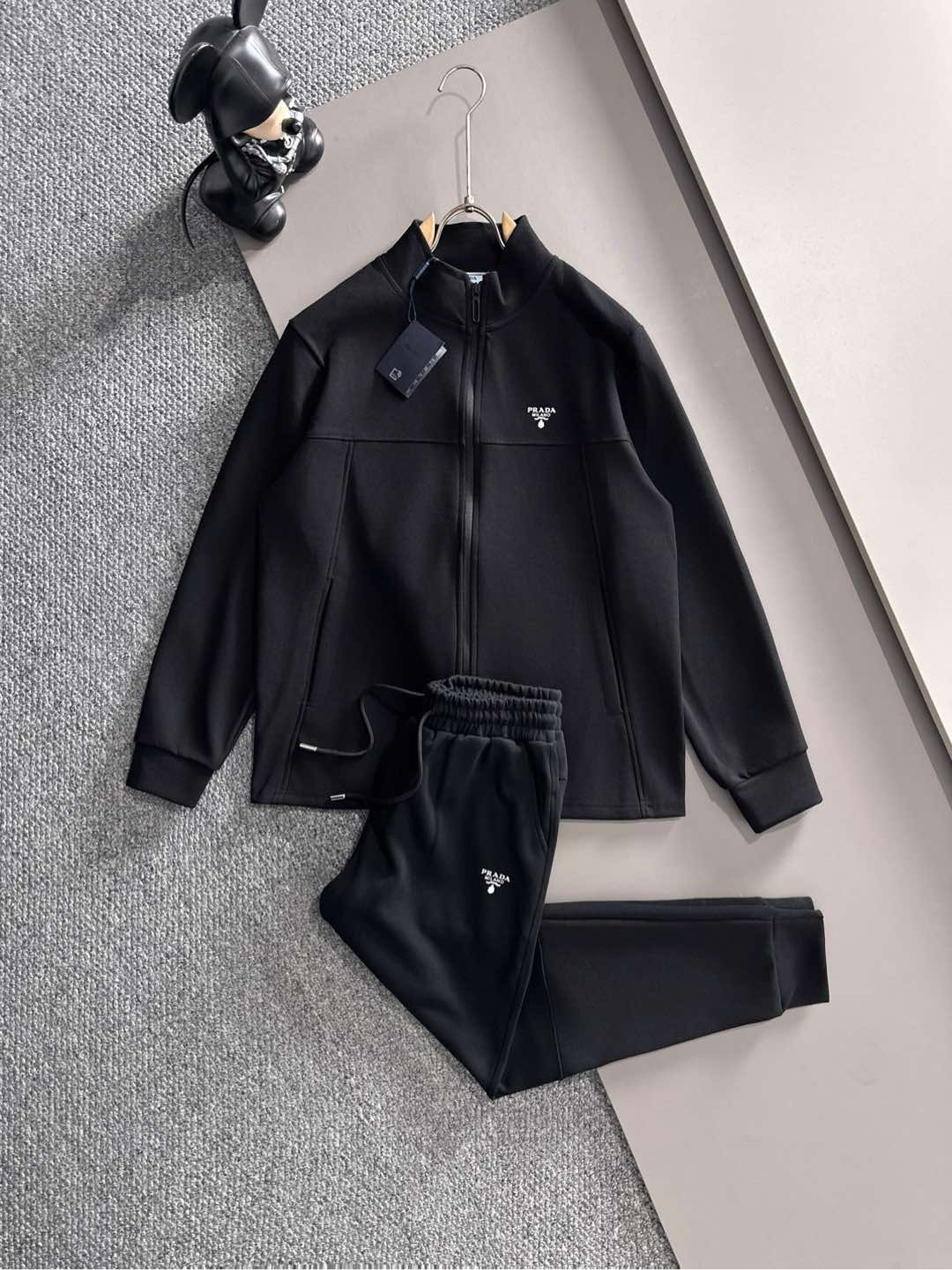 Prada set with拼接splicing, jacquard zipper pants, logo embroidery. Classic black and white tape, custom fabric, 3 tags. Sizes M-3XL. Comfort and style.