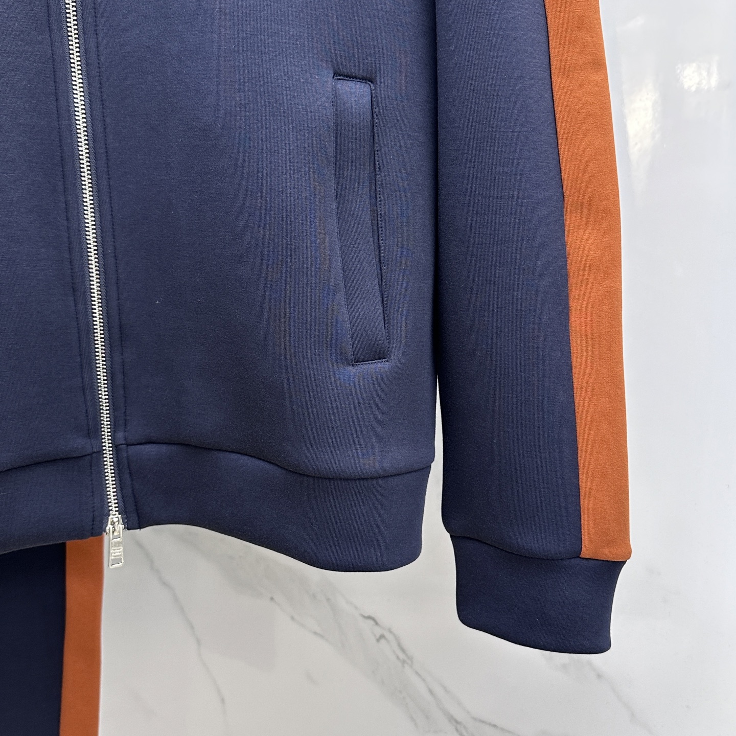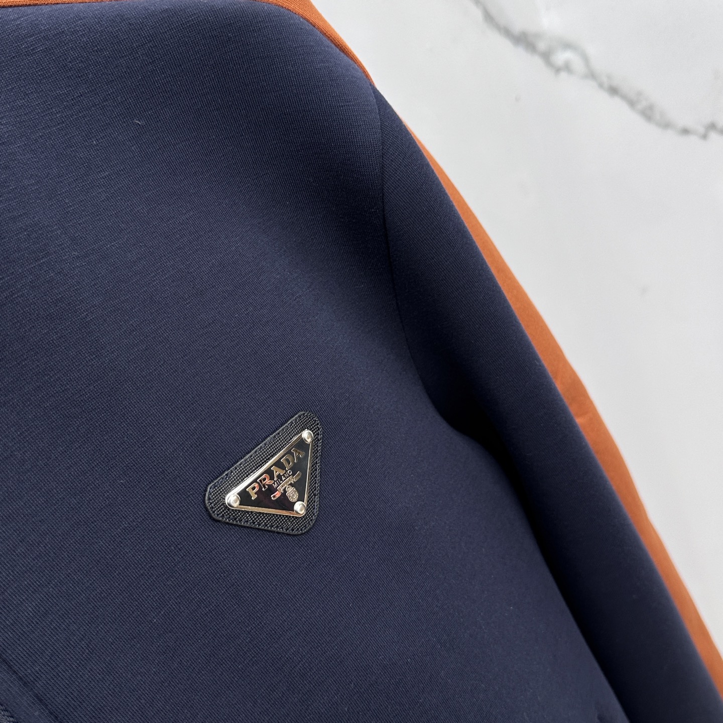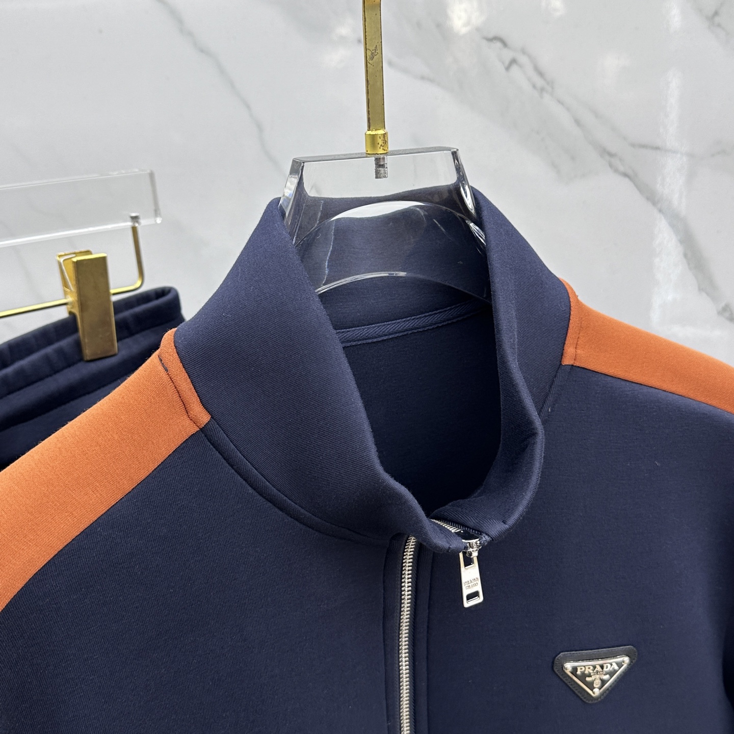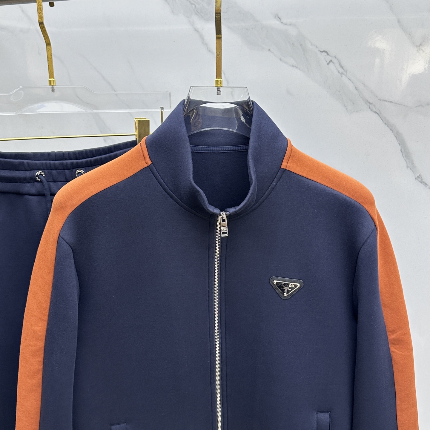 Prada's 2025 Fall/Winter sportswear features elastic fabric, orange-brown stripes, and metal triangle logos. Includes aerospace zippers, hidden drawstrings, and 3D panels. Sizes M-3XL.