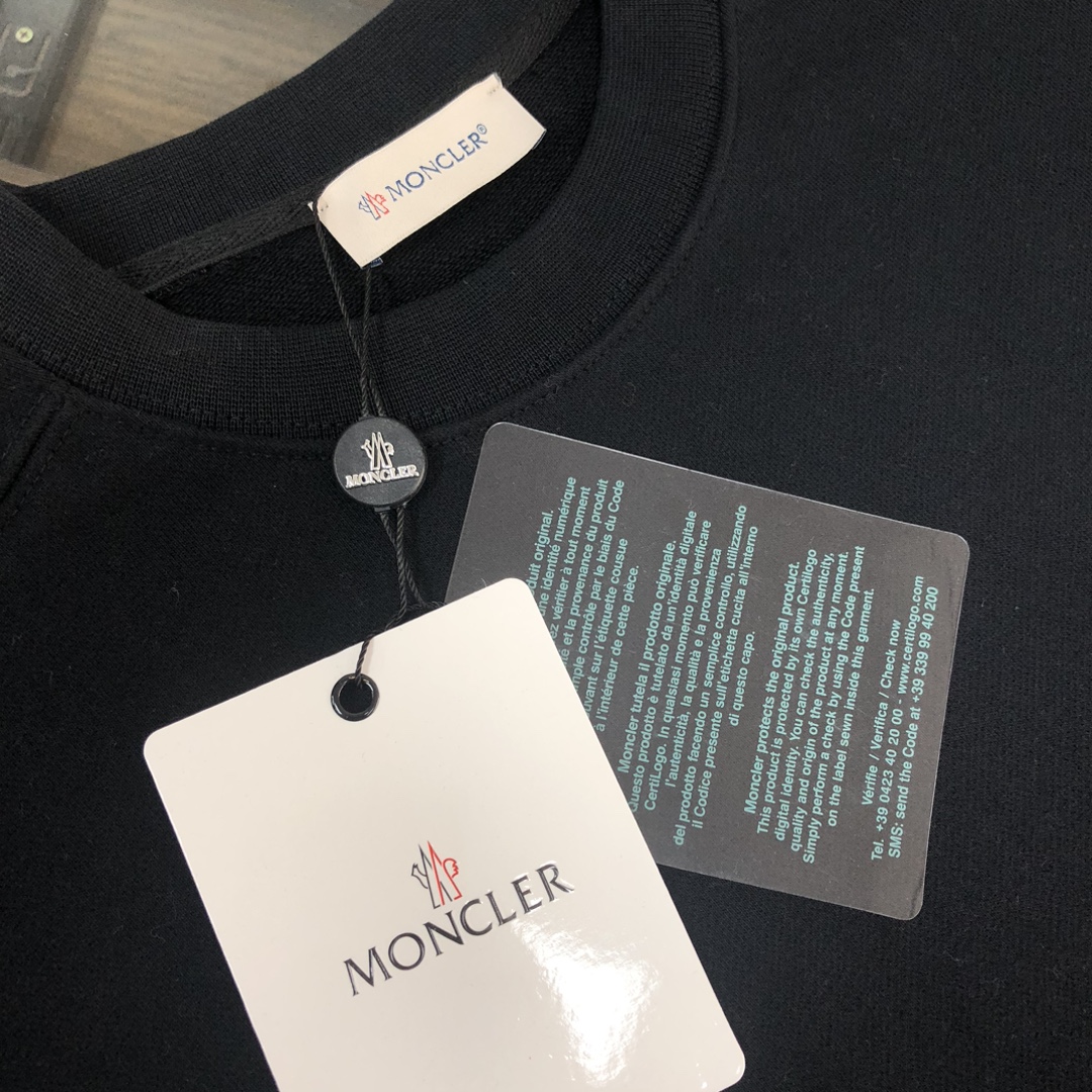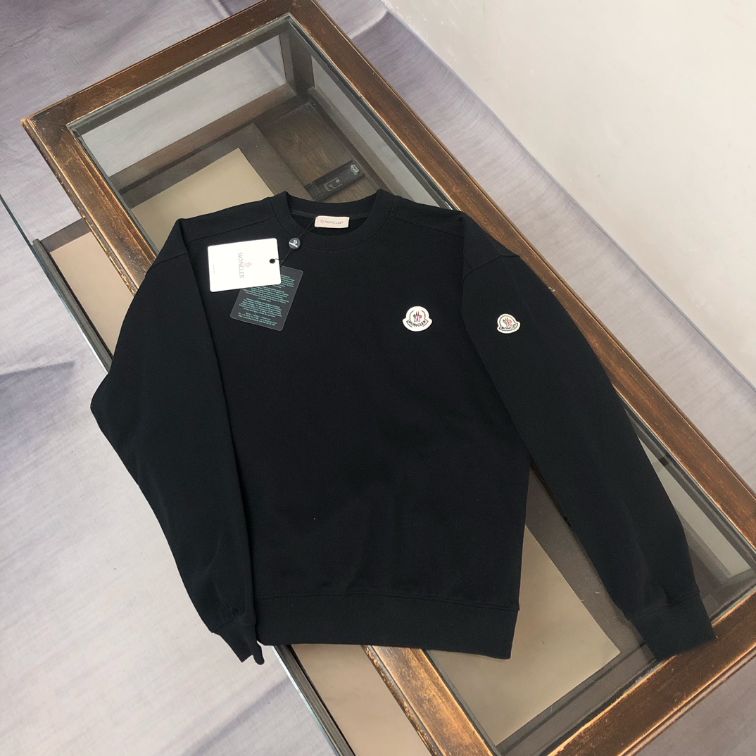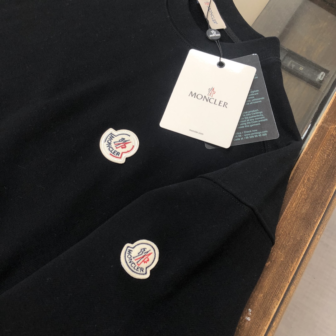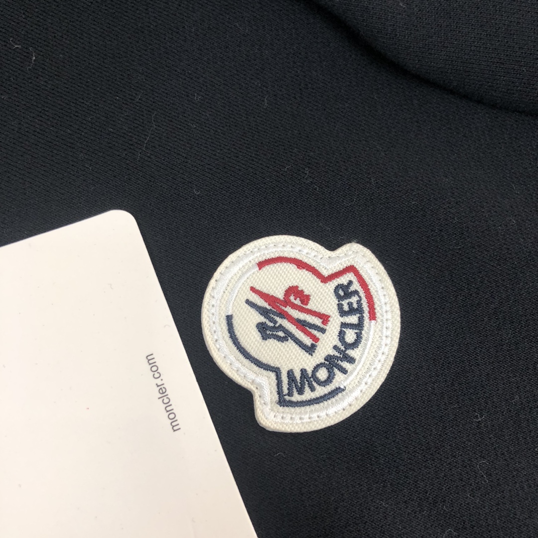 MONCLER 2025 early autumn couples' crewneck & hoodie sweatshirts, sweatpants set. Custom 420g cotton, premium fit. Colors: Black, White, Navy, Gray. Sizes: S-XXL.
