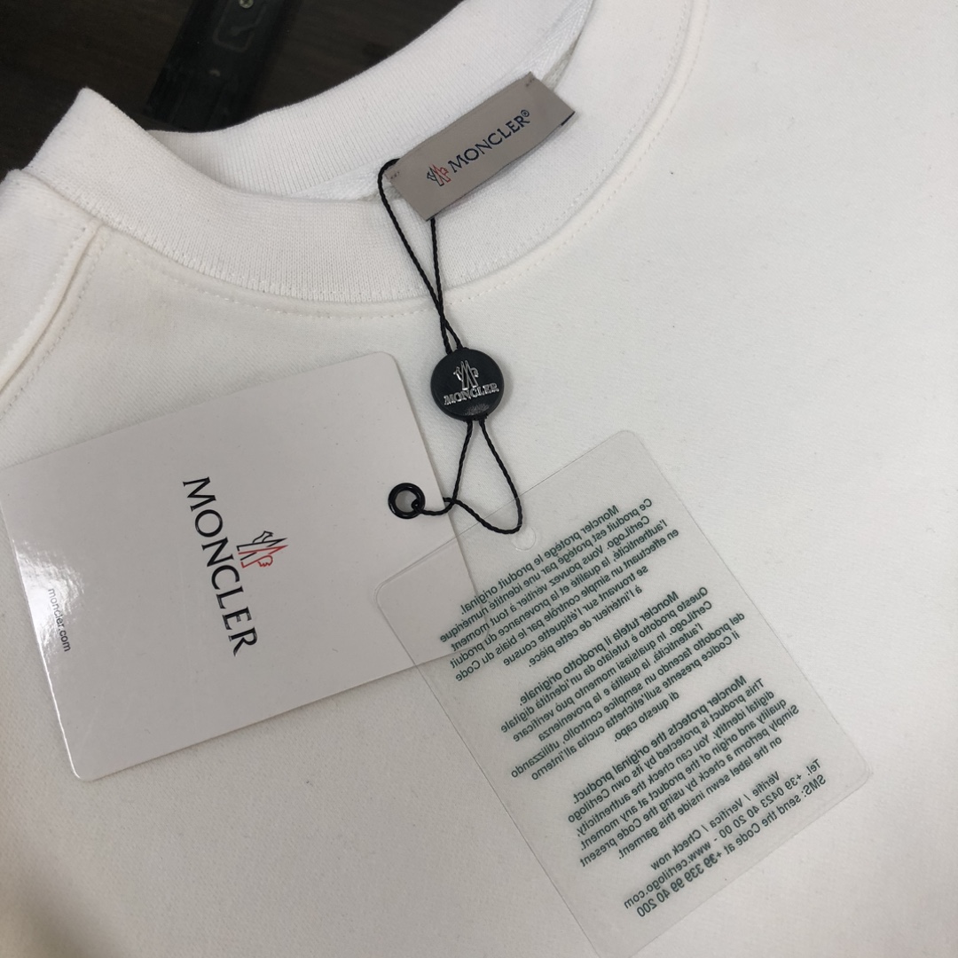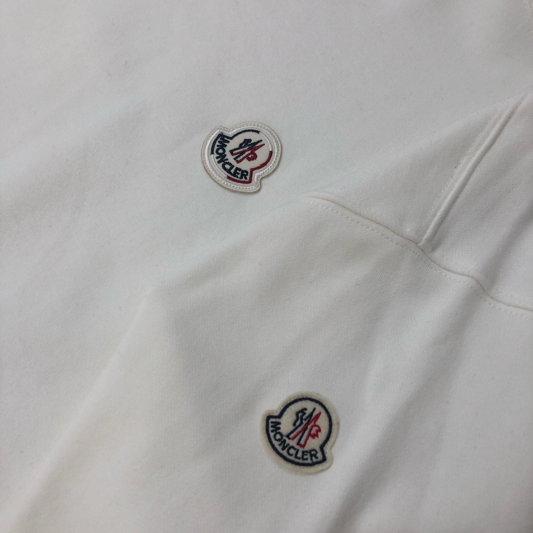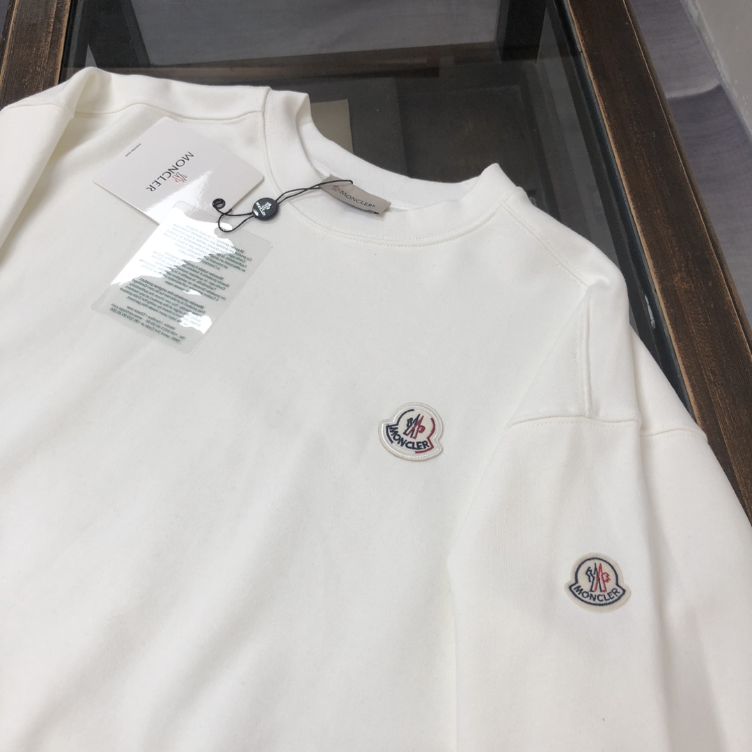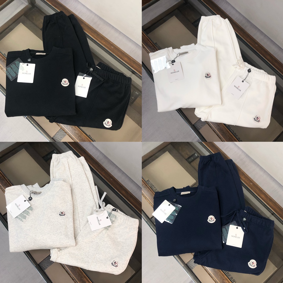 MONCLER 2025 early autumn couples' crewneck sweatshirt & sweatpants set. Custom 420g cotton, breathable. Colors: Black, White, Navy, Gray. Sizes: S-XXL.