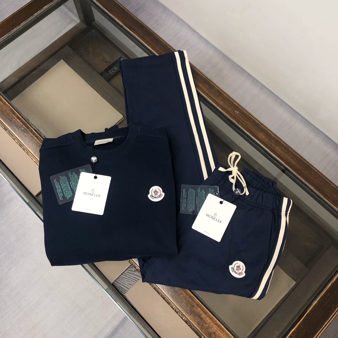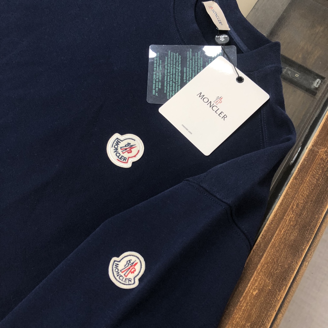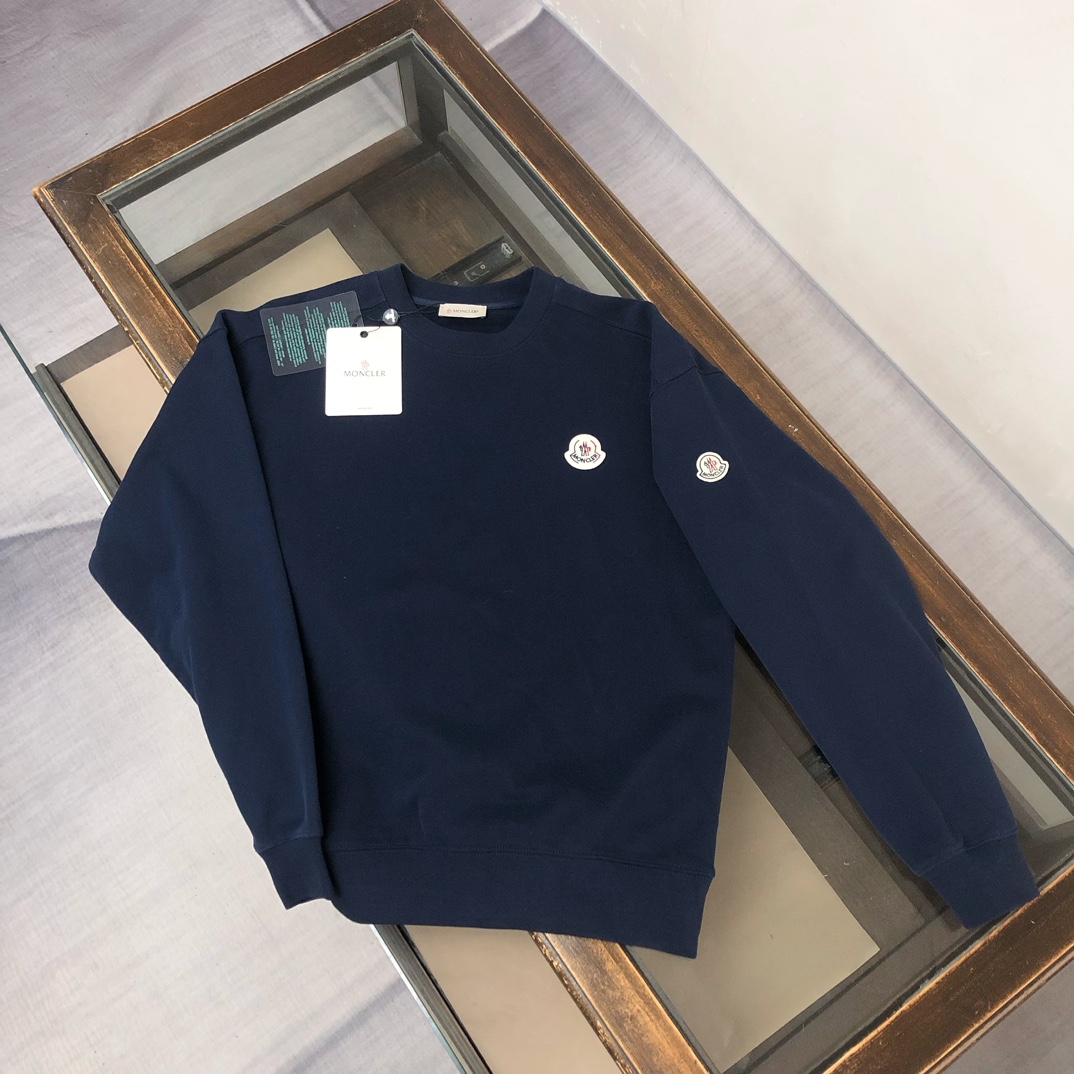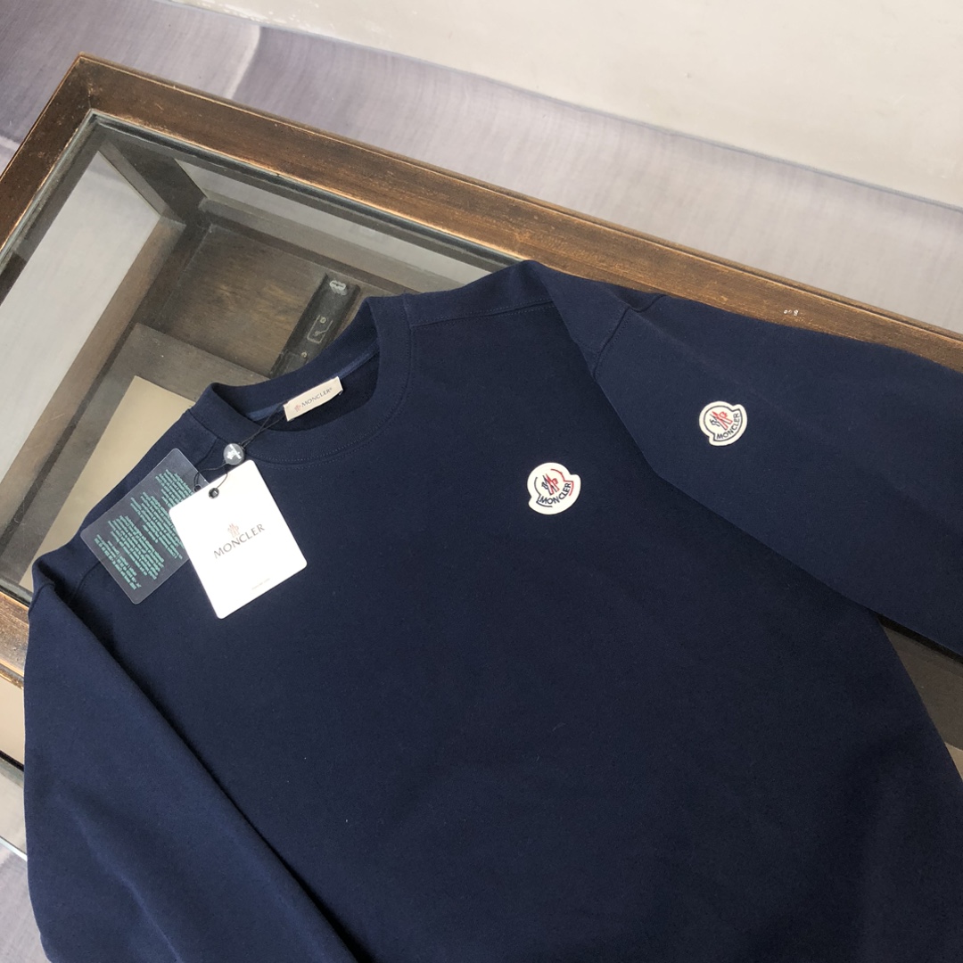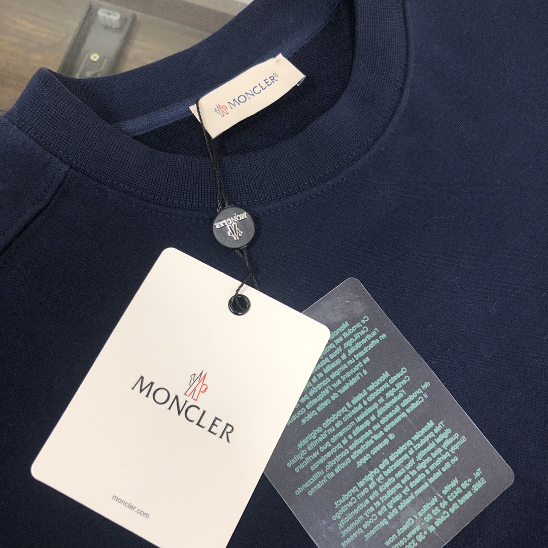 MONCLER 2025 early autumn couples' crewneck sweatshirts, sweatpants, straight-leg & tapered pants. Custom 420g washed cotton, breathable, premium quality. Colors: Black, White, Navy, Gray. Sizes: S-XXL.