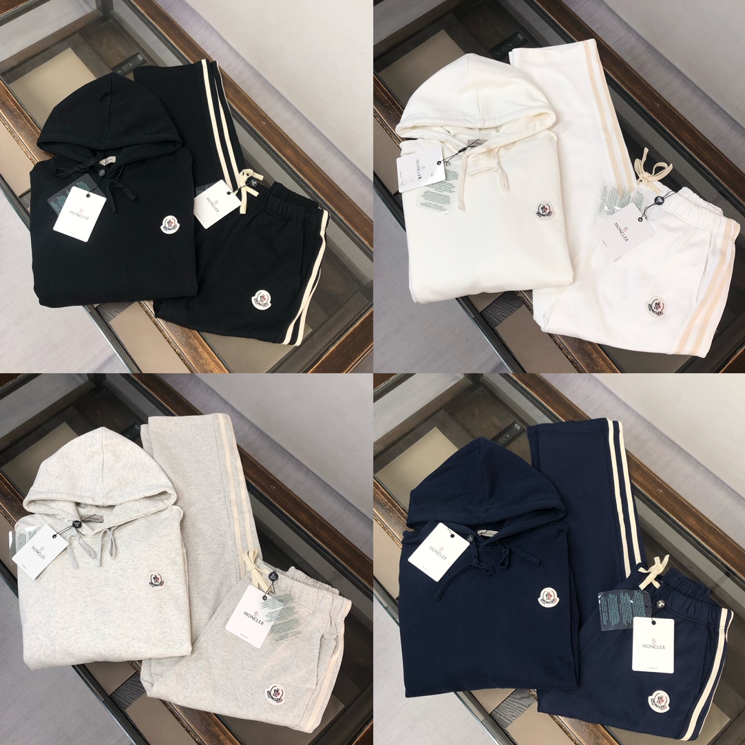 Moncler 2025 early autumn hoodie & sweatpants set. Custom 420g cotton, breathable. Colors: black, white, blue, gray. Sizes: S to XXL.