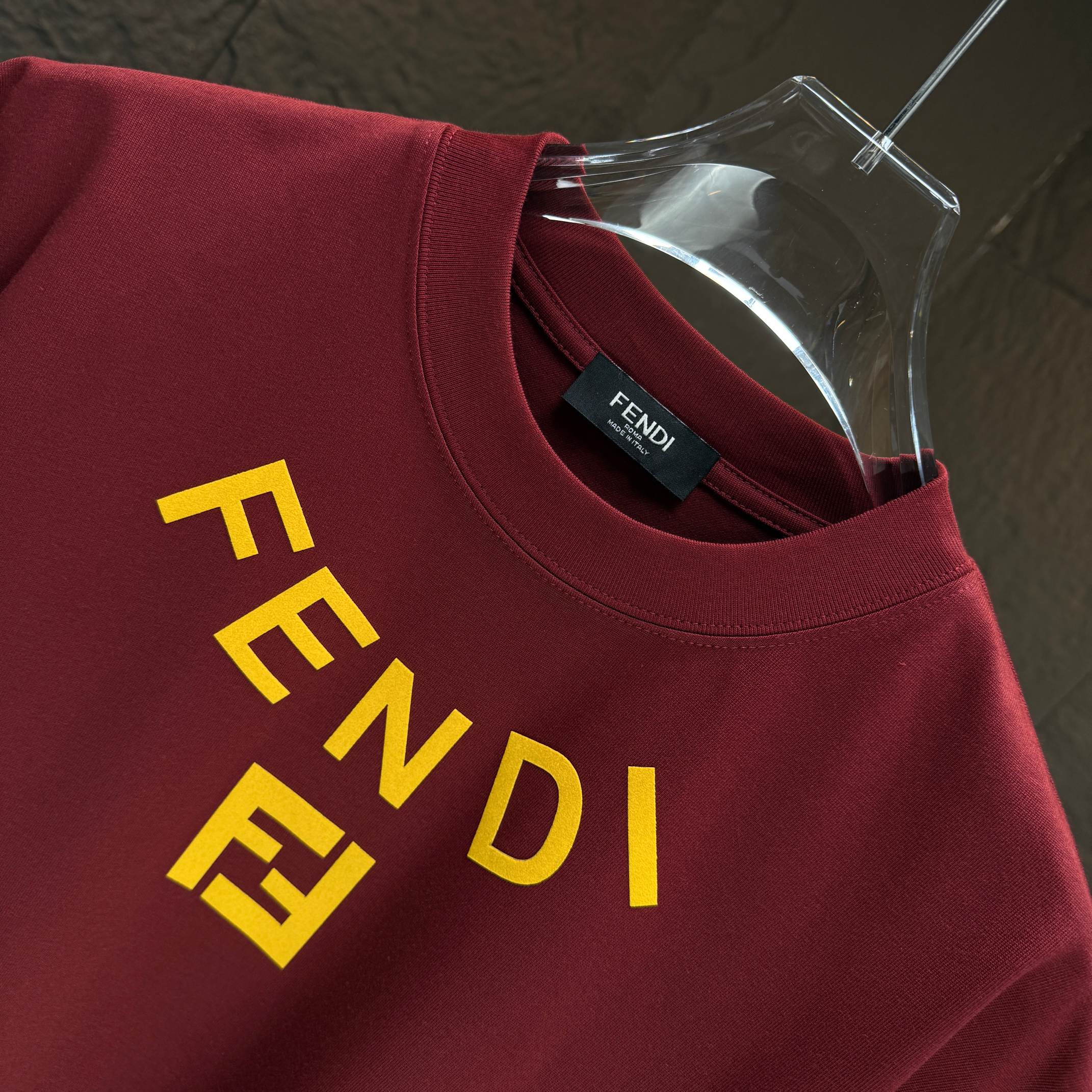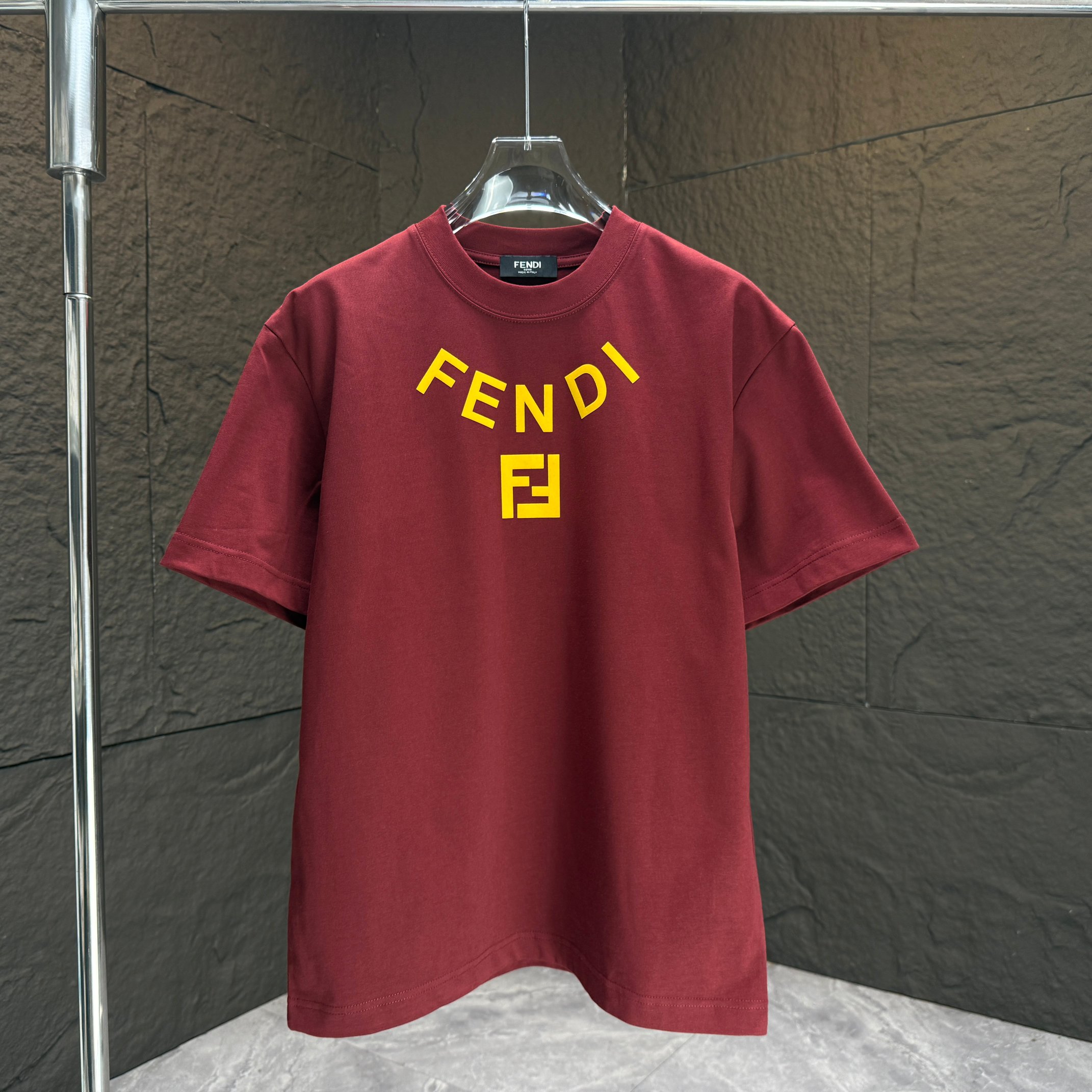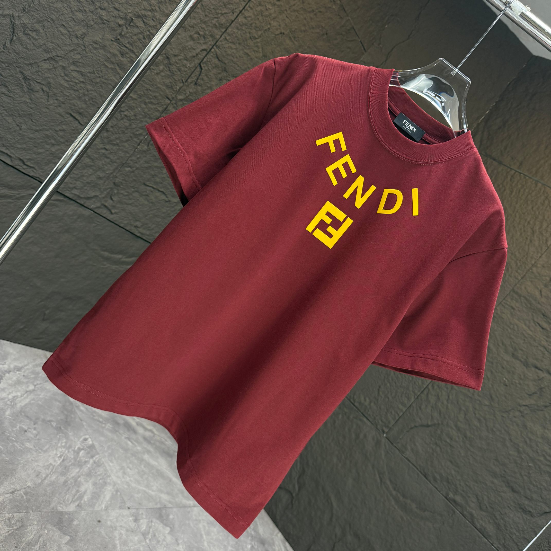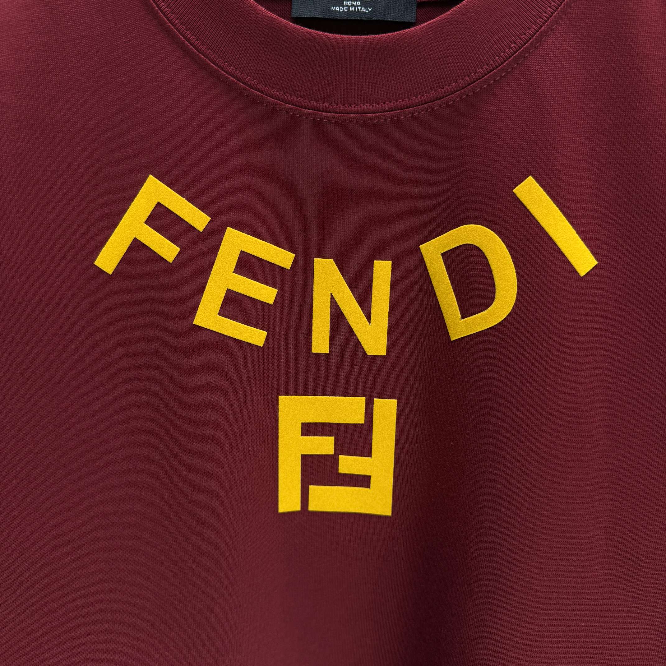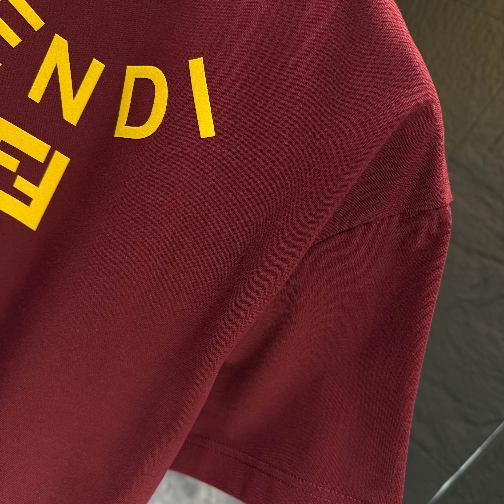 Home • Apparel • FENDI 2025 Fall Winter New Short Sleeve T-shirt, Custom Cotton Logo Flocking. Colors: Black, White, Anchora Red, Night Blue. Sizes: S, M, L, XL, XXL.