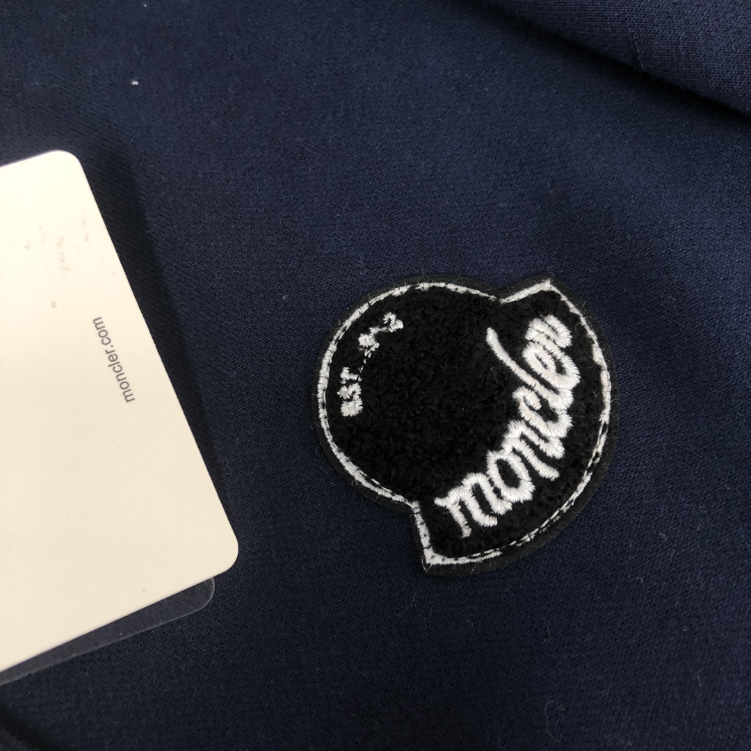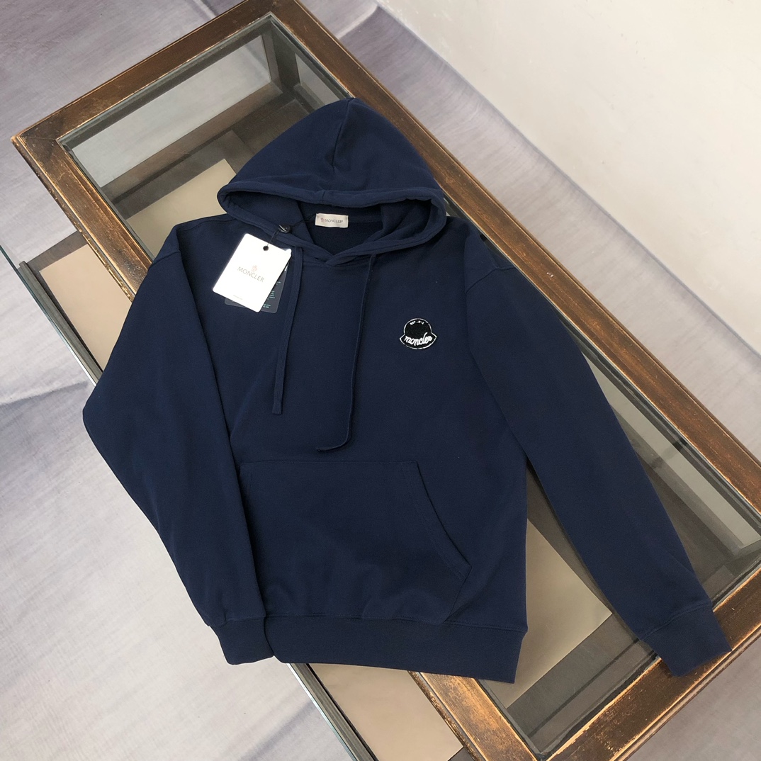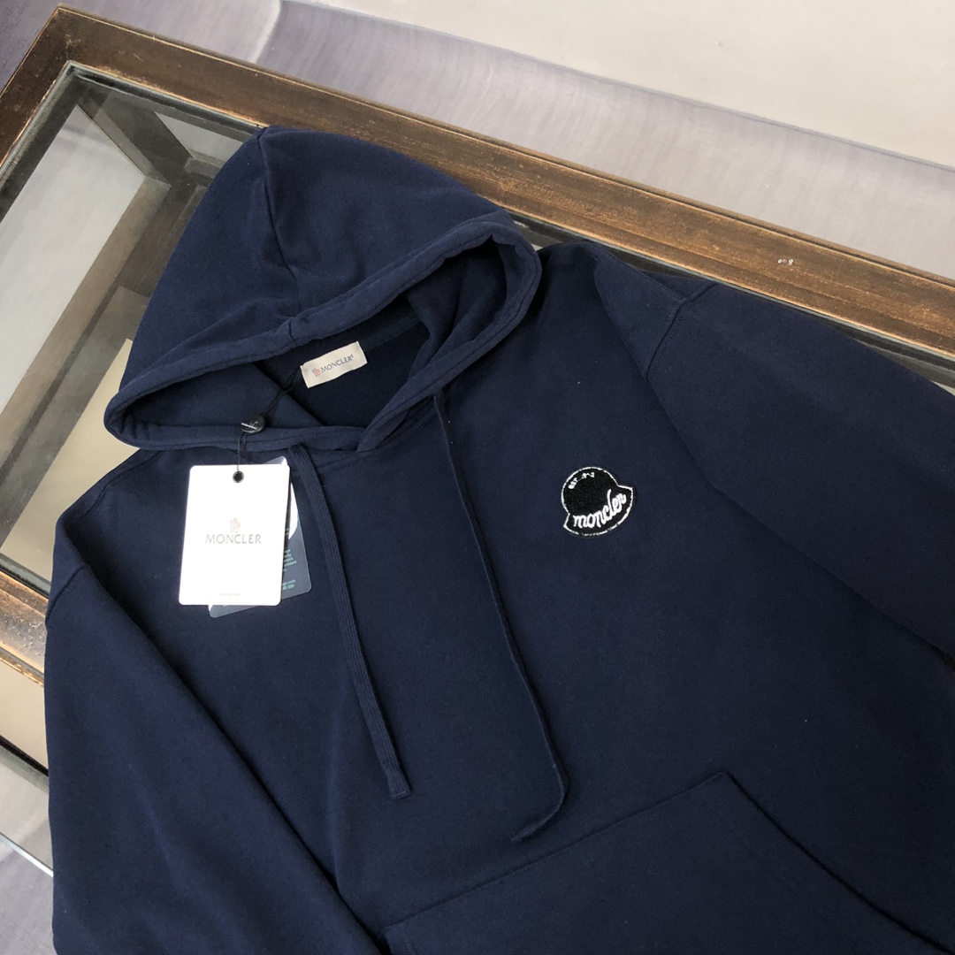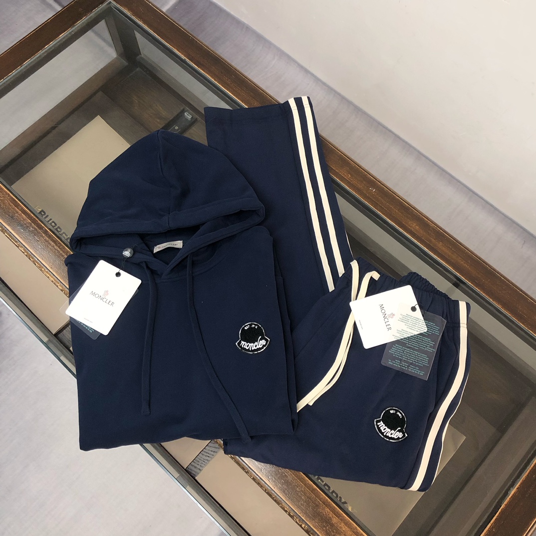 MONCLER 2025 early autumn unisex hoodie & sweatpants set. Custom 420g cotton, breathable fabric. Colors: Black, White, Navy, Gray. Sizes: S-XXL.