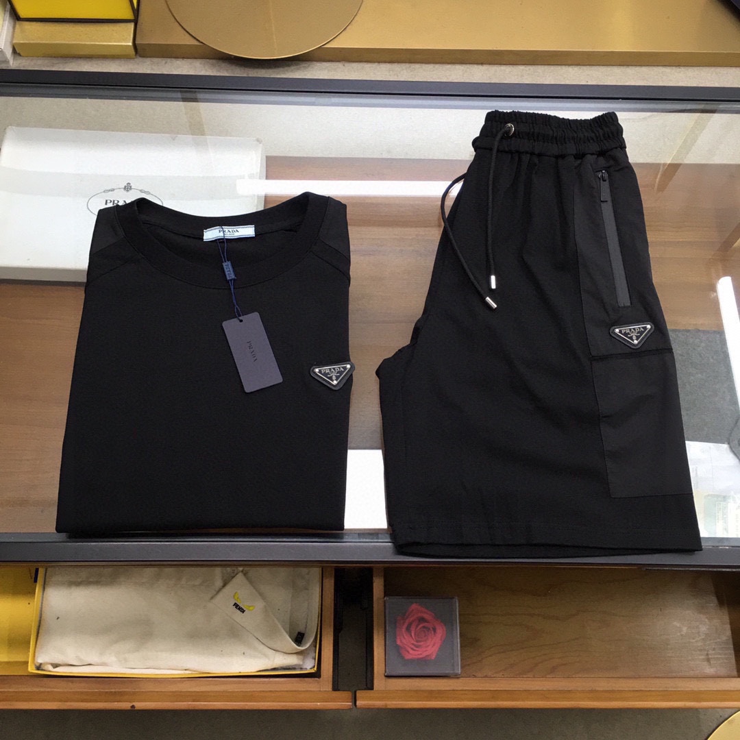 PRADA cotton T-shirt and shorts set. Breathable fabric with classic logo. Sizes M-3XL.