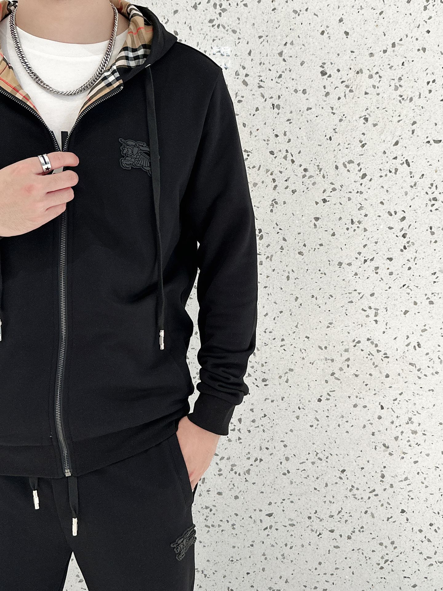 Burberry秋冬新款连帽拉链卫衣套装,丝光棉面料,男女同款。修身剪裁,尺码48-56。