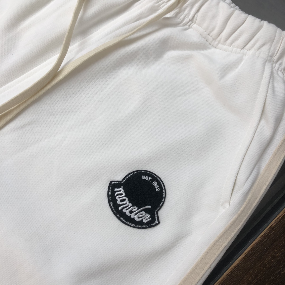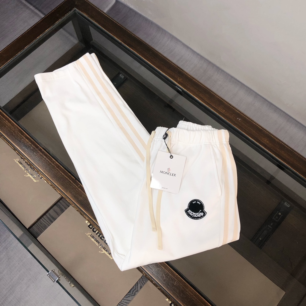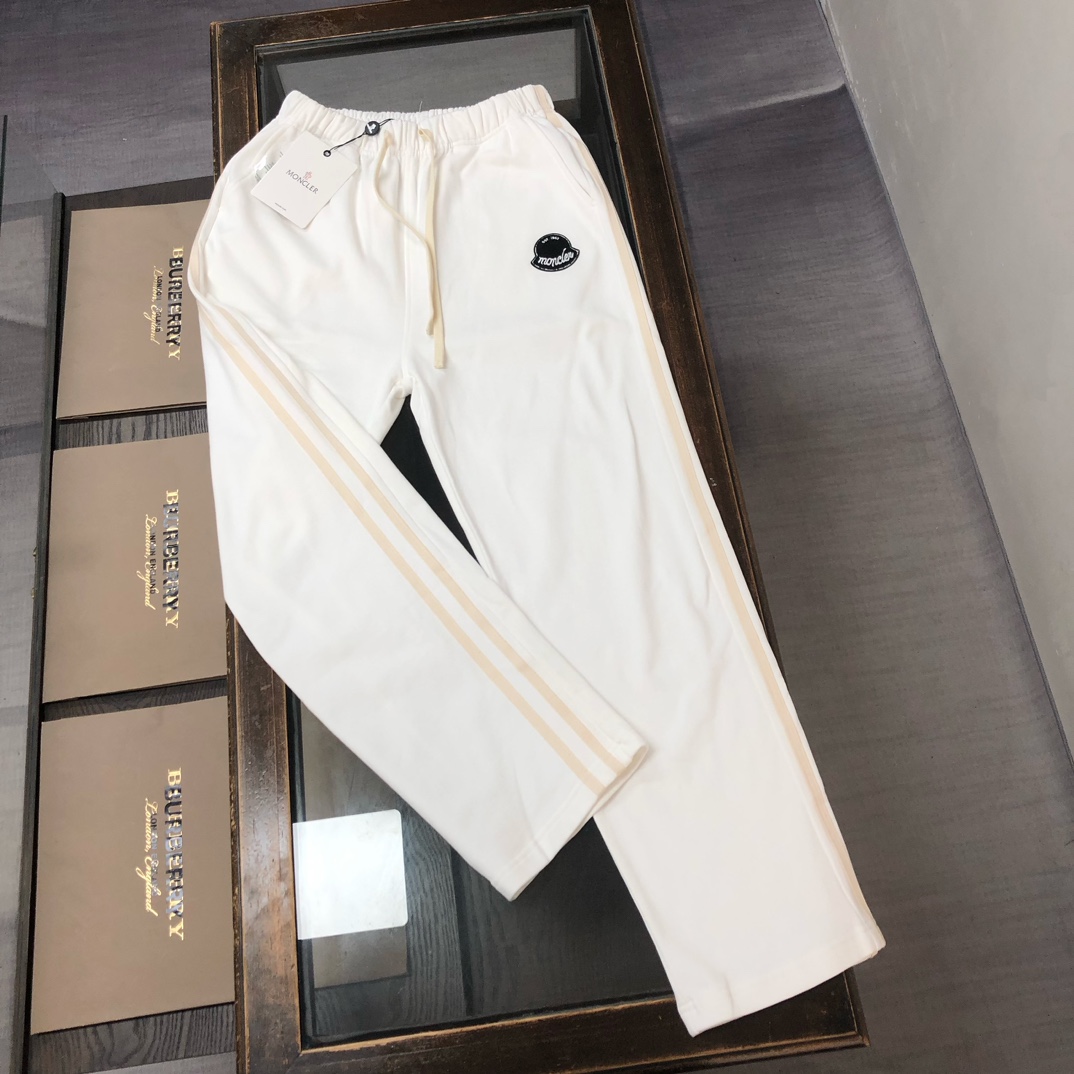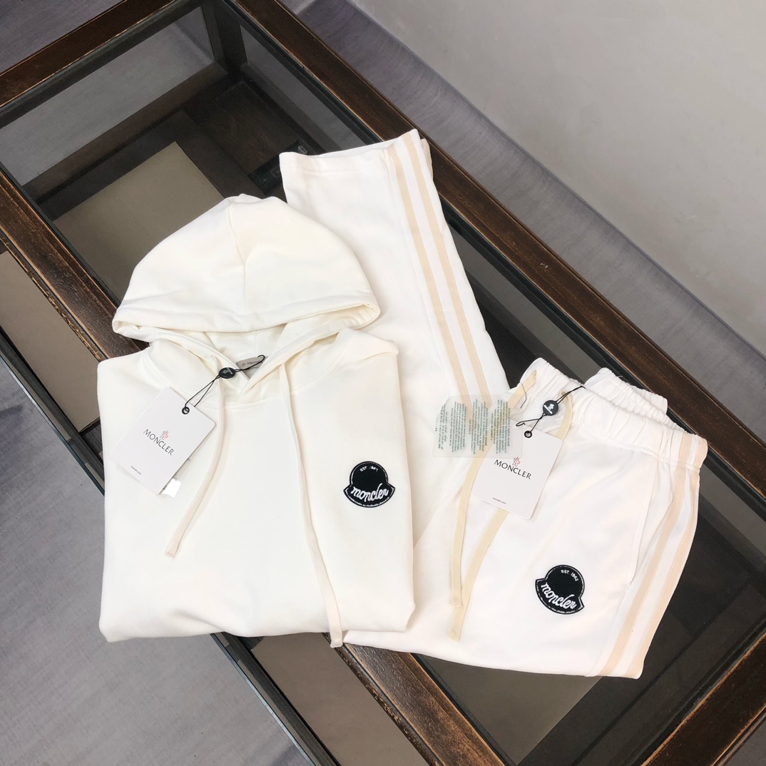 MONCLER 2025 early autumn couples hoodie & straight-leg pants set. Custom 420g cotton, breathable. Colors: Black, White, Navy, Gray. Sizes: S-XXL.