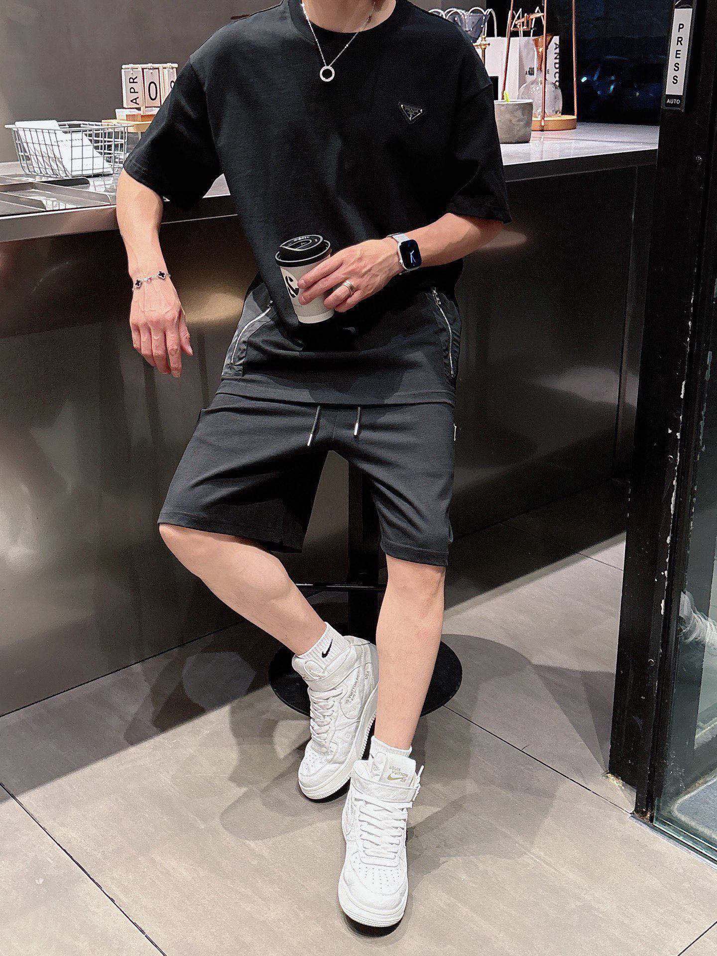 PRADA cotton T-shirt and shorts set. Breathable fabric with classic logo. Sizes M-3XL.