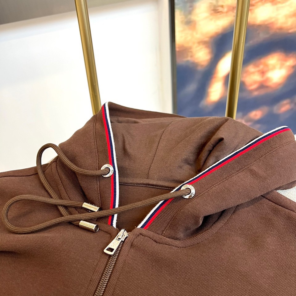 Moncler 2025秋冬运动套装。连帽带红白条纹,舒适透气面料。抽绳腰与束脚设计,防风时尚。多场景穿着,慵懒与利落兼具。