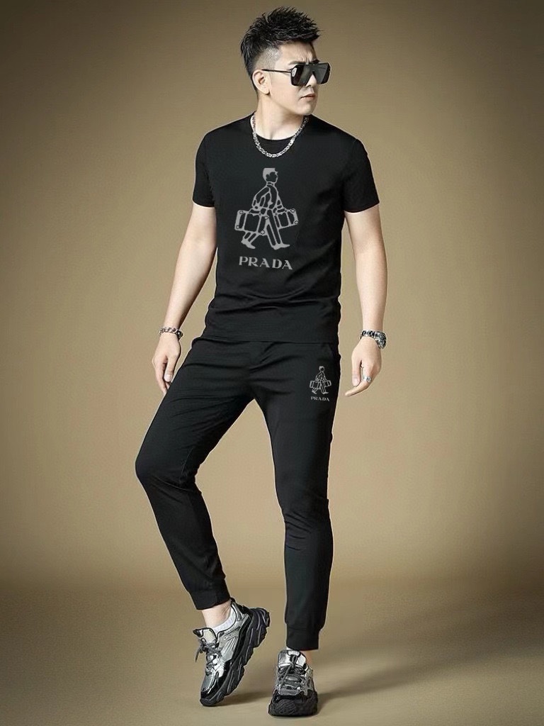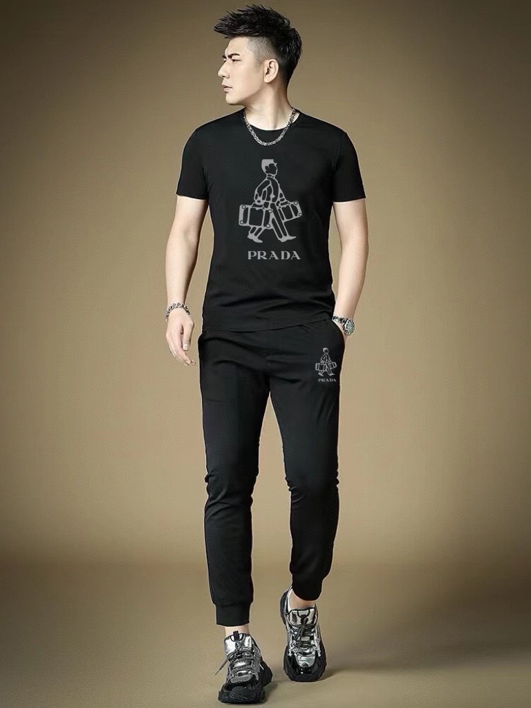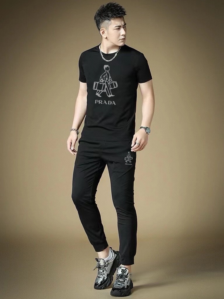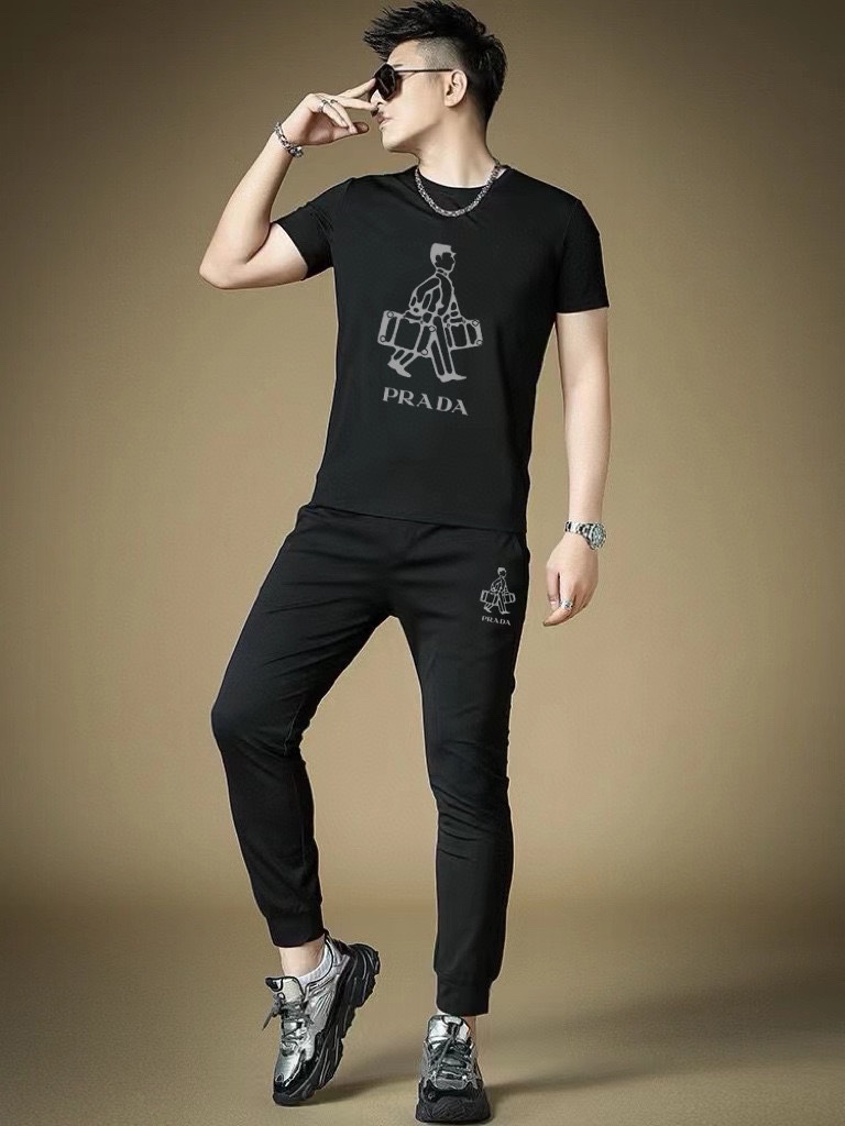 Prada men's summer high-quality dual-gloss set. Imported fabric, trendy, versatile. Sizes M-5XL (up to 220 lbs).