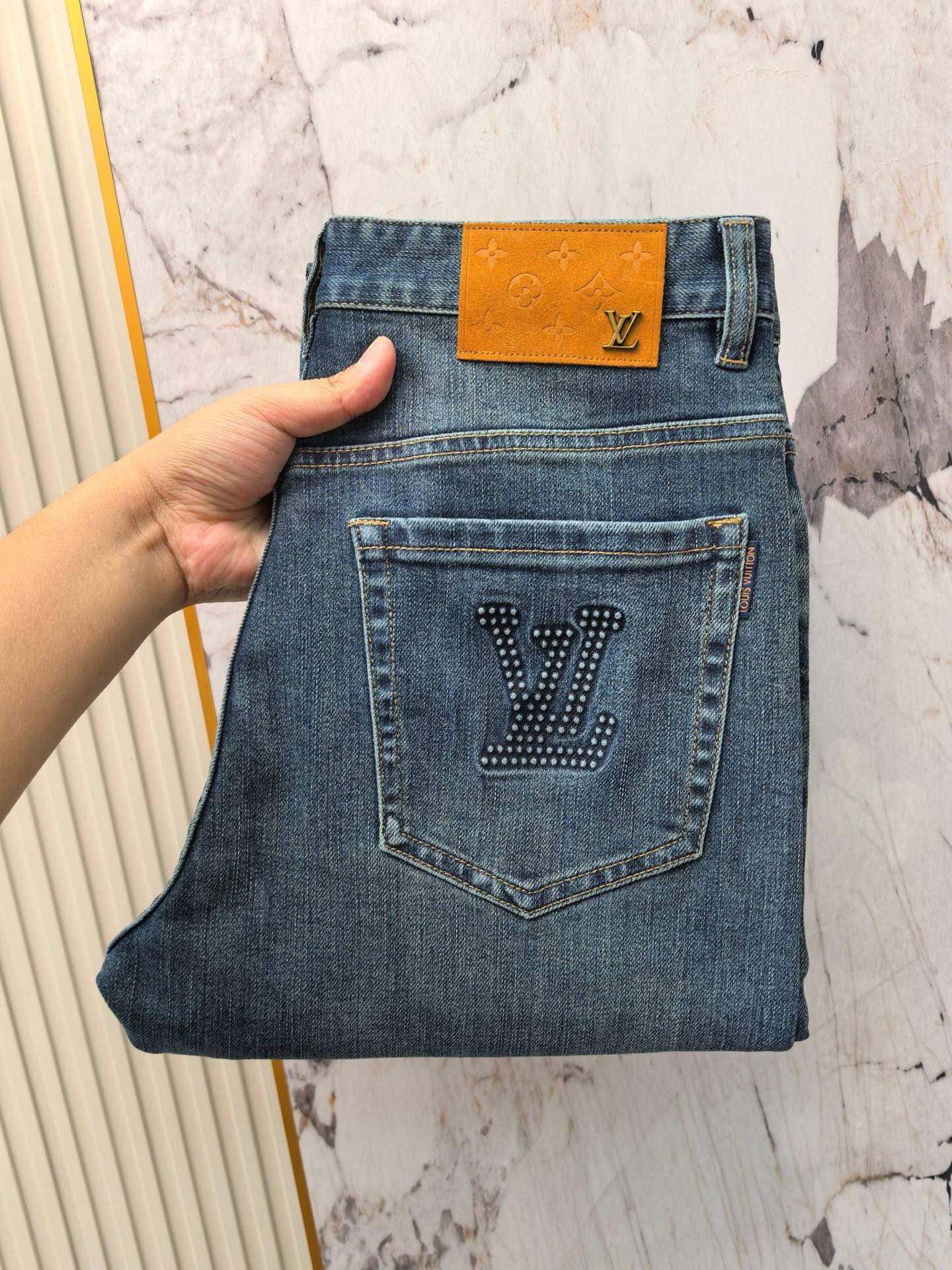 LV 2025 early autumn men's jeans. Heavy wash denim, custom soft fabric. Double washing process, comfortable, breathable. Branded hardware. Sizes 29-40.