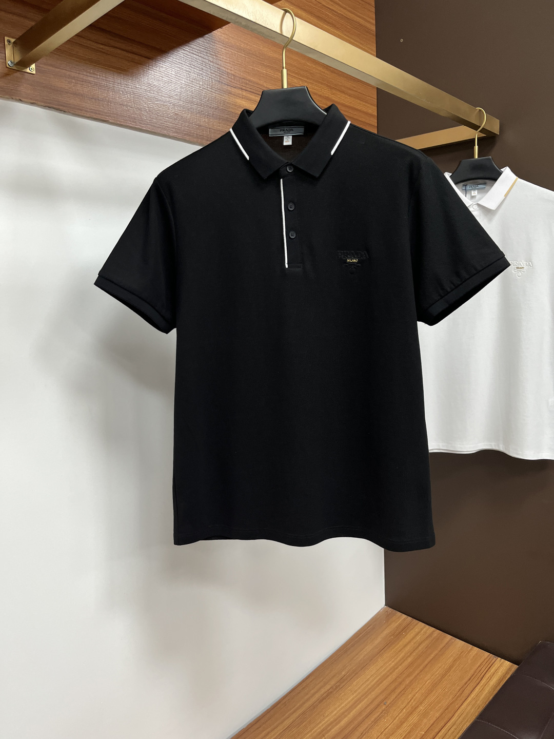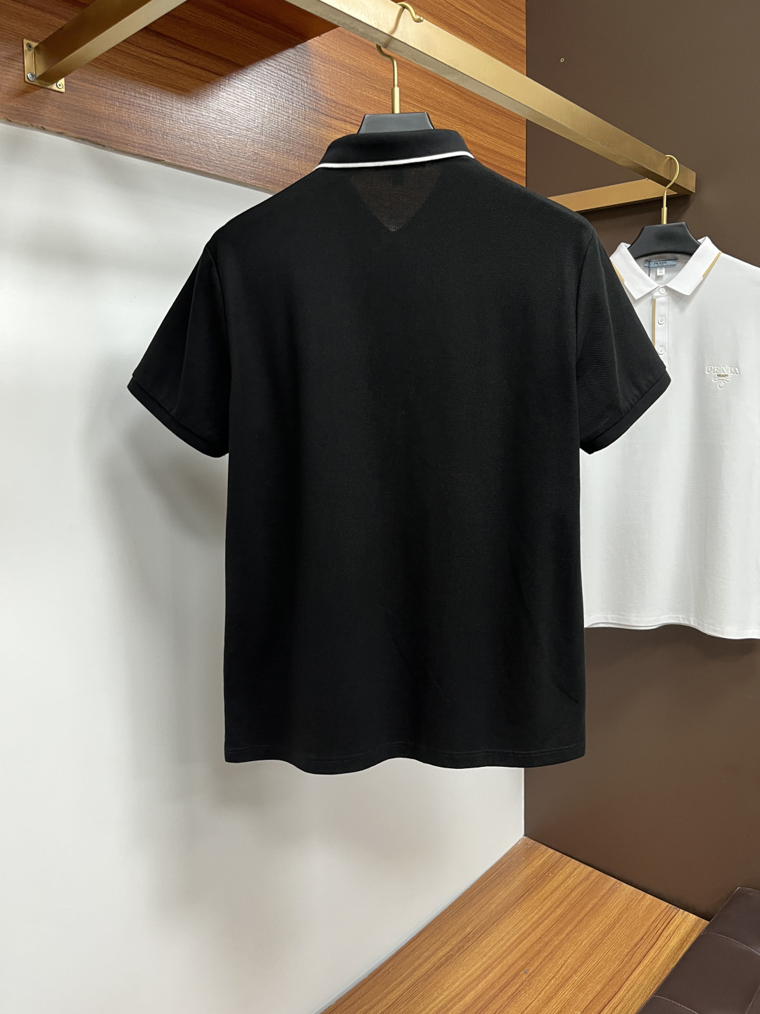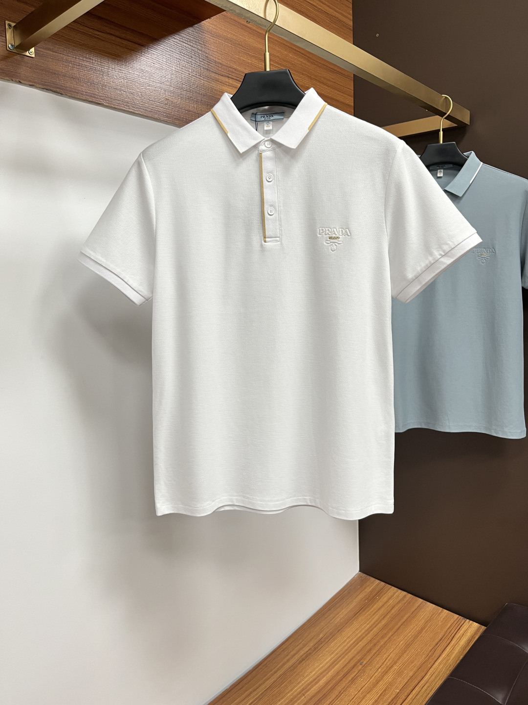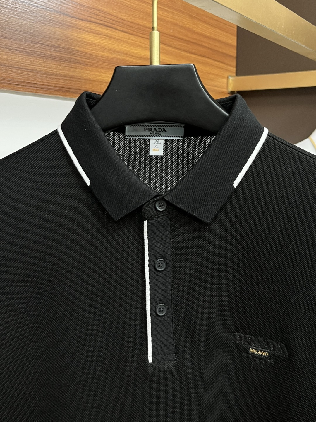 Prada 2025 Spring Summer Polo collar design, clean lines, brand logo on chest. Soft, breathable fabric. Versatile for business or casual wear. Sizes M-3XL.