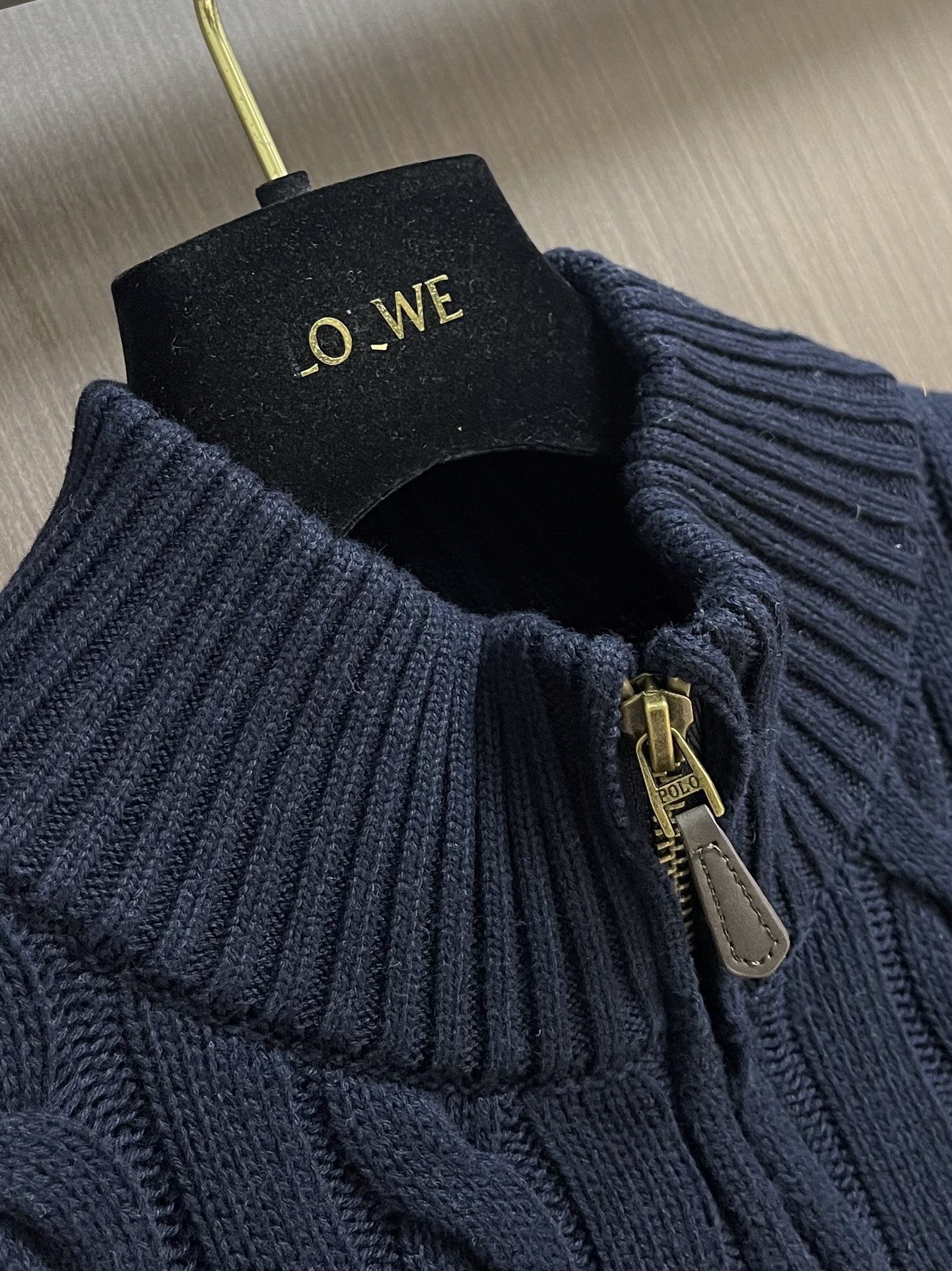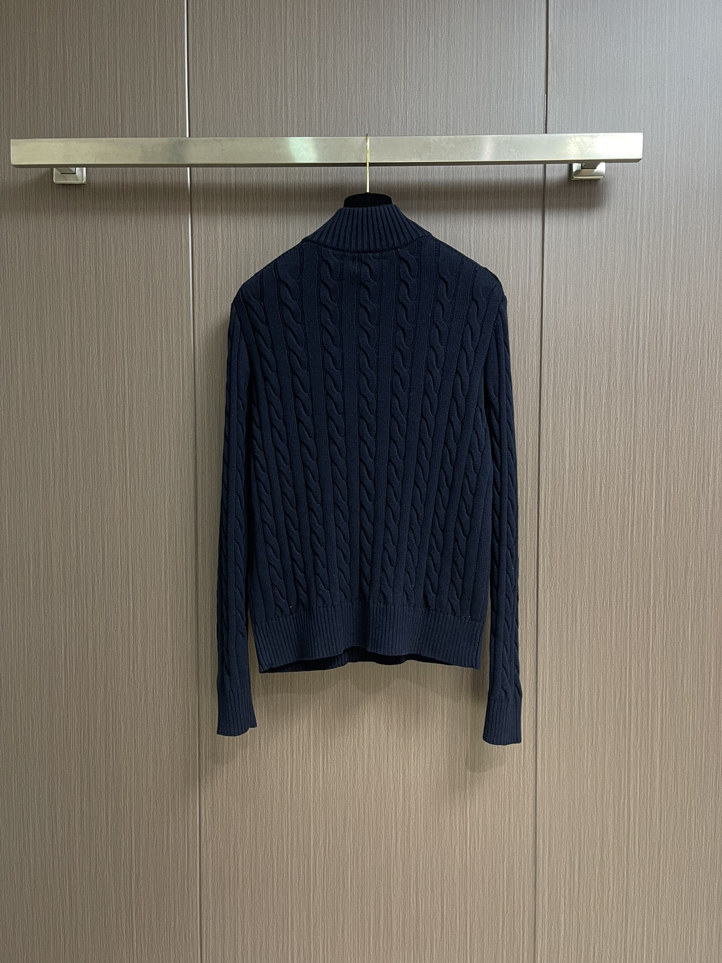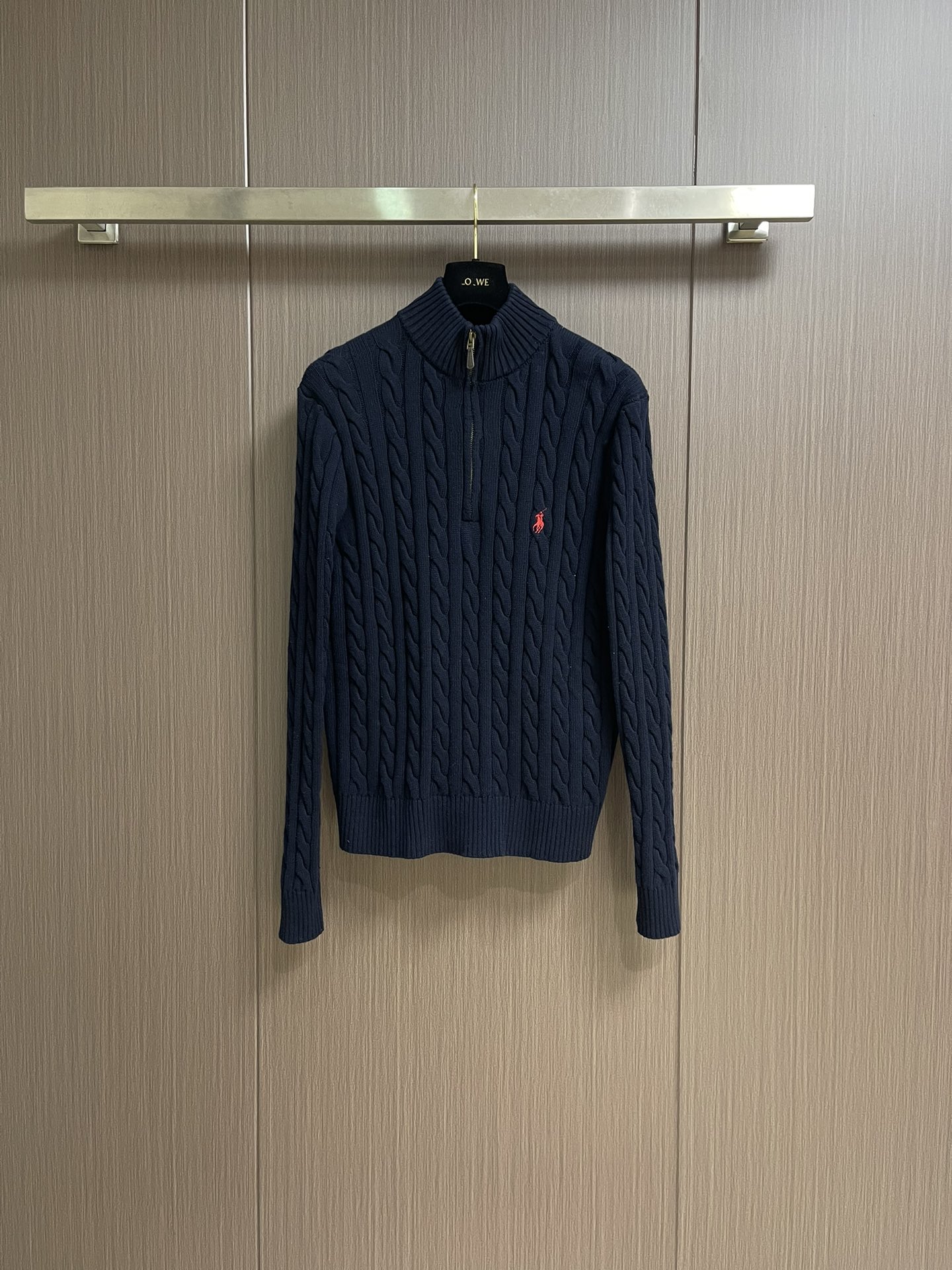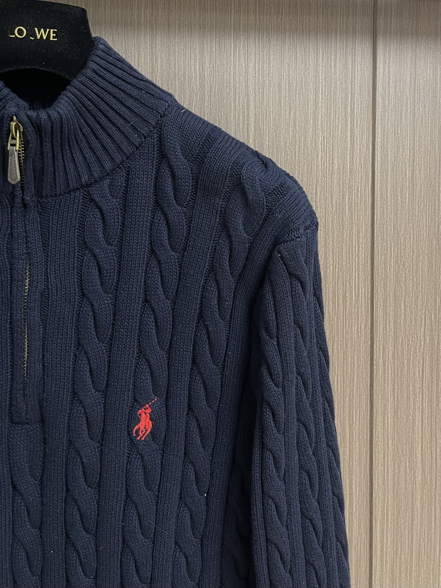 Ralph Lauren cable knit half-zip sweater. Made of thick woven cotton with细腻纹理. Classic cable design, precise arrangement. Small pony emblem. Semi-high zip collar, elegant style. Sizes: S-XL.