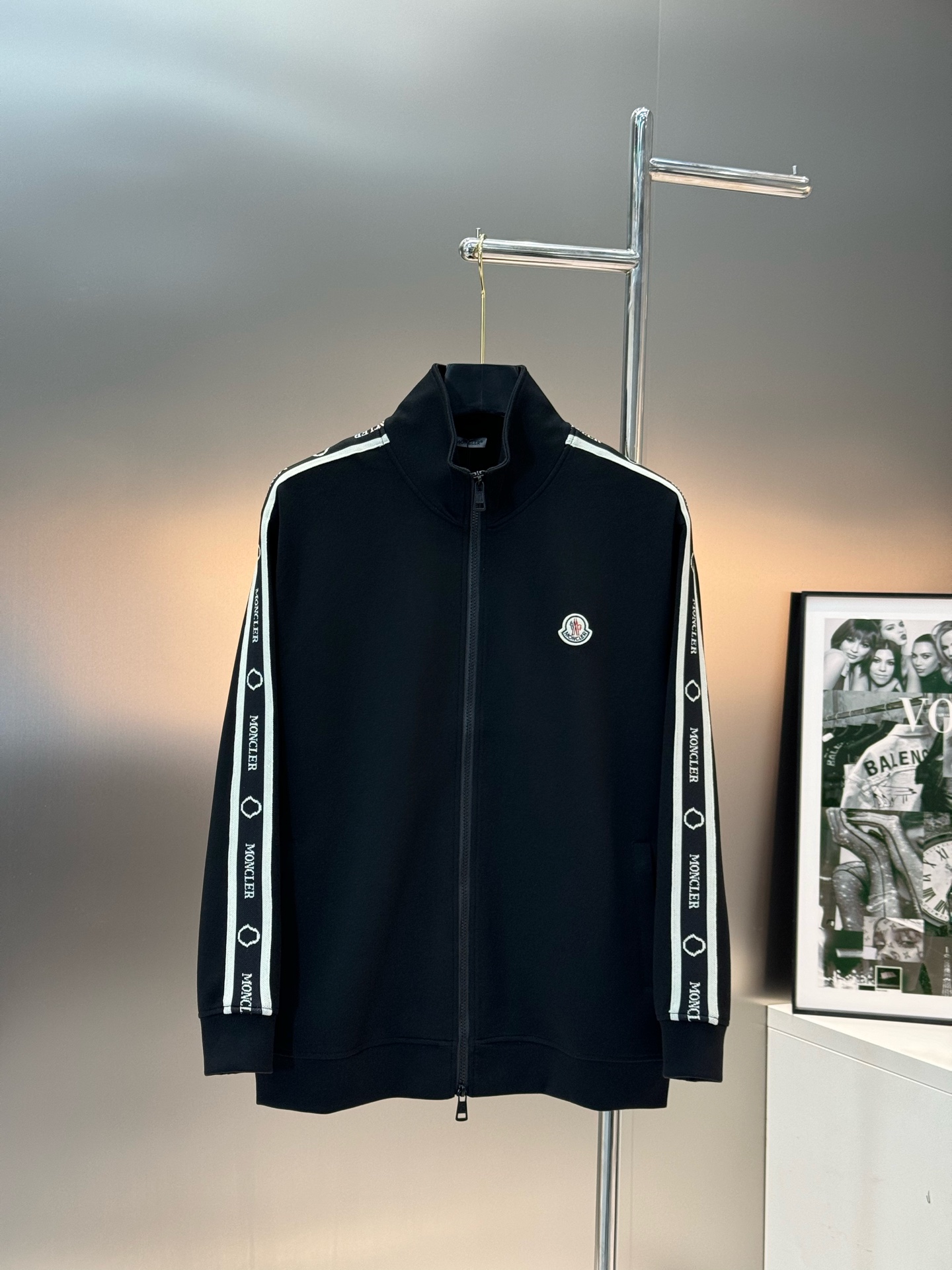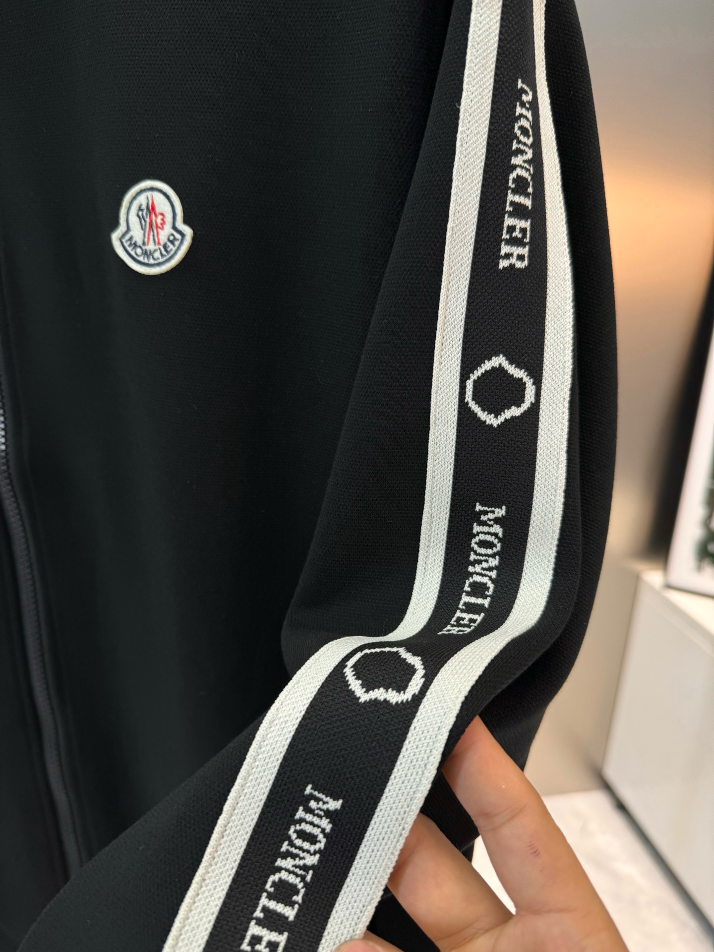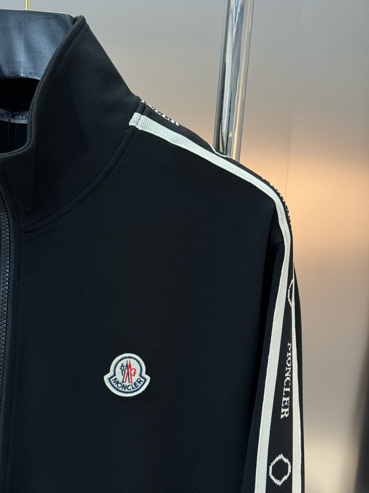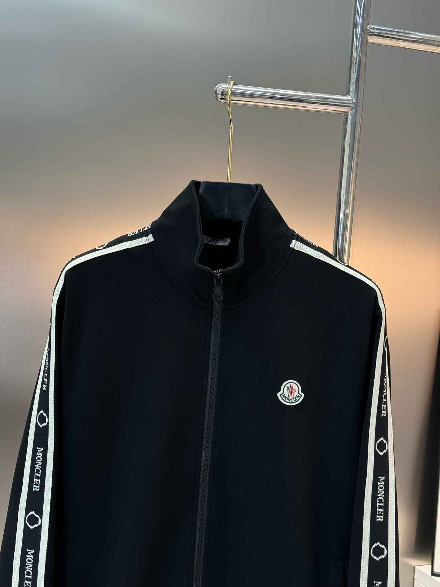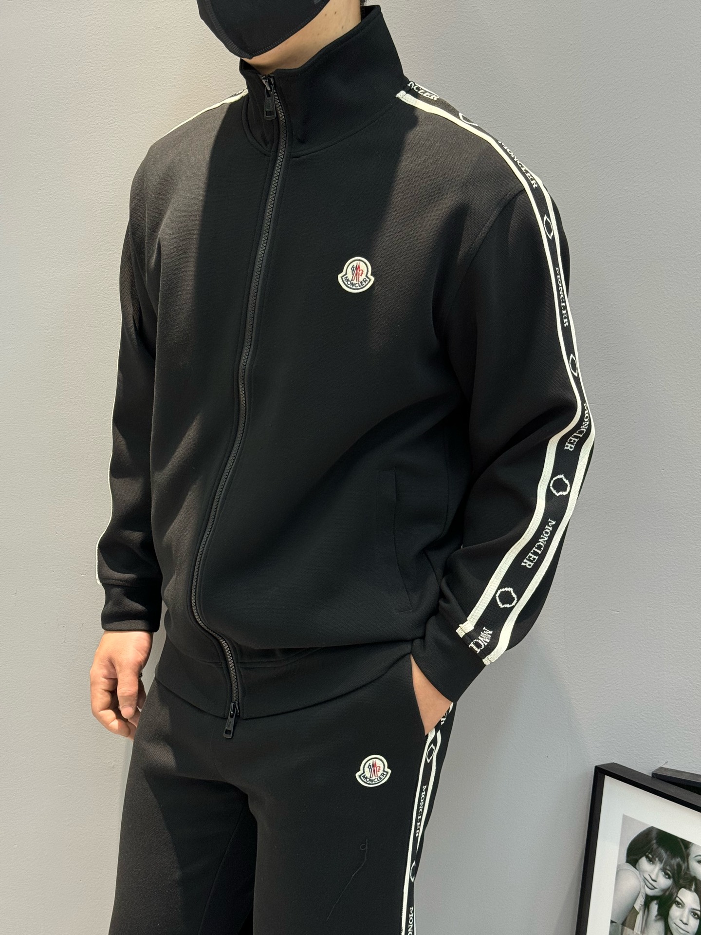 Moncler 2024 sports set: unisex, retro style, stripe accents, straight cut, embroidered logo, 100% lyocell. Colors: black, white, brown. Sizes: M-3XL.