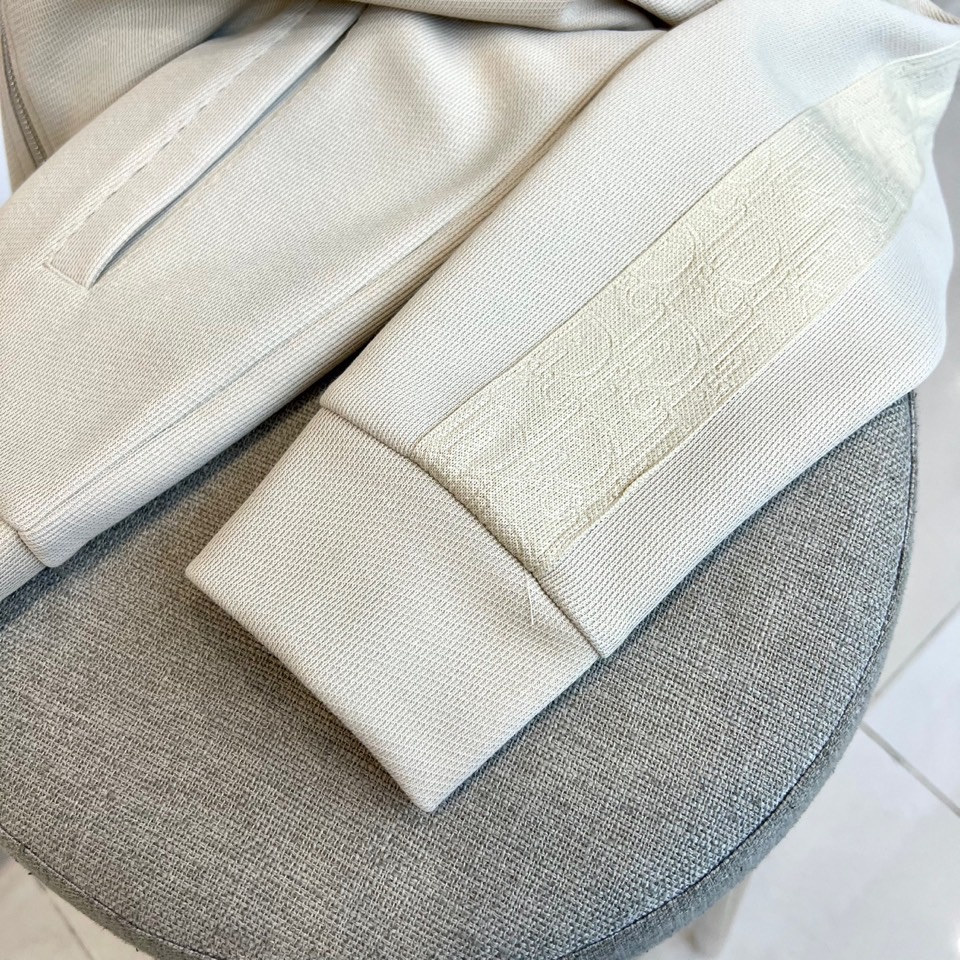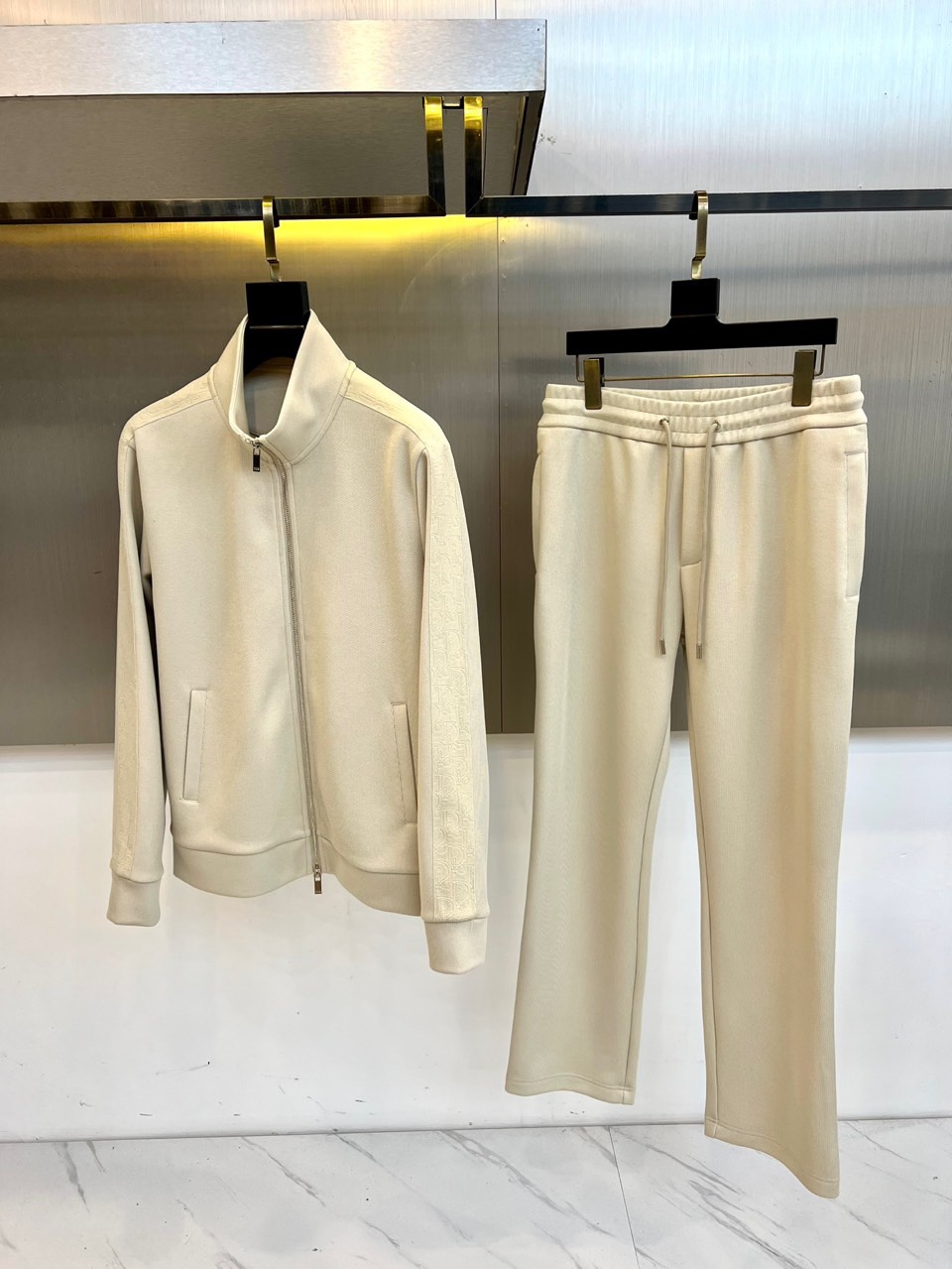 Dior Men's 2025 Fall/Winter athletic series. Matte stretch fabric, structured suit with gray tech panels. Stand collar jacket, trousers with side pockets. Versatile for urban elites.