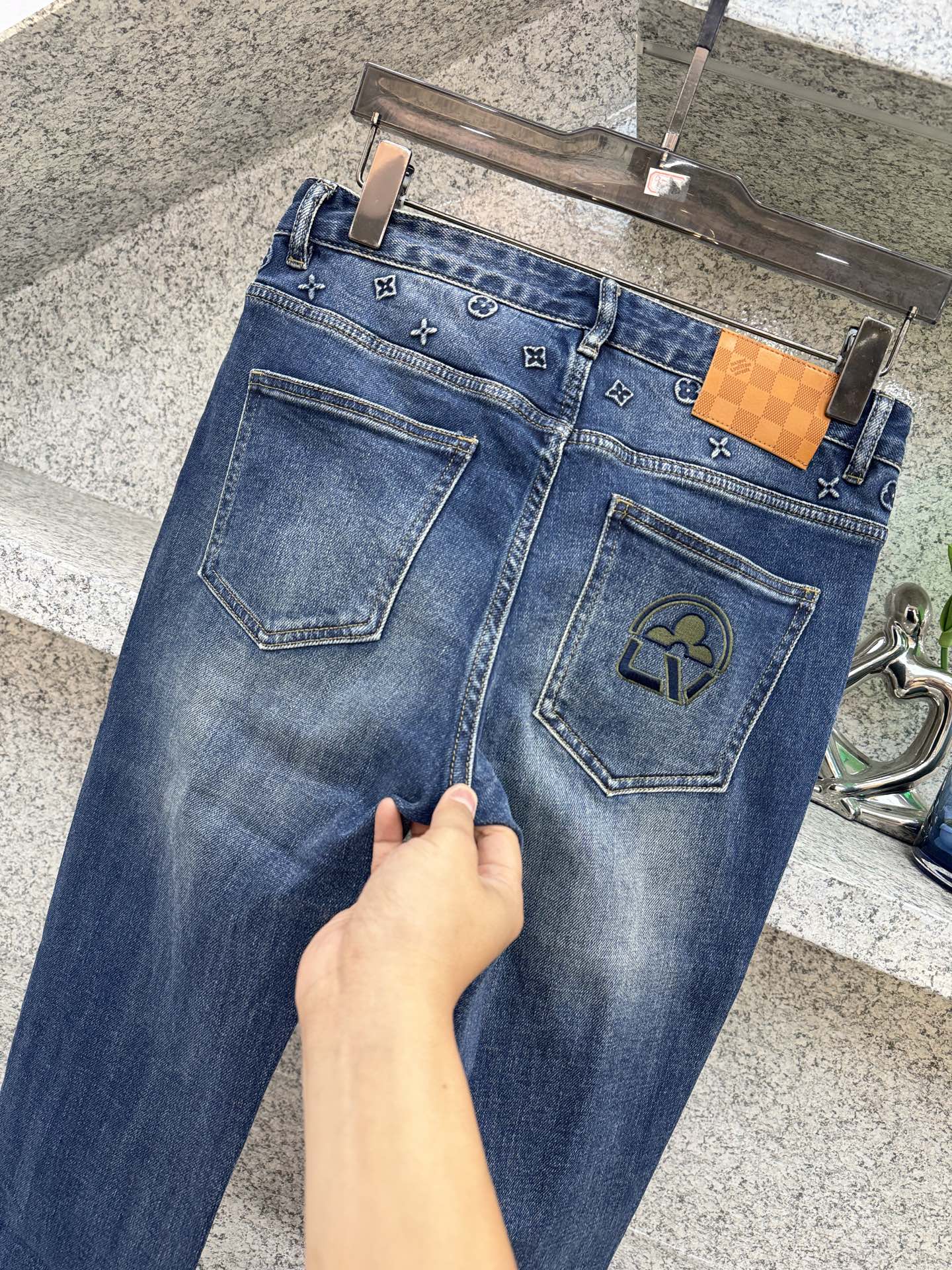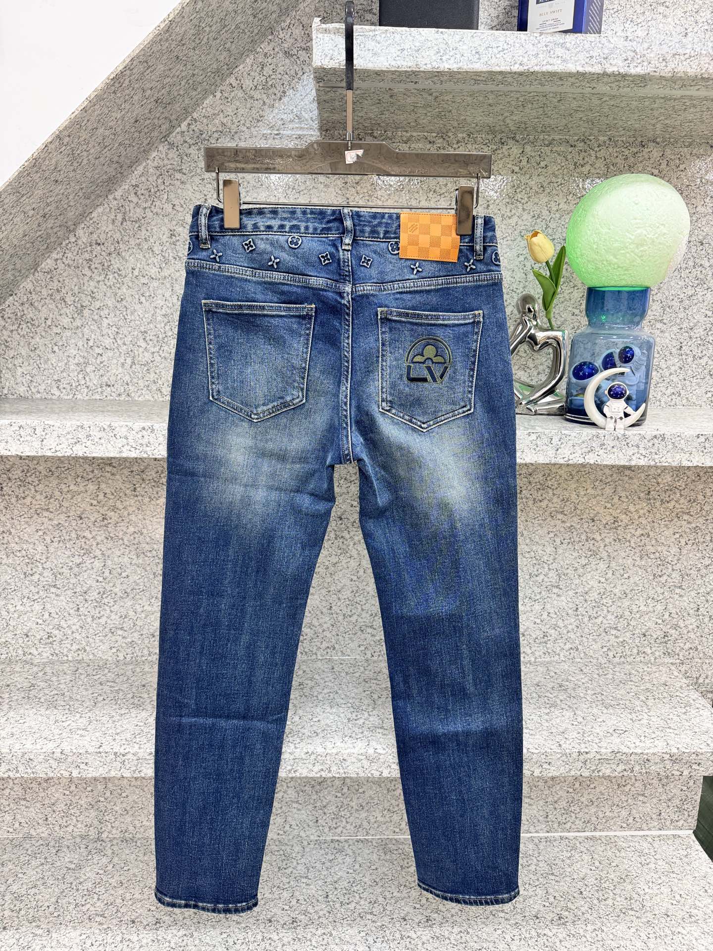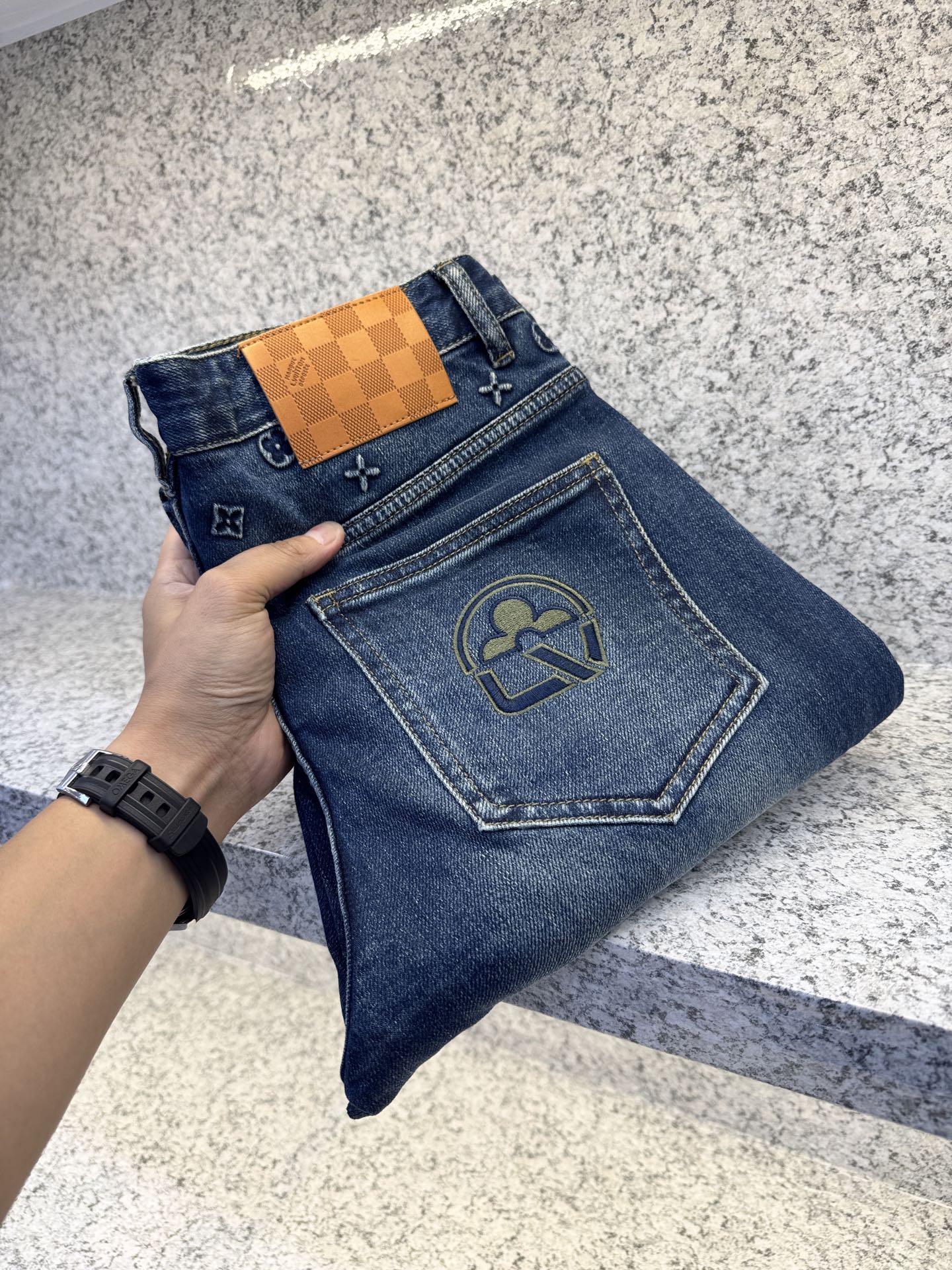 Home • Apparel • Jeans • LV brand new autumn-winter design jeans. Soft, skin-friendly fabric with top grain leather waist tag. Classic blue wash, limited edition. Stretchy slim straight cut, sizes 29-38.