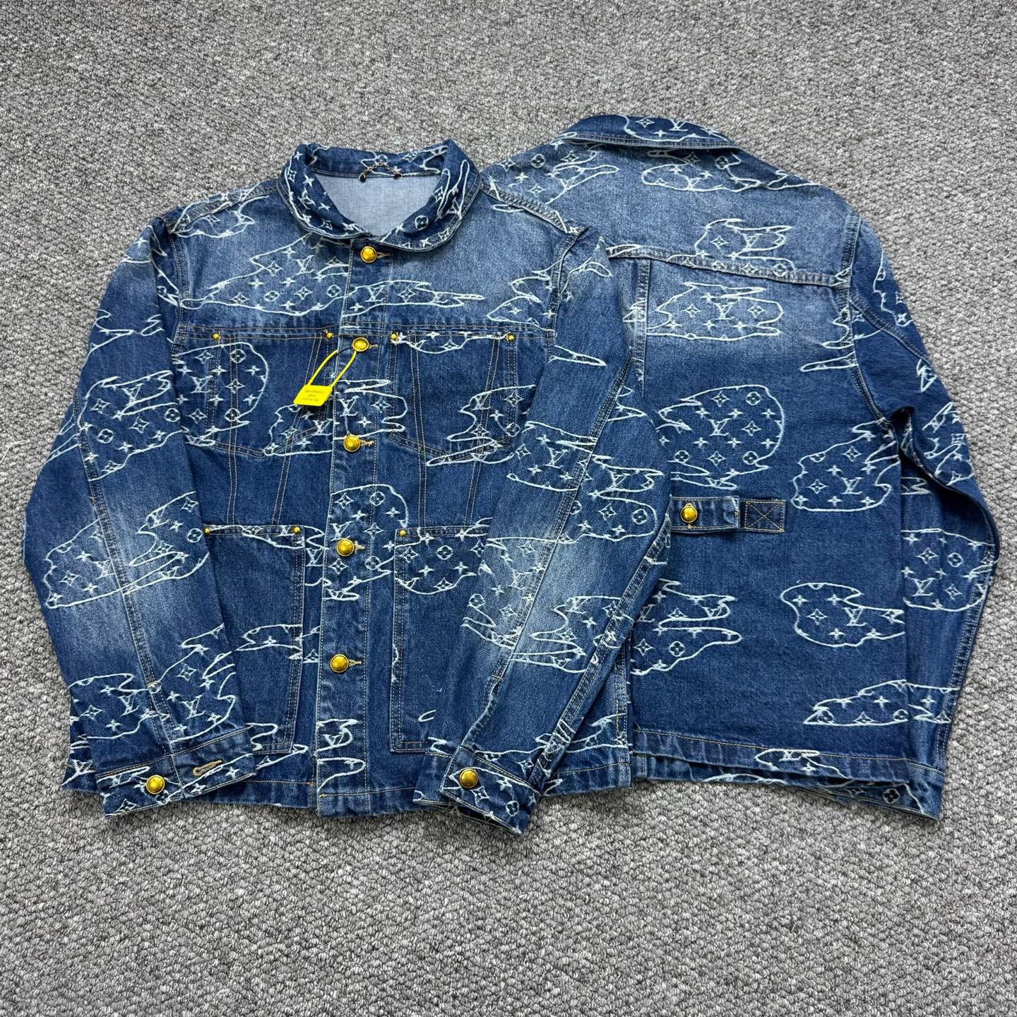 Louis Vuitton x Pharrell Williams & Nigo denim set. Jacquard pattern, pearl buttons, pocket rivets. Dandy silhouette. Color: Blue. Sizes: 46-52.