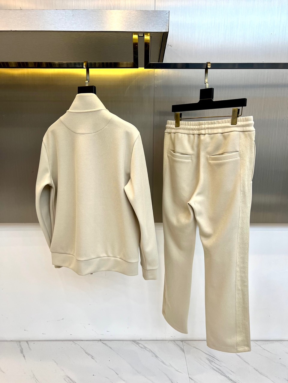 Dior Men's 2025 Fall/Winter athletic collection. Matte stretch fabric, structured suit with gray tech panels. Jacquard Cannage pattern. Stand-collar jacket, trousers with side pockets. Versatile for urban elites.