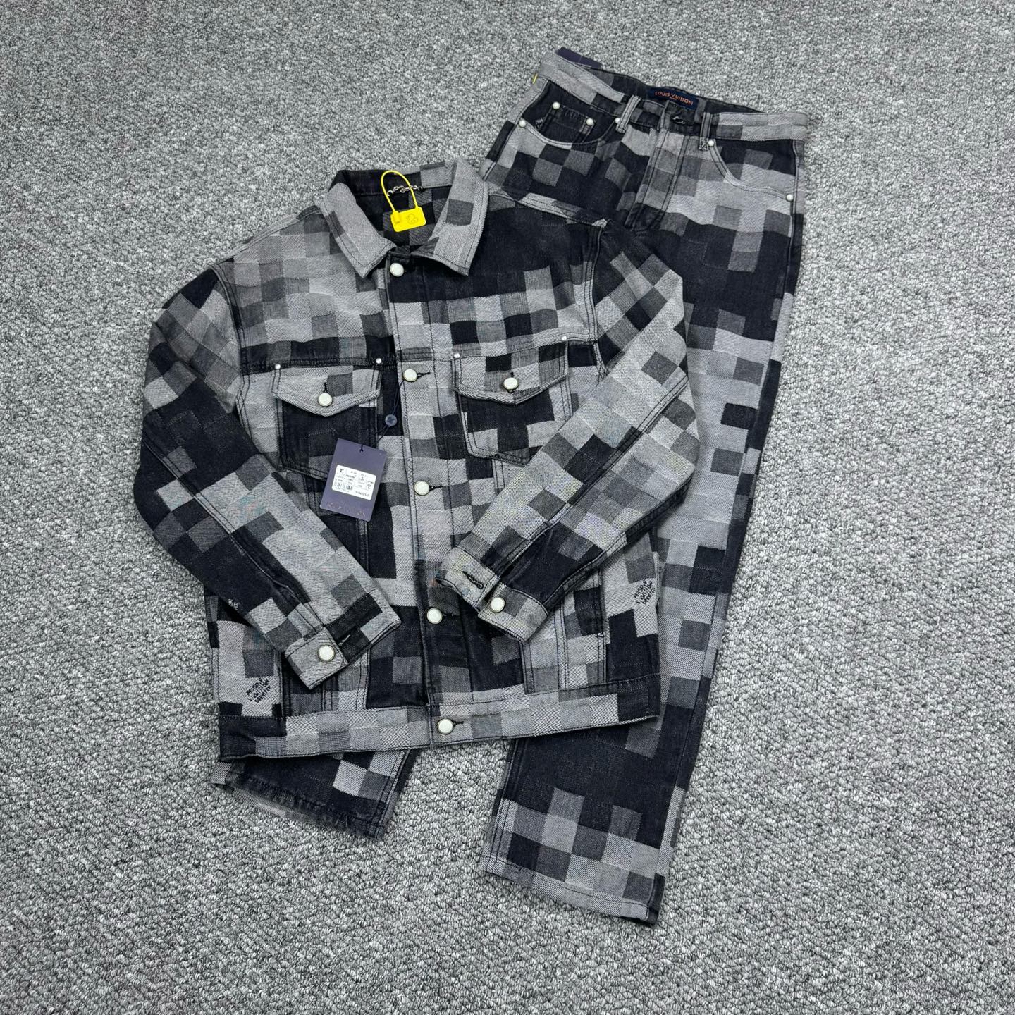 Louis Vuitton Pharrell Williams Damien mosaic denim jacket & jeans set. Button style, black. Features Japanese denim, jacquard, sand-washed, pearl buttons. Sizes S/M/L/XL.