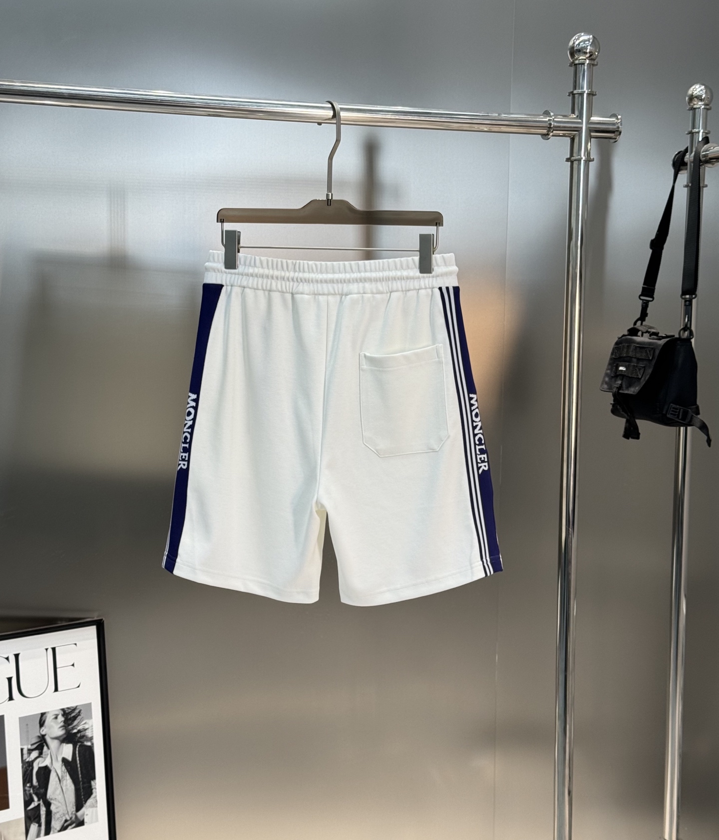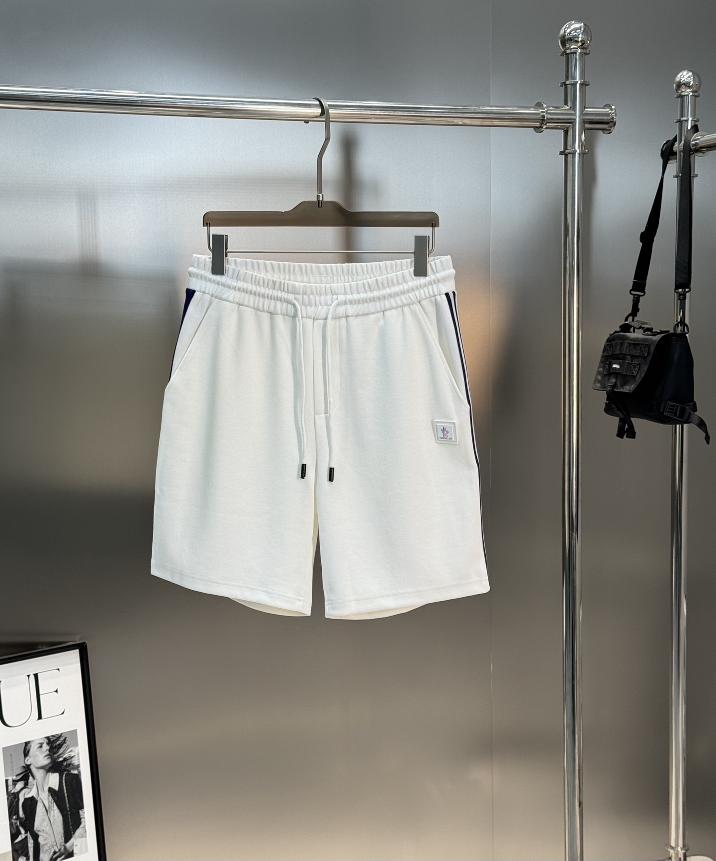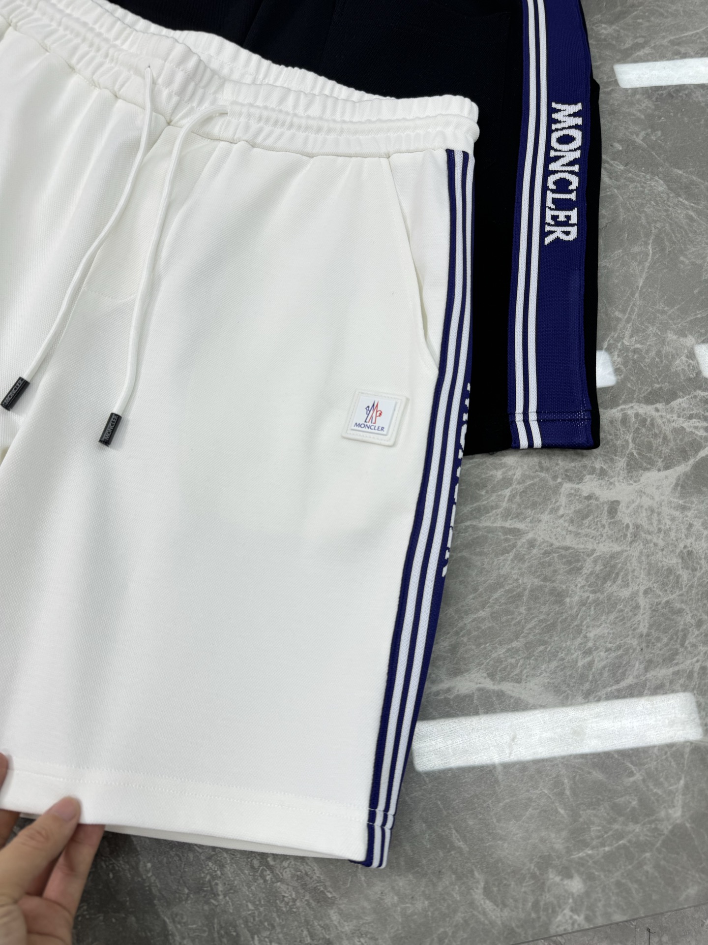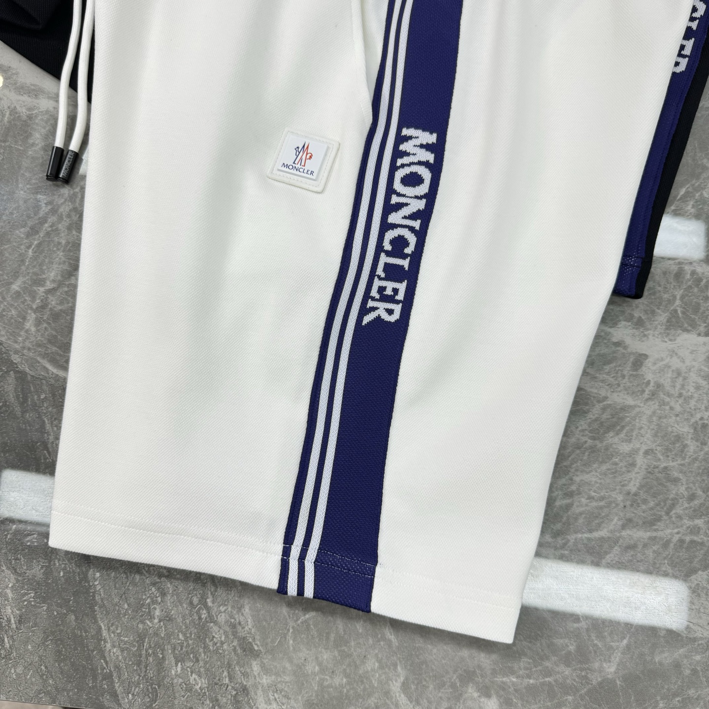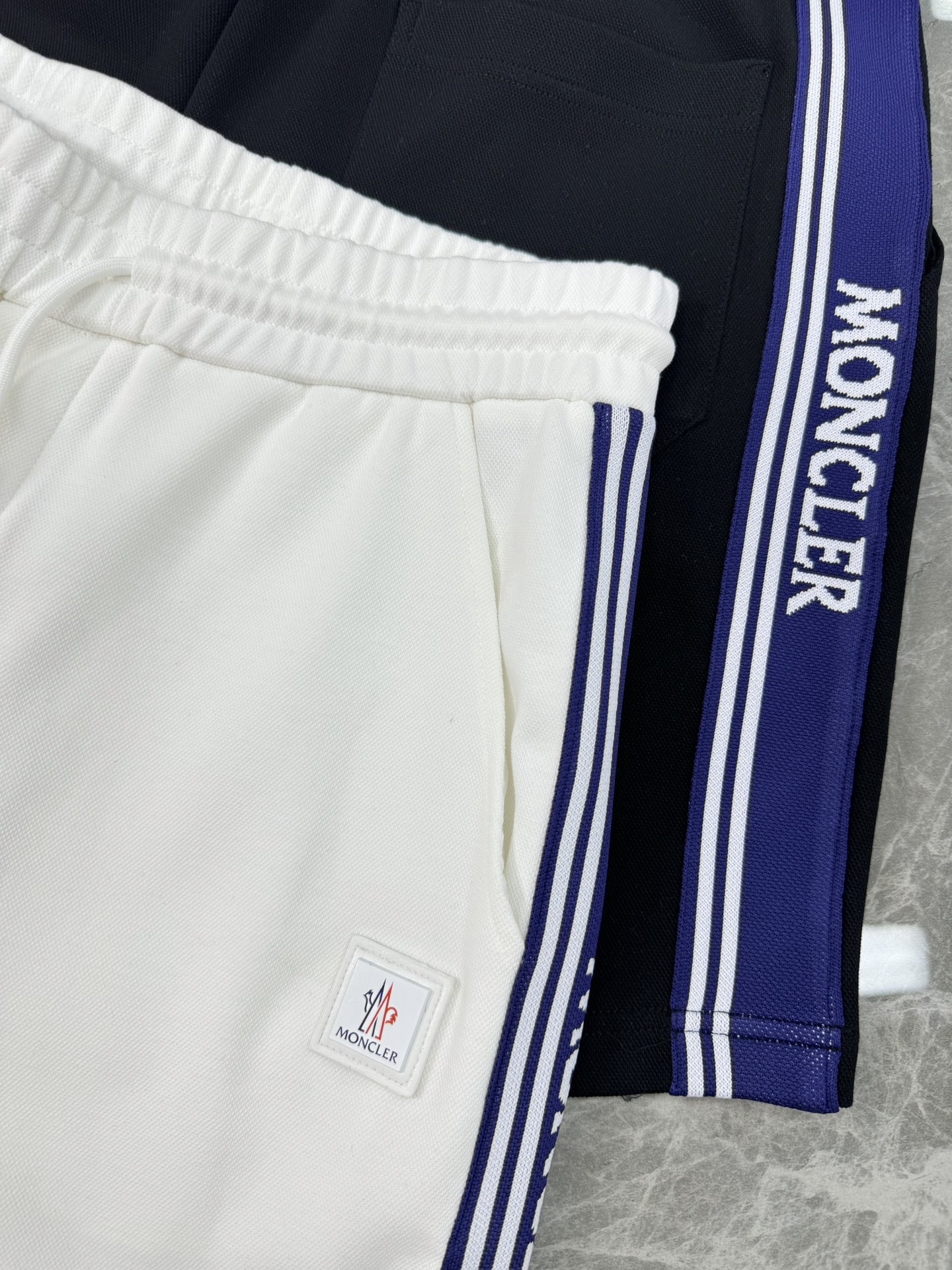 Moncler 25s retro sport shorts. Unisex design with striped trim & leather patch. 100% imported Tencel fabric. Colors: Black, White. Sizes: M-3XL.