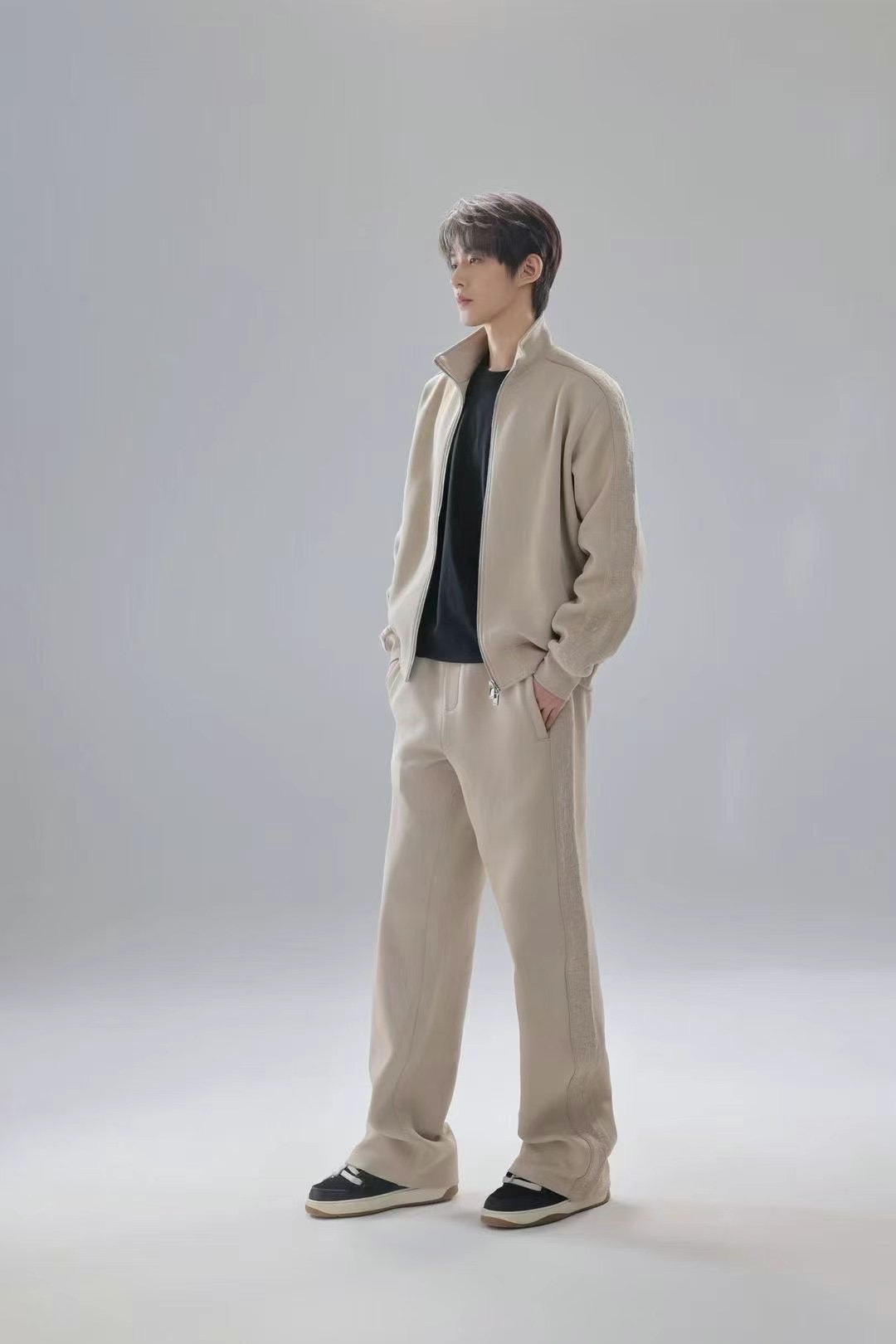 CD Dior new sportswear set. Zippered stand-collar top with custom logo tape and hardware. Loose fit, versatile in beige. Sizes S/M/L/XL.
