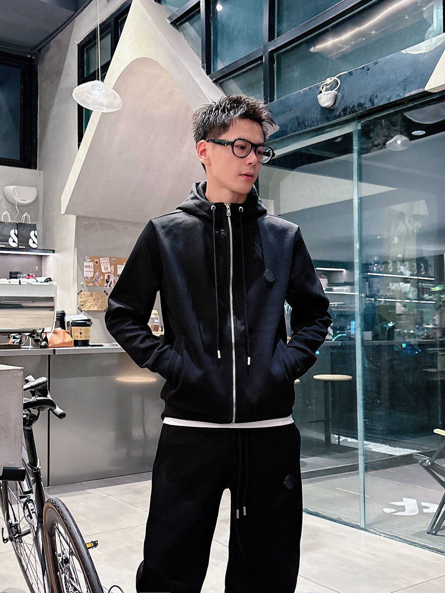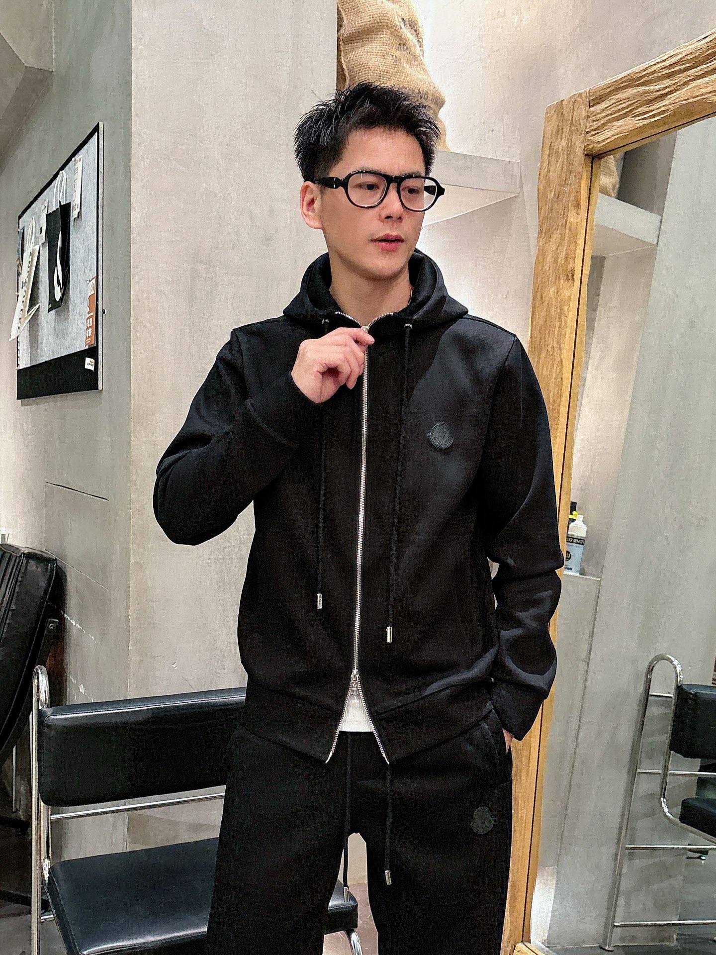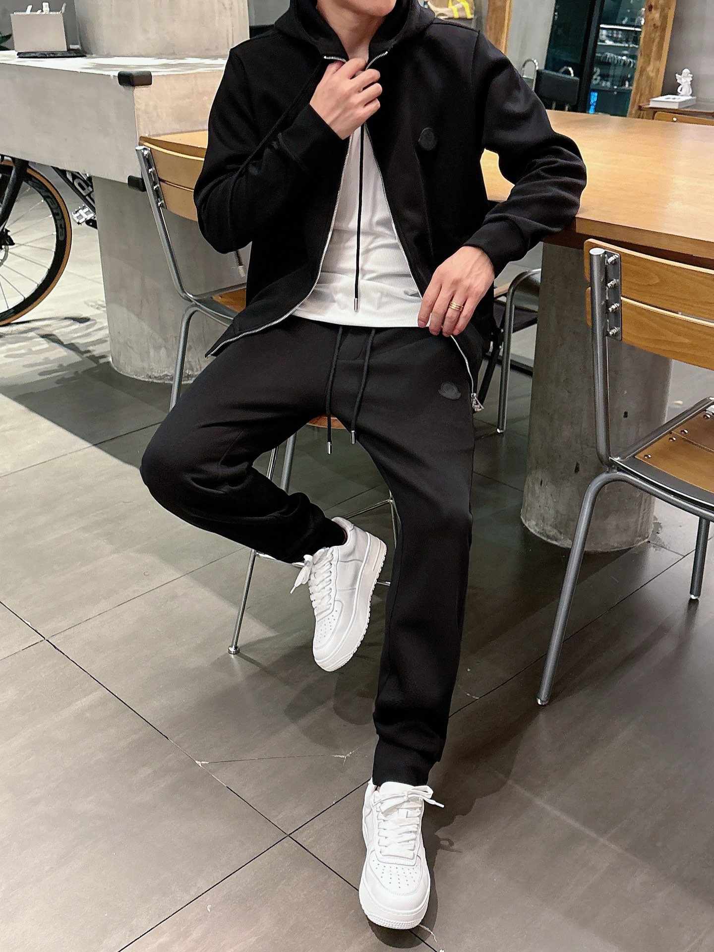 Moncler 2025 early autumn casual set. New black leisure suit with classic logo, tailored urban style. Sizes: M L XL XXL XXXL.