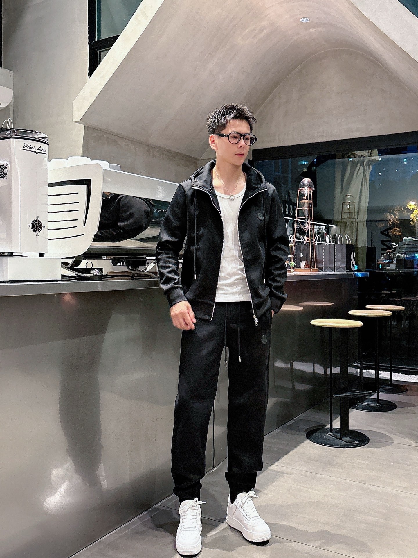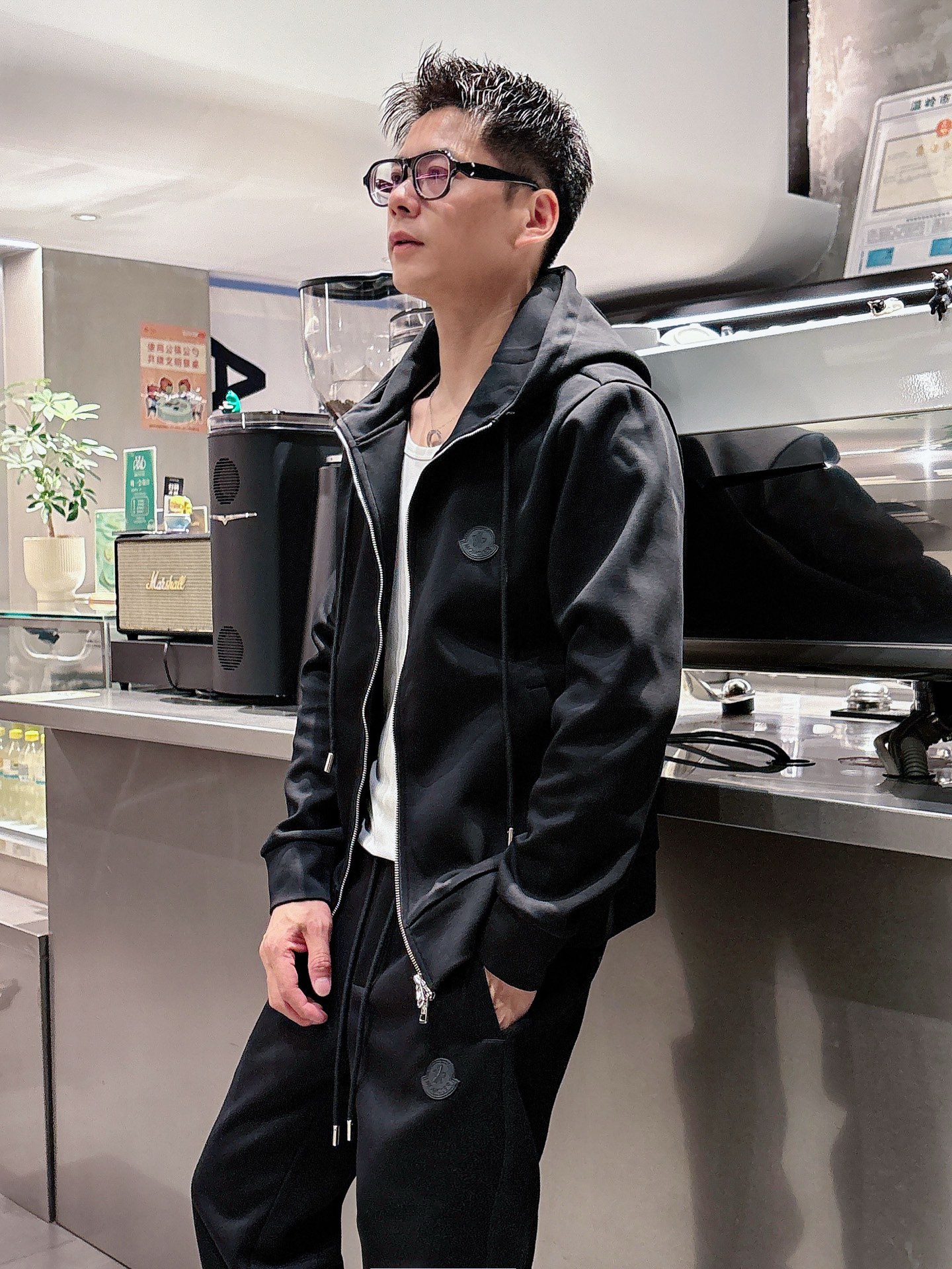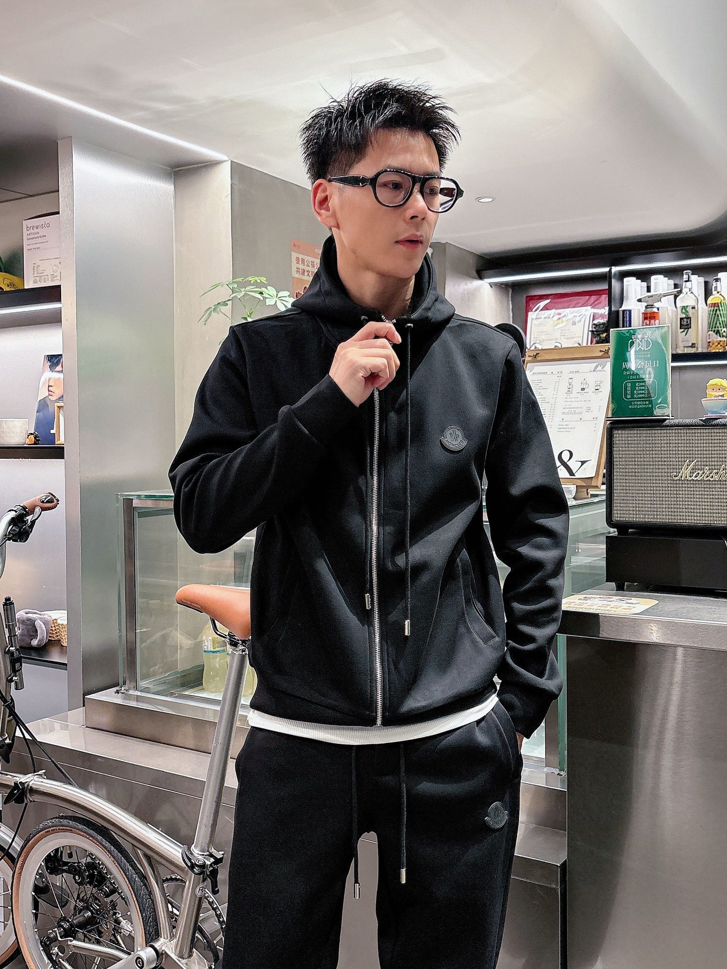 Moncler 2025 early autumn casual set. New black leisure suit with classic logo, tailored urban style. Sizes: M L XL XXL XXXL.