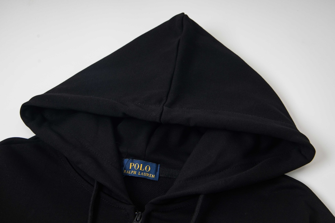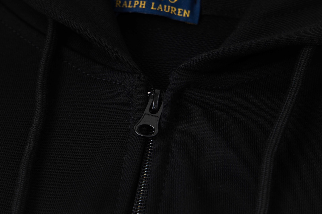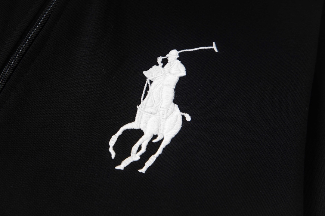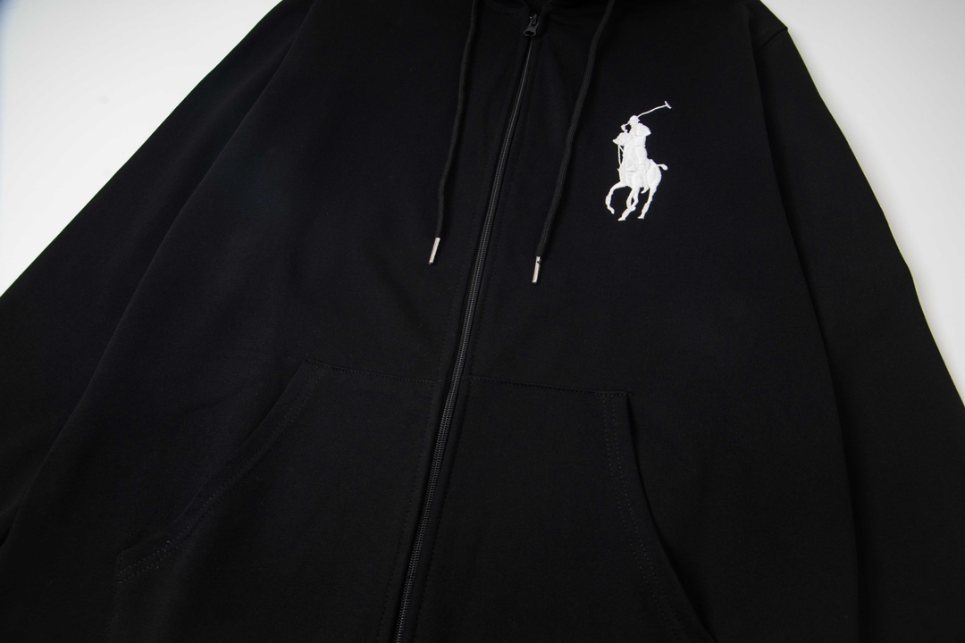 Ralph Lauren embroidered hooded zip-up sweatshirt. Features polo pony design, premium pique cotton, relaxed fit. Available in navy, black, gray sizes S-XL. Versatile for casual wear.