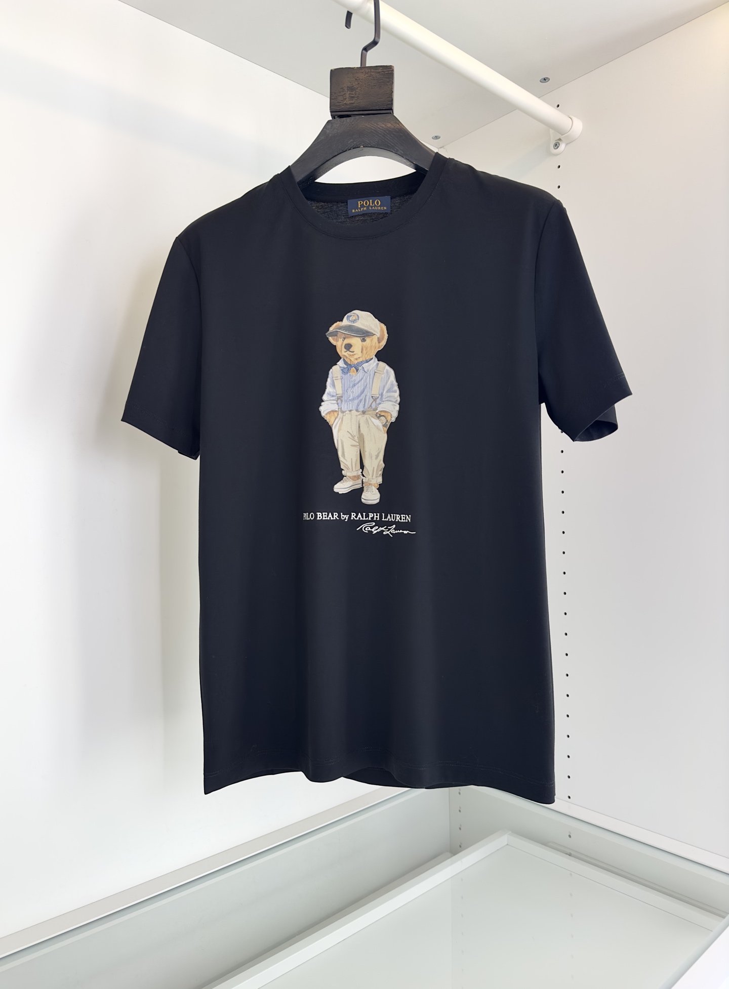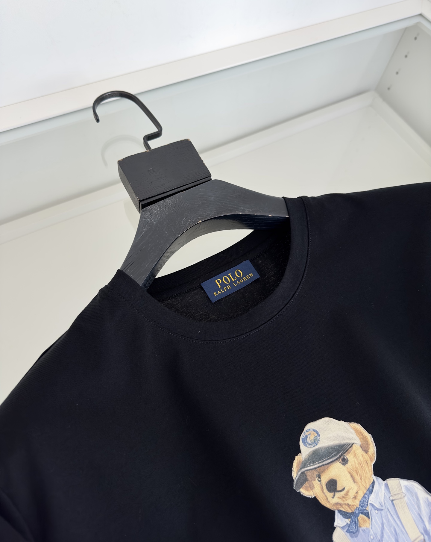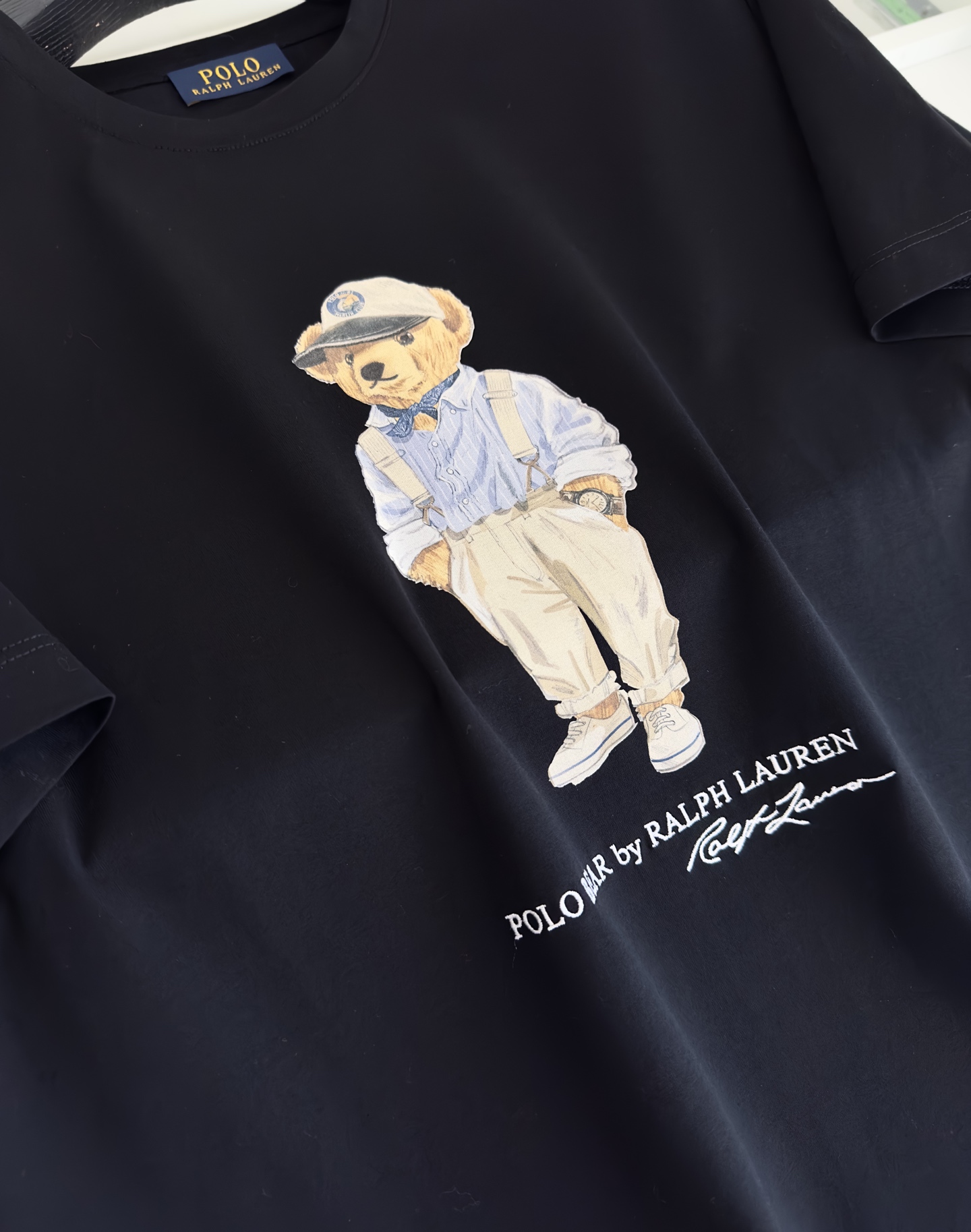 Ralph Lauren Polo Bear cotton knit T-shirt. Retro bear design with color print & embroidery. Comfortable, breathable high-count cotton. Black/white. Sizes M-3XL.