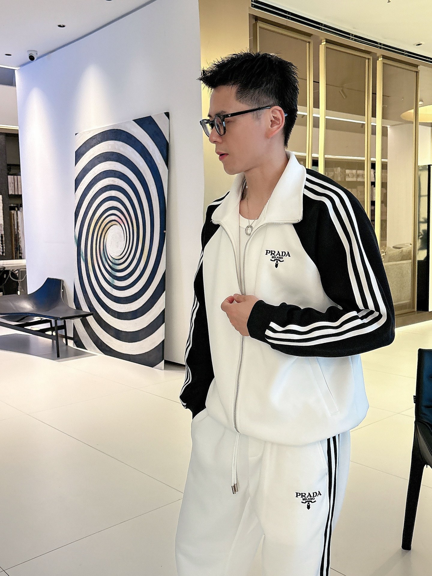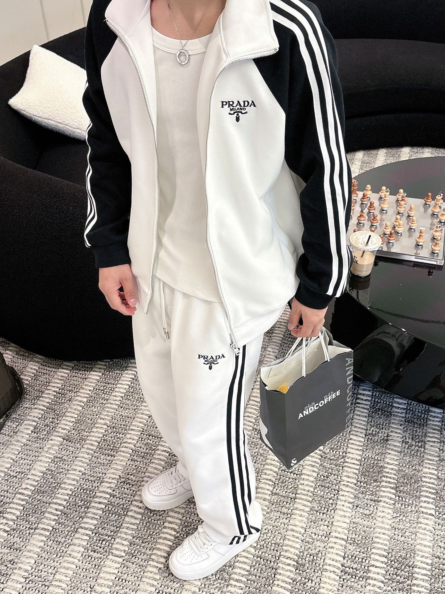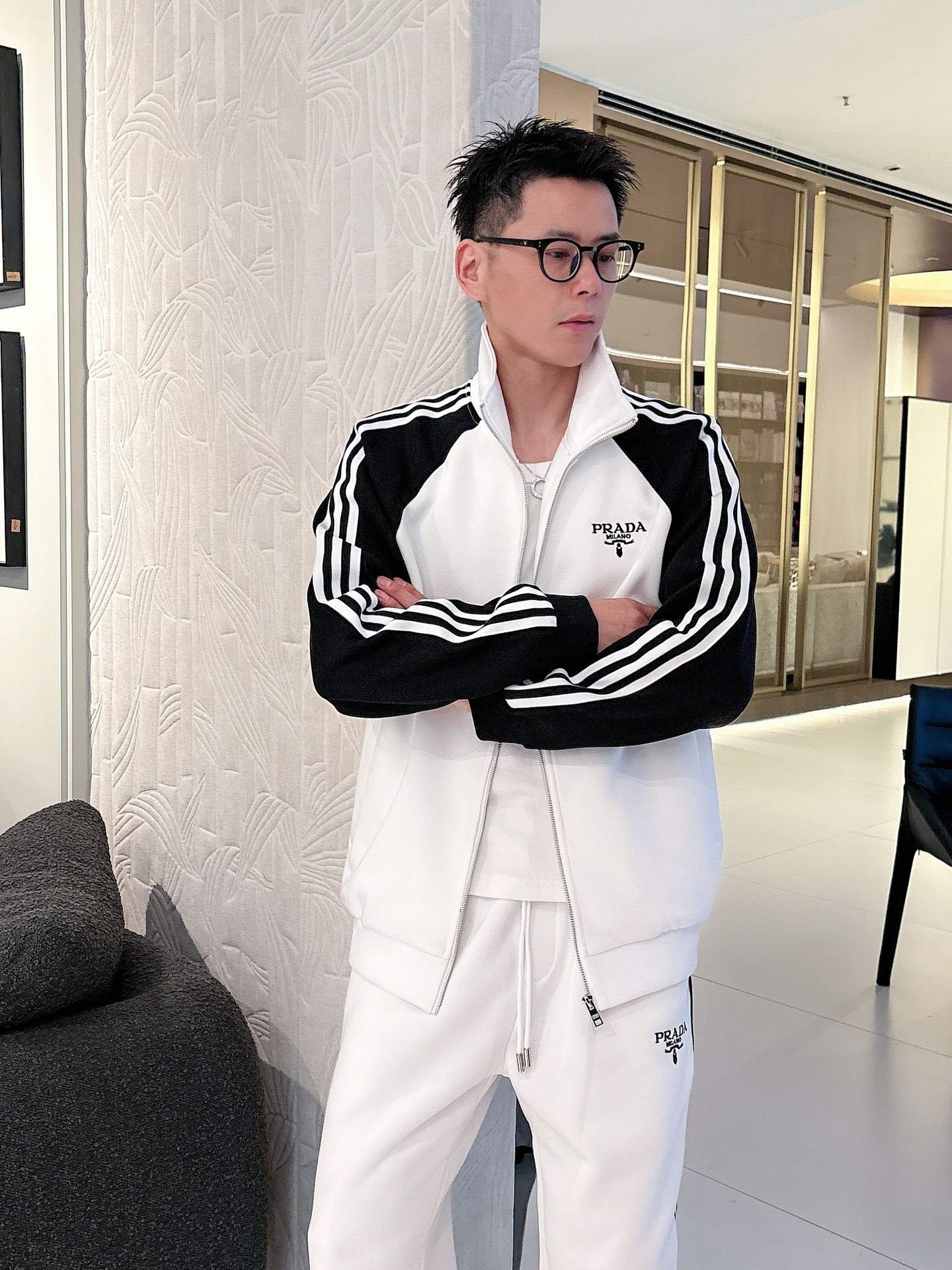 Prada set with top拼接, jacquard zipper pants, logo embroidery, classic black/white tape. Custom fabric, premium craftsmanship. Full tags. Sizes M-3XL.