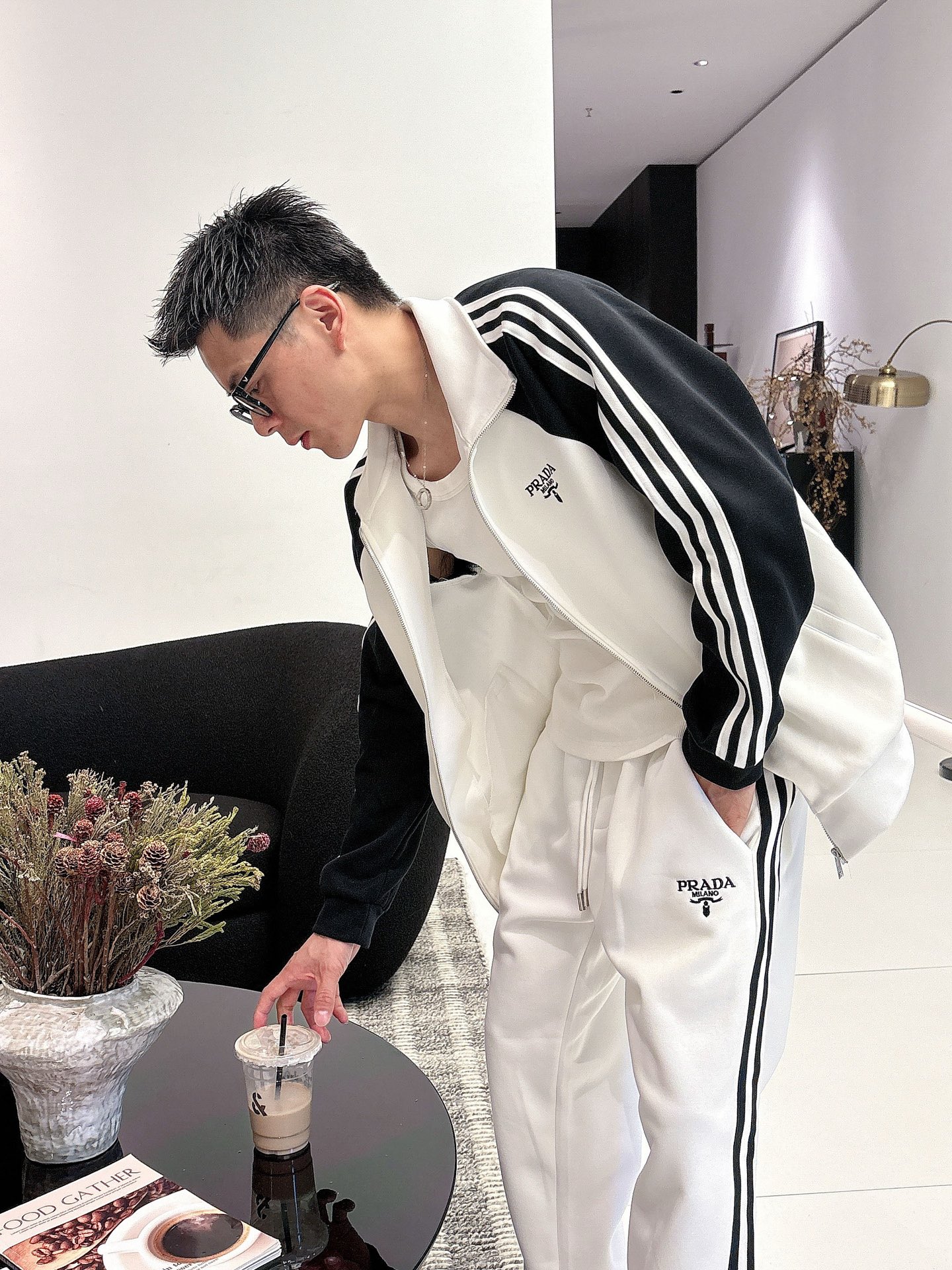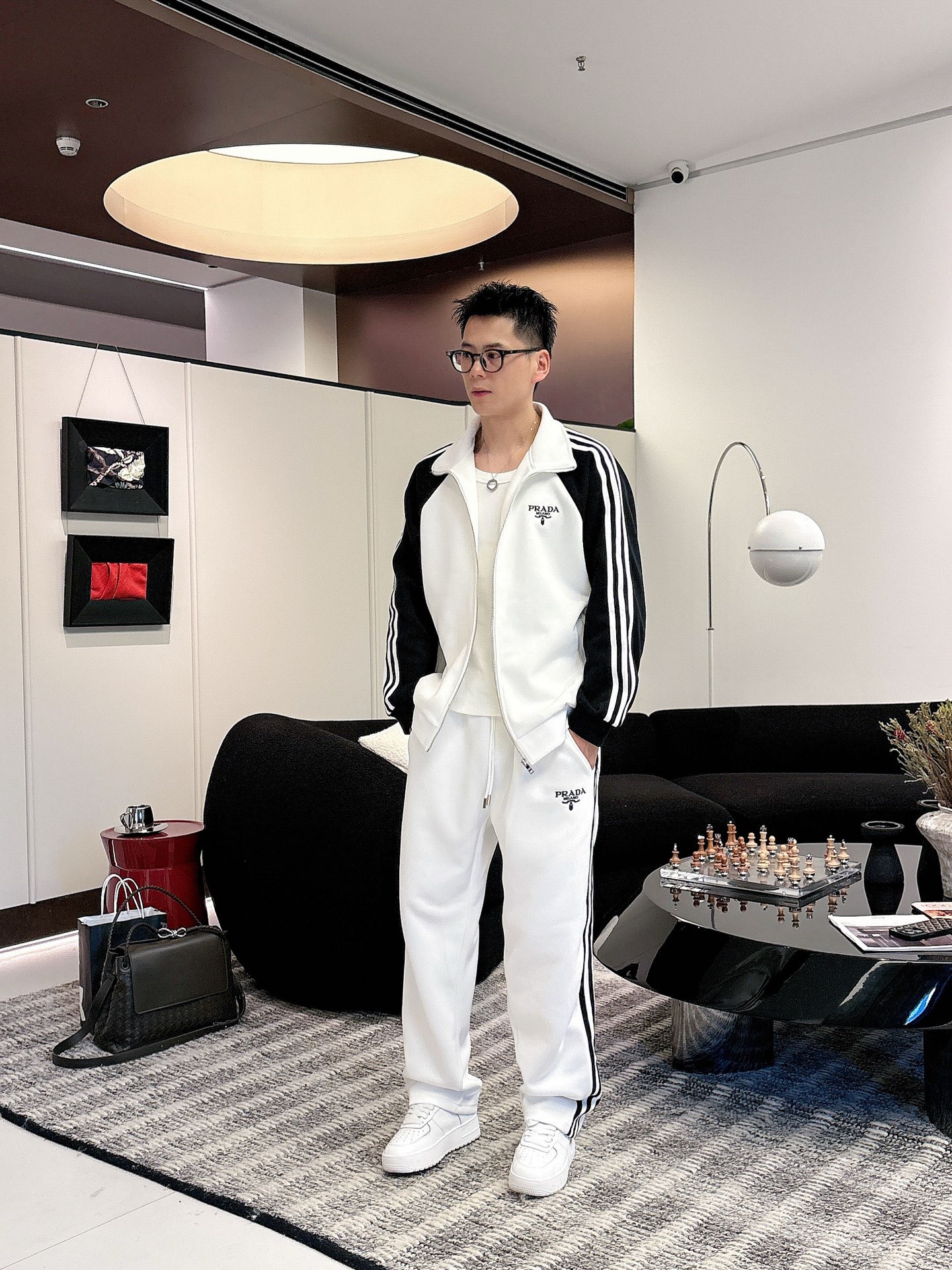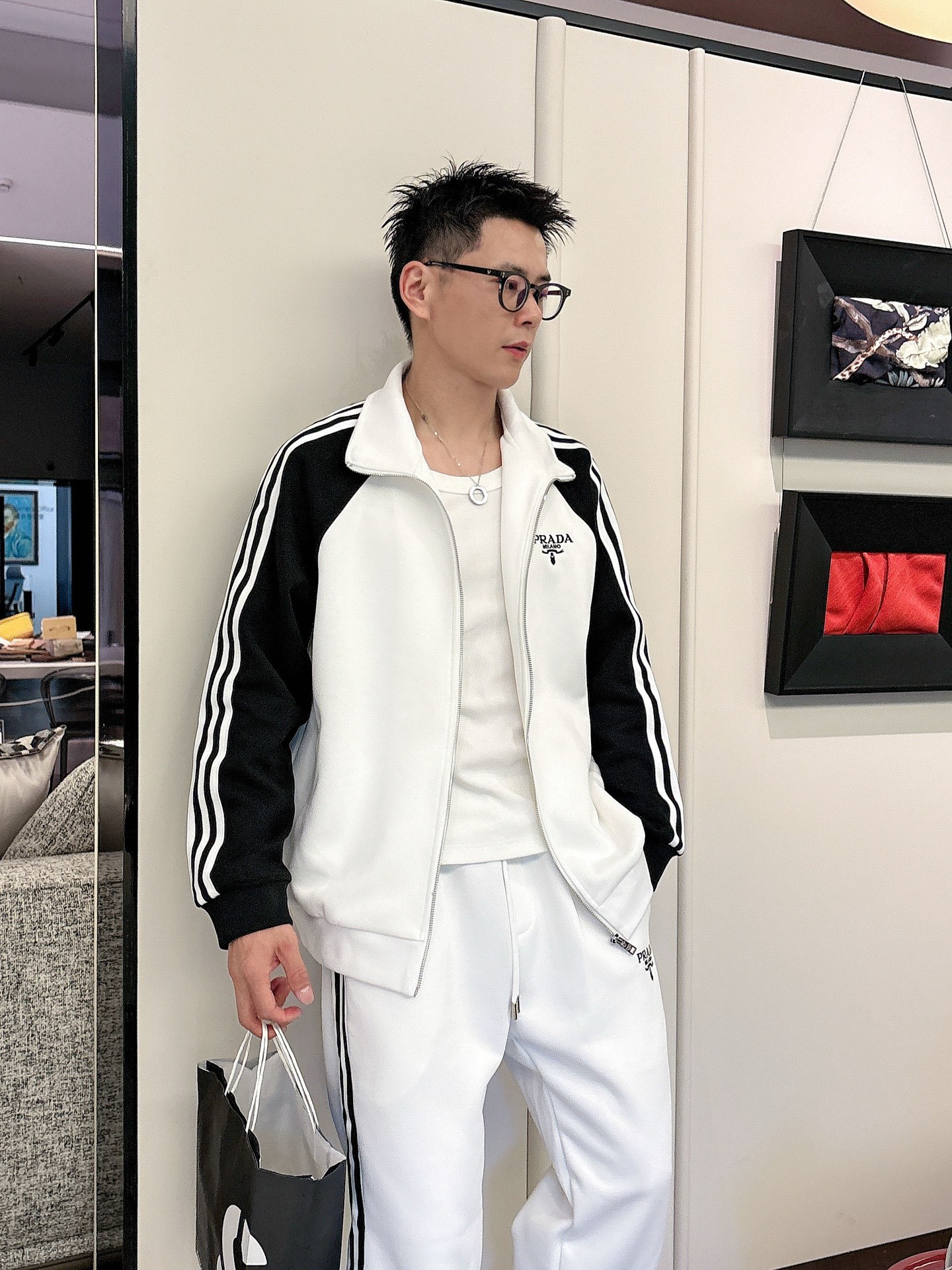 Prada set with top拼接, jacquard zipper pants, logo embroidery, classic black/white tape. Custom fabric, premium craftsmanship. Full tags. Sizes M-3XL.