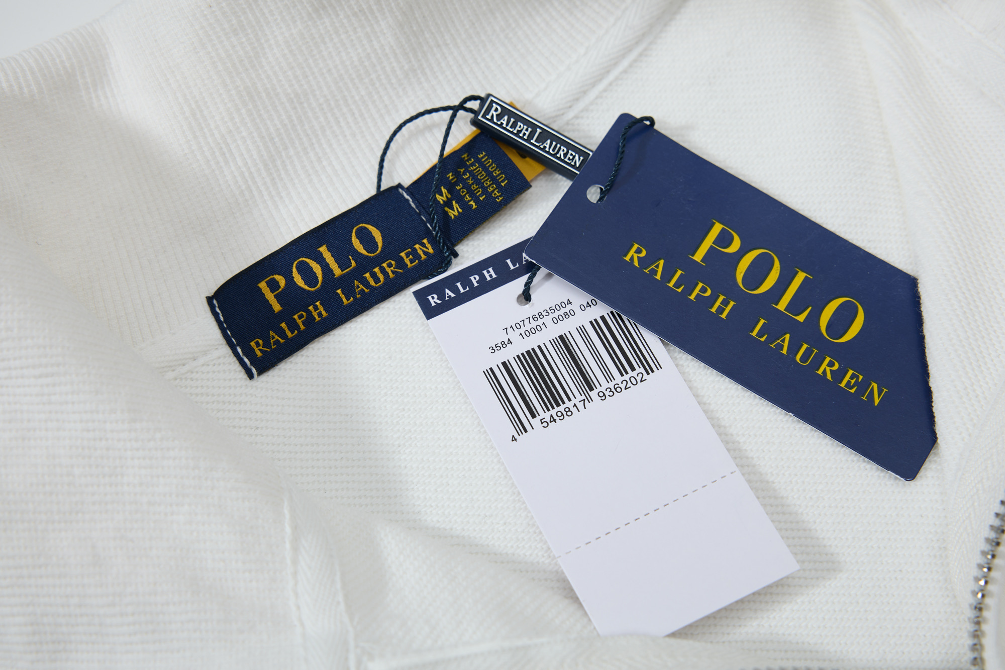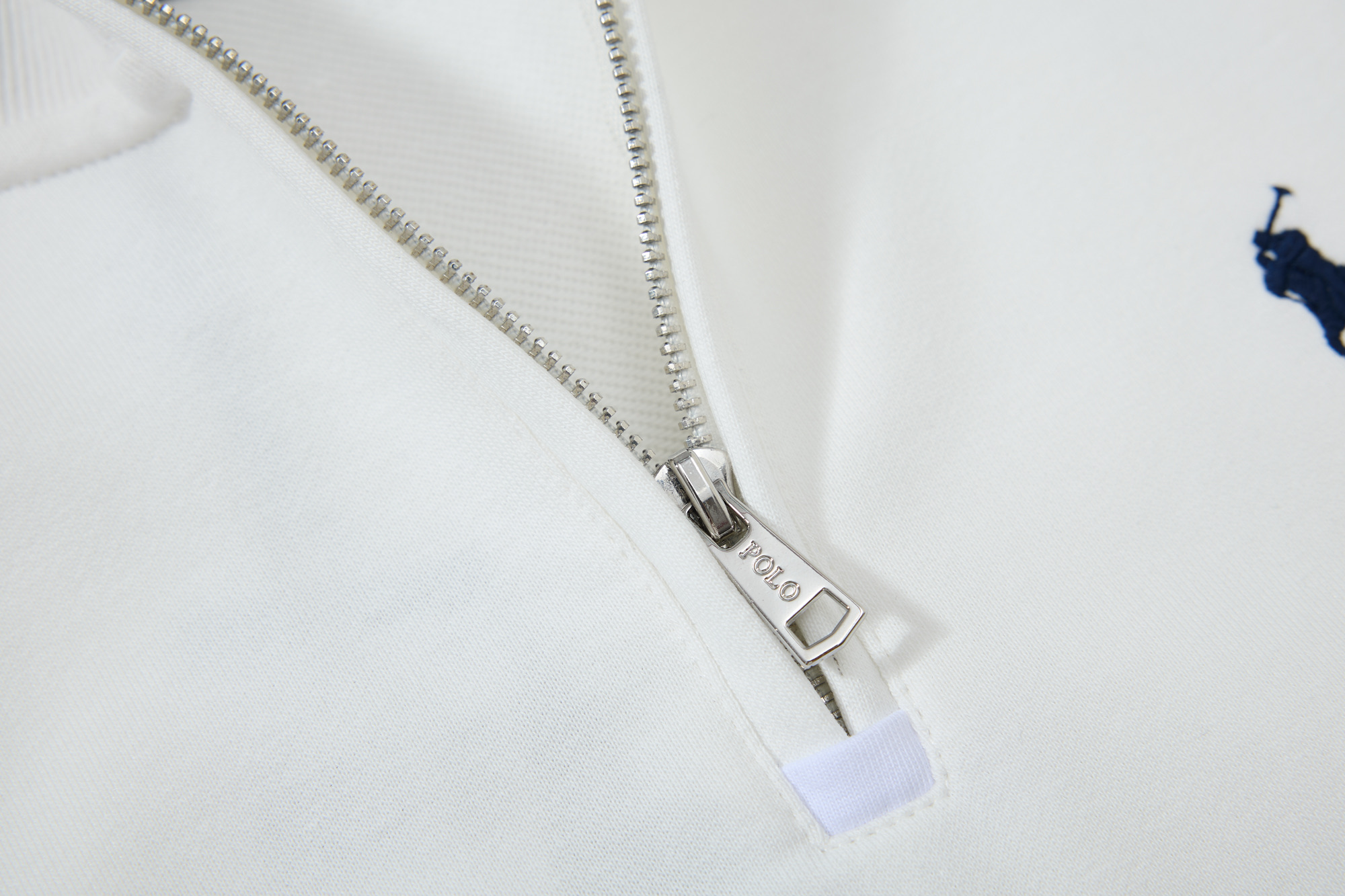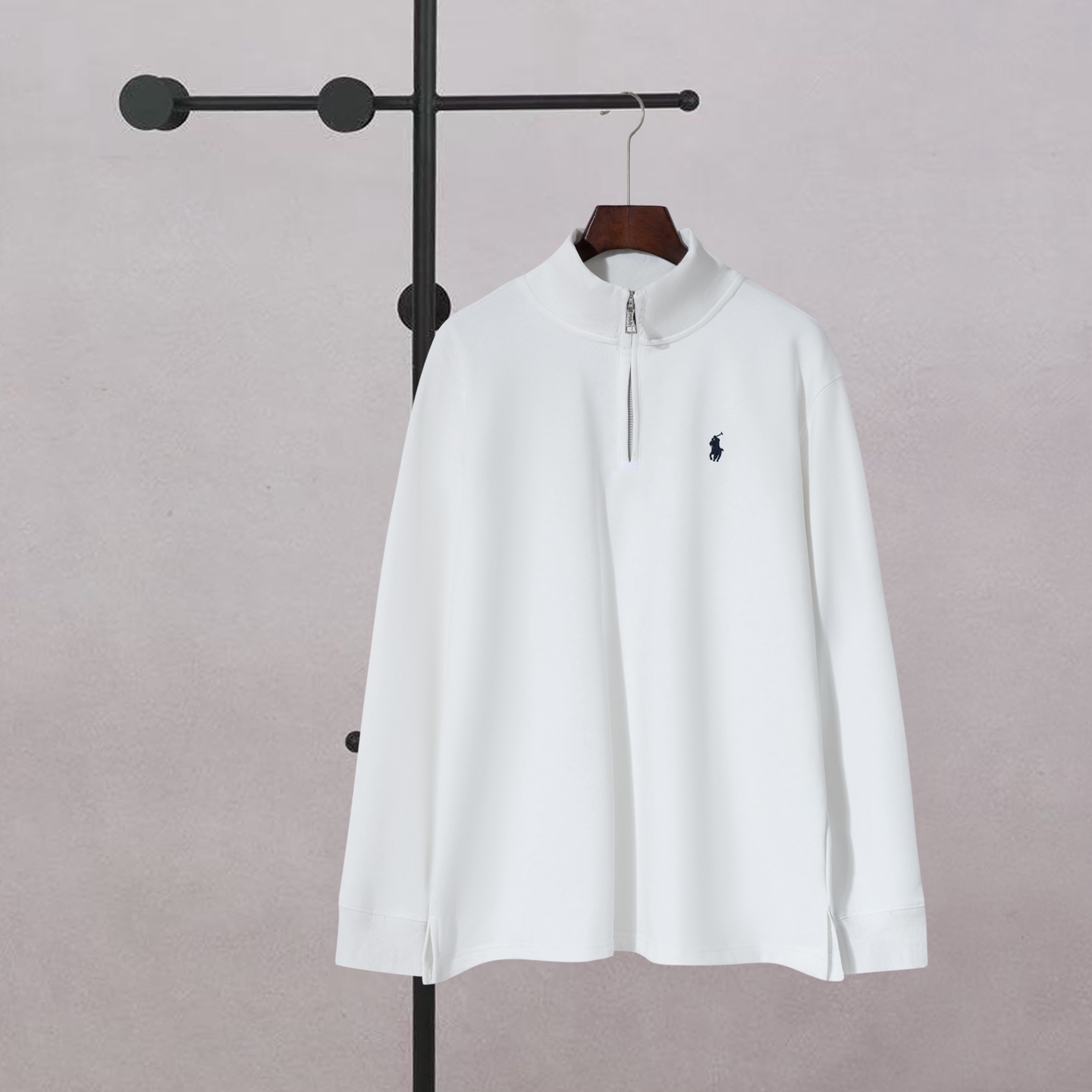Ralph Lauren half-zip sweatshirt. Classic polo pony logo, soft fabric. Available in white and dark brown. Sizes S-XL. Versatile for casual or commute wear.