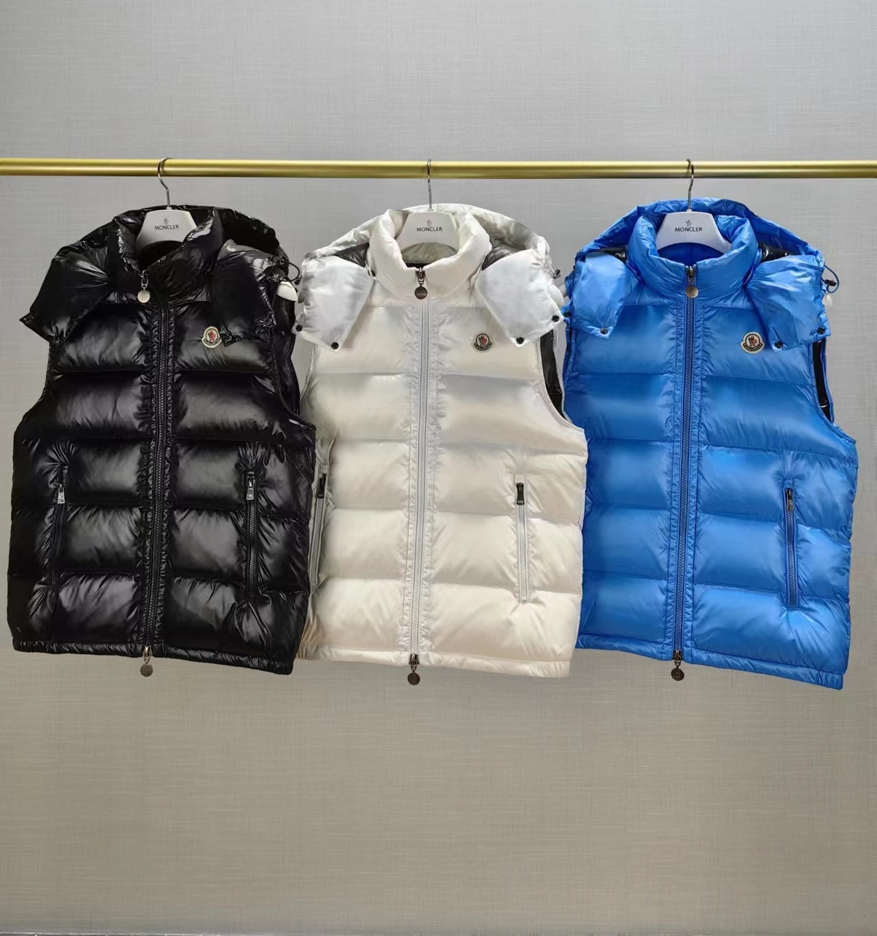 Upgraded new Moncler Bor me s down vest This vest is made of iconic shiny coated nylon, with classic rectangular quilting that makes it stand out, providing excellent protection and warmth. It features a two-way zipper placket with Moncler logo pull tabs. There is also a detachable hood with snap buttons and elastic drawstrings. Full of details! The wearing effect is super great!