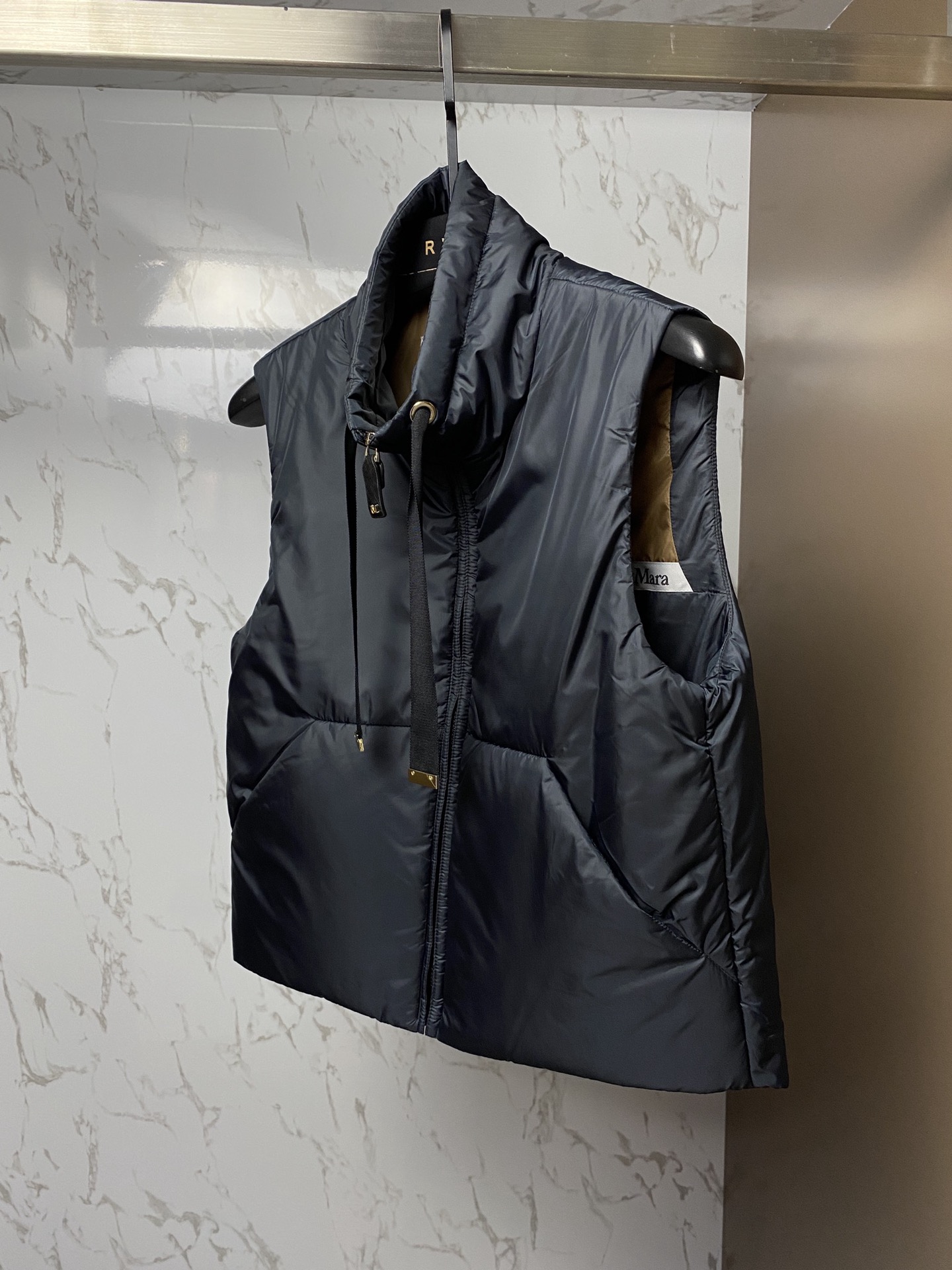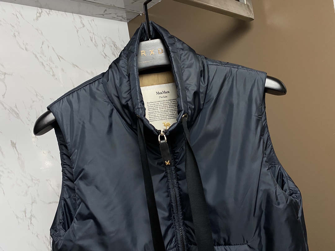 Maxm*ra women's lightweight stand-up collar camel wool vest. Made of lustrous polyester with a metal M zipper pull. Features a drawstring hood with metal tips. Camel wool filling. Sizes 36-42.