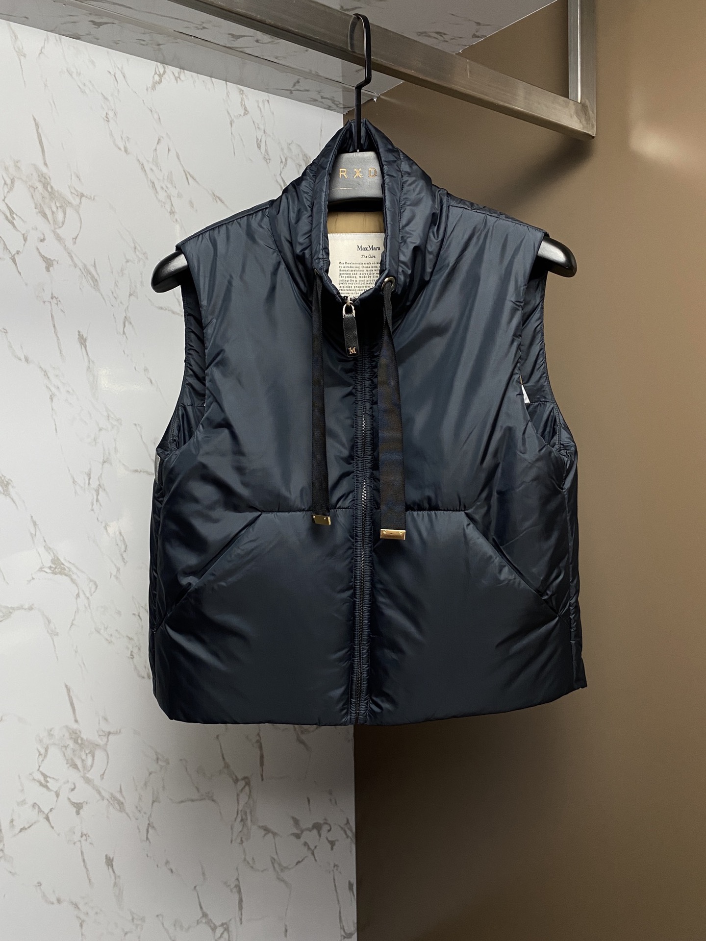 Home • Apparel • Maxm*ra women's lightweight stand-up collar camel wool vest. Made of lustrous polyester with a metal M zipper pull. Features a drawstring hood with metal tips. Camel wool filling. Sizes 36-42.
