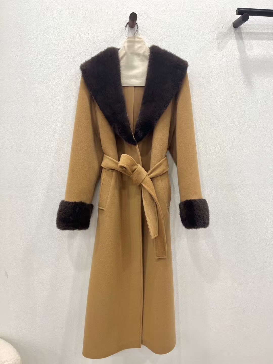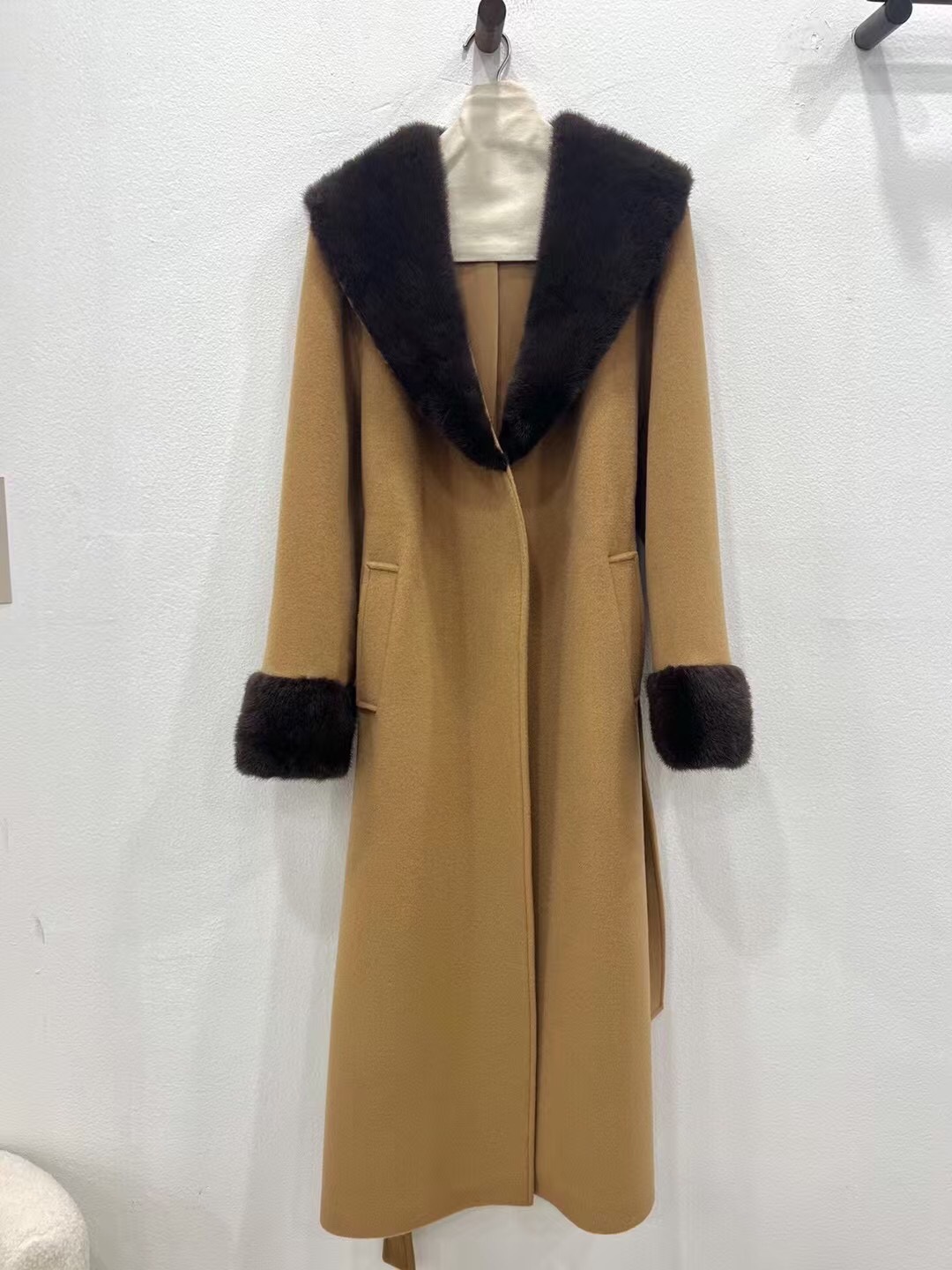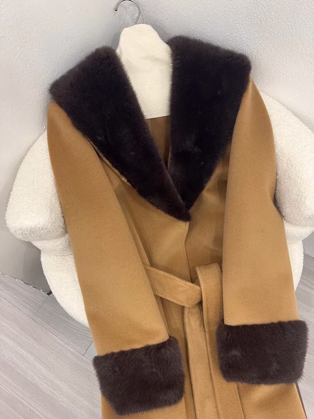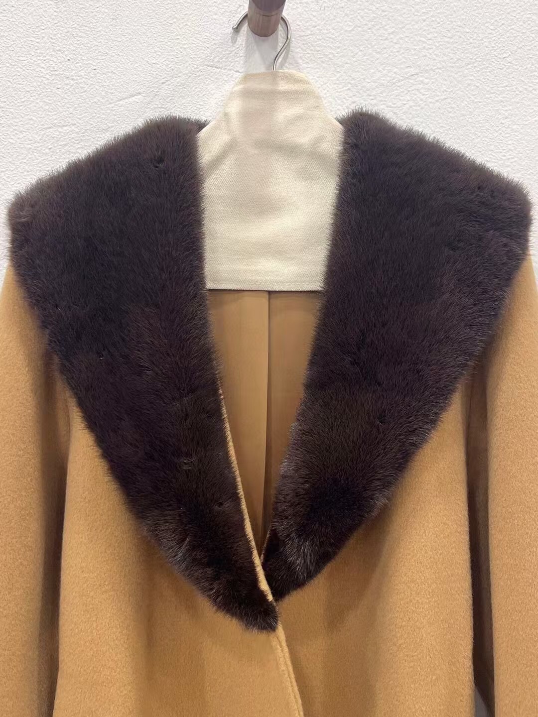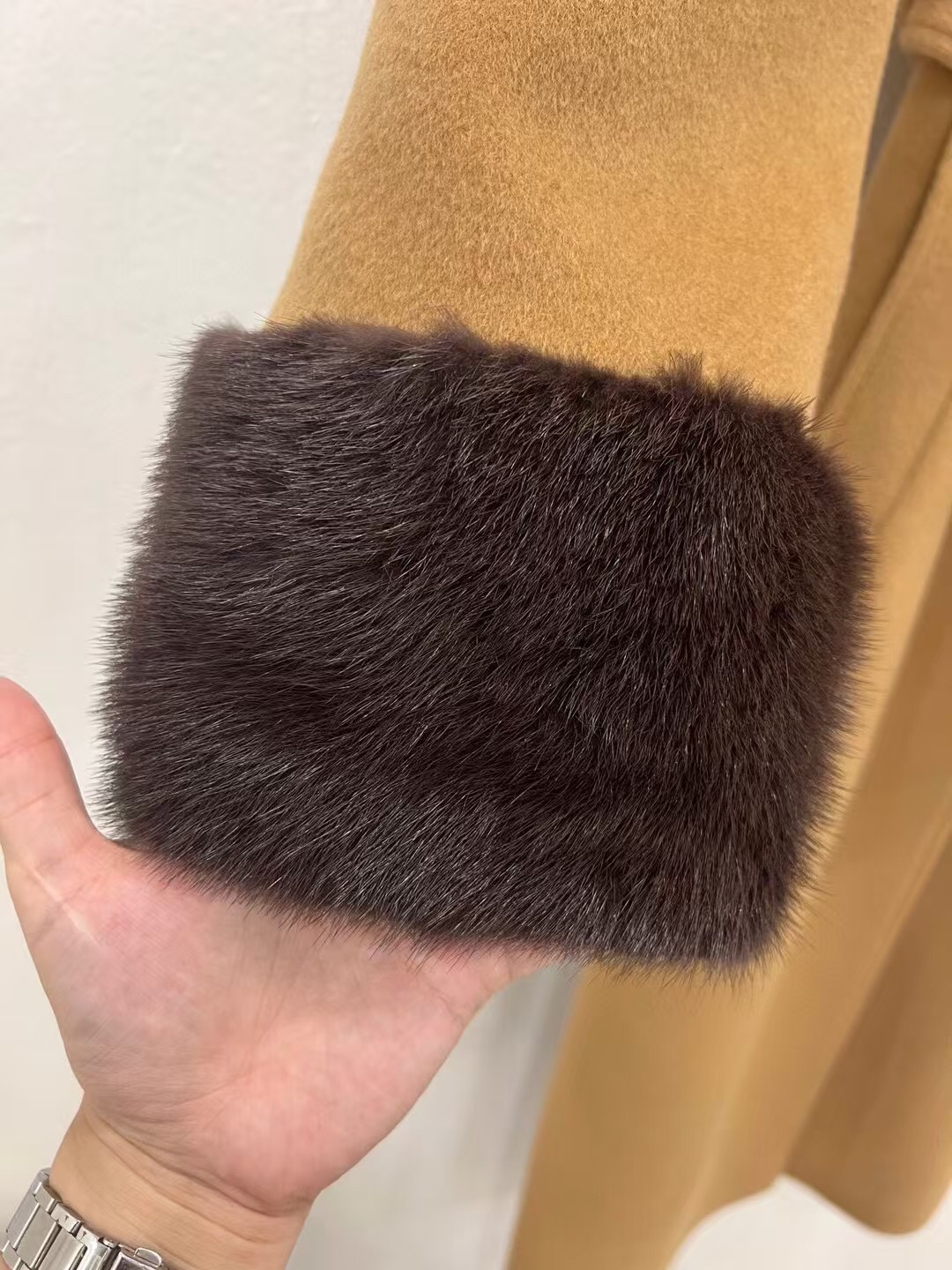 Features a mink fur collar from the neckline to the shoulders and mink fur cuffs on the sleeves, exuding luxury in every gesture.