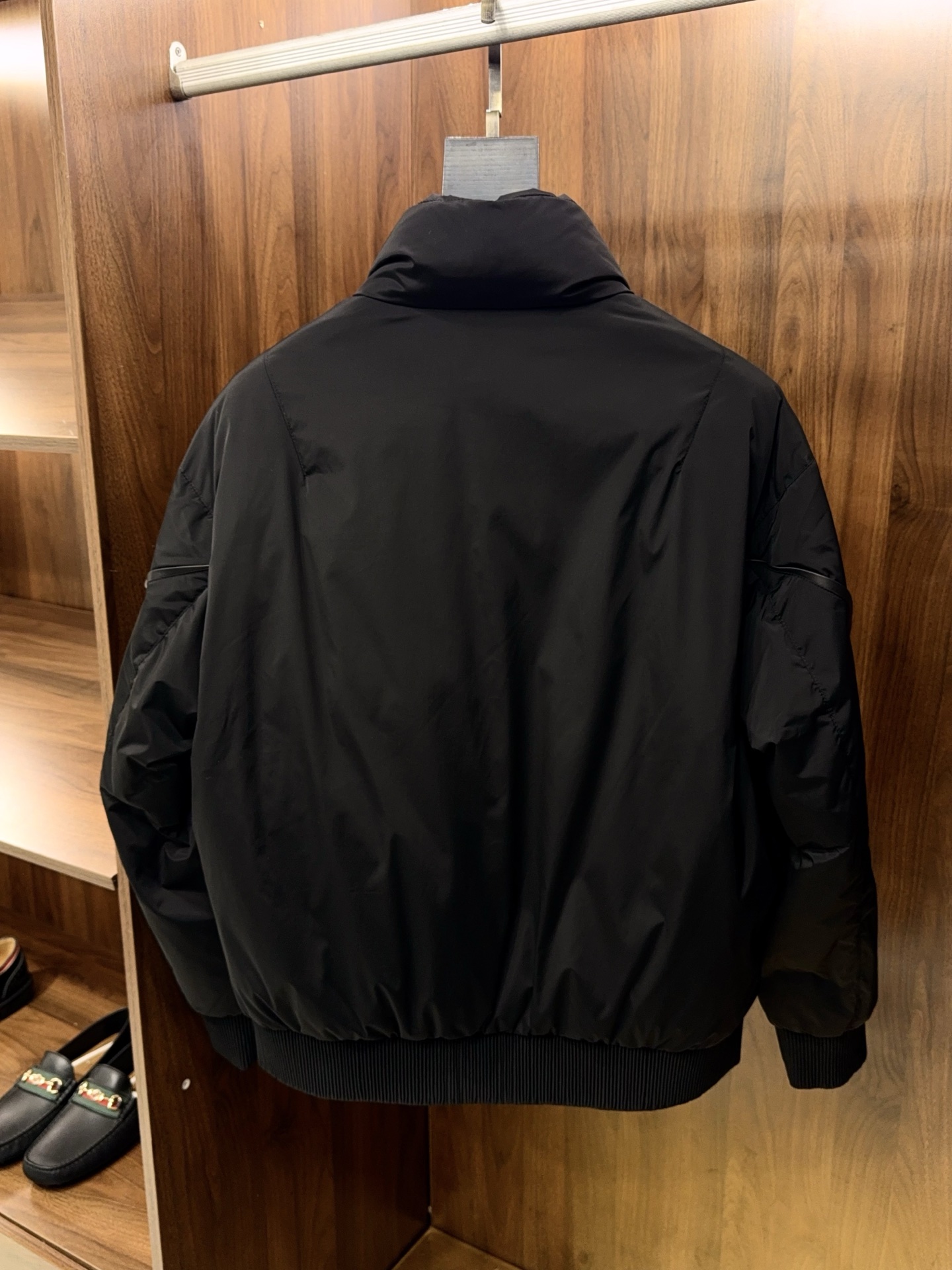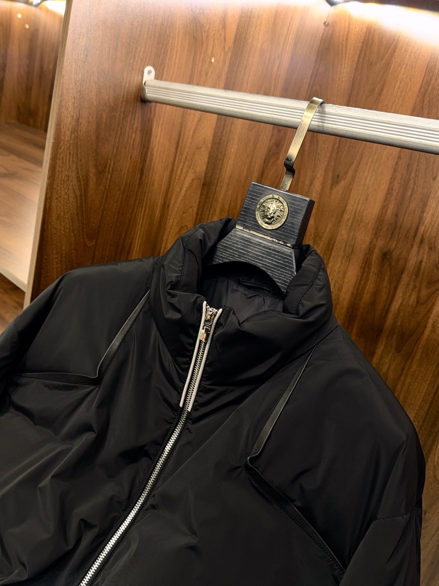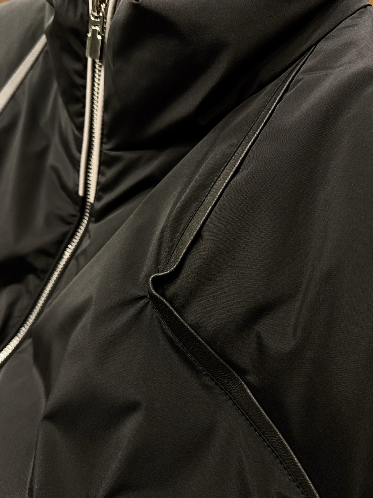 The classic stand collar design fits the neck curve, providing both wind protection and warmth, while also enhancing body proportions and showcasing a sharp presence. Key areas of the garment are adorned with lamb leather trim strips; the delicate leather texture contrasts with the down fabric, concealing luxurious sophistication within understated elegance, injecting design ingenuity into the simple silhouette. The jacket-style cut is clean and sharp, shedding the cumbersome feel of long down jackets, presenting a more youthful and fashionable vibe, suitable for diverse styling needs.