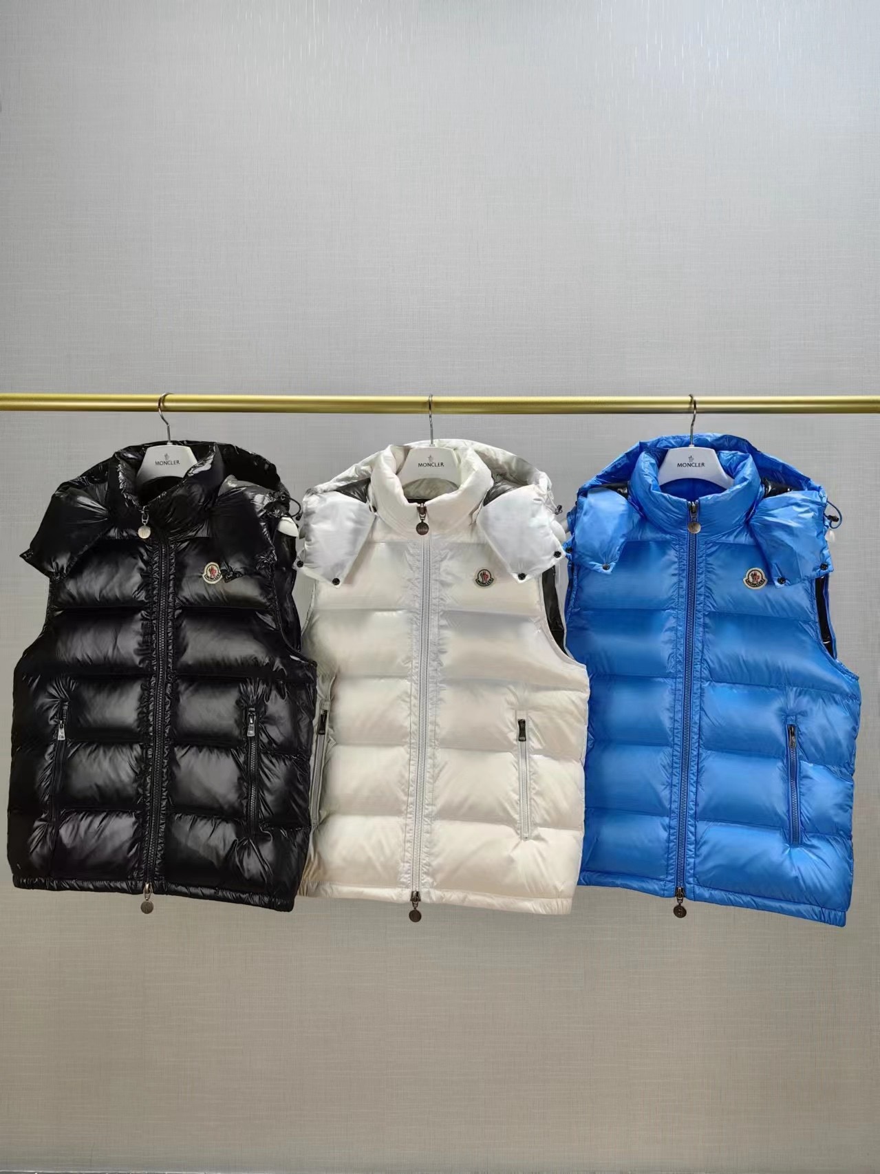 Guangzhou high-end Moncler Maya vest. Upgraded shiny nylon, classic quilting. Detachable hood, two-way zipper. Colors: black, blue, white. Sizes 1-5.