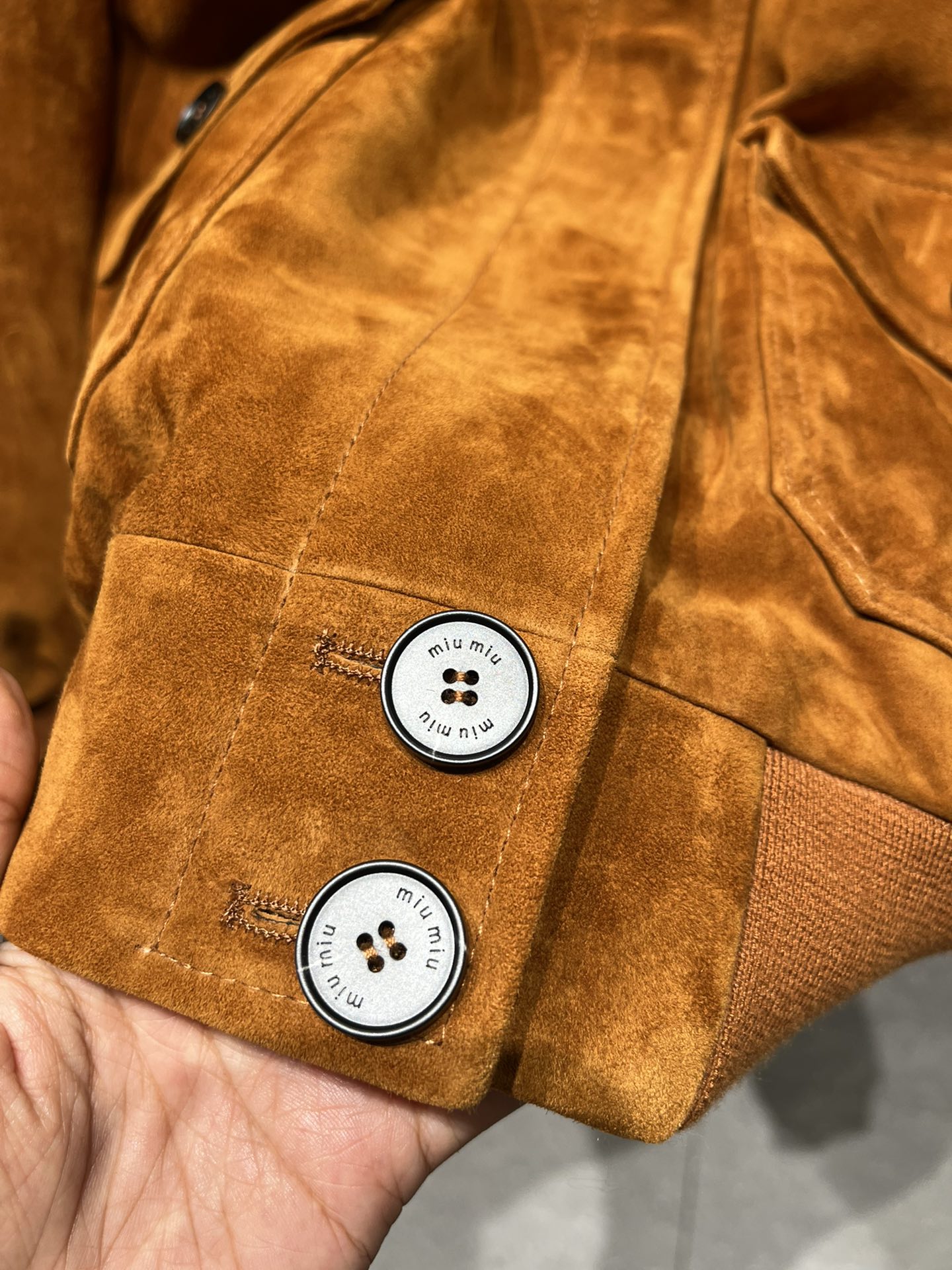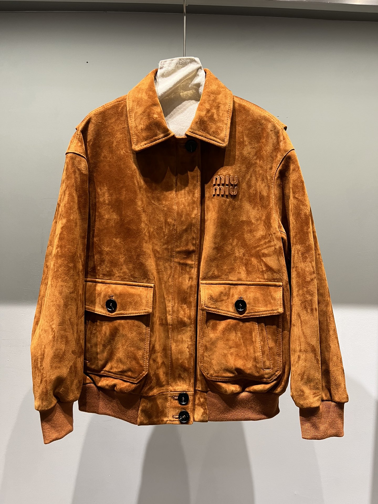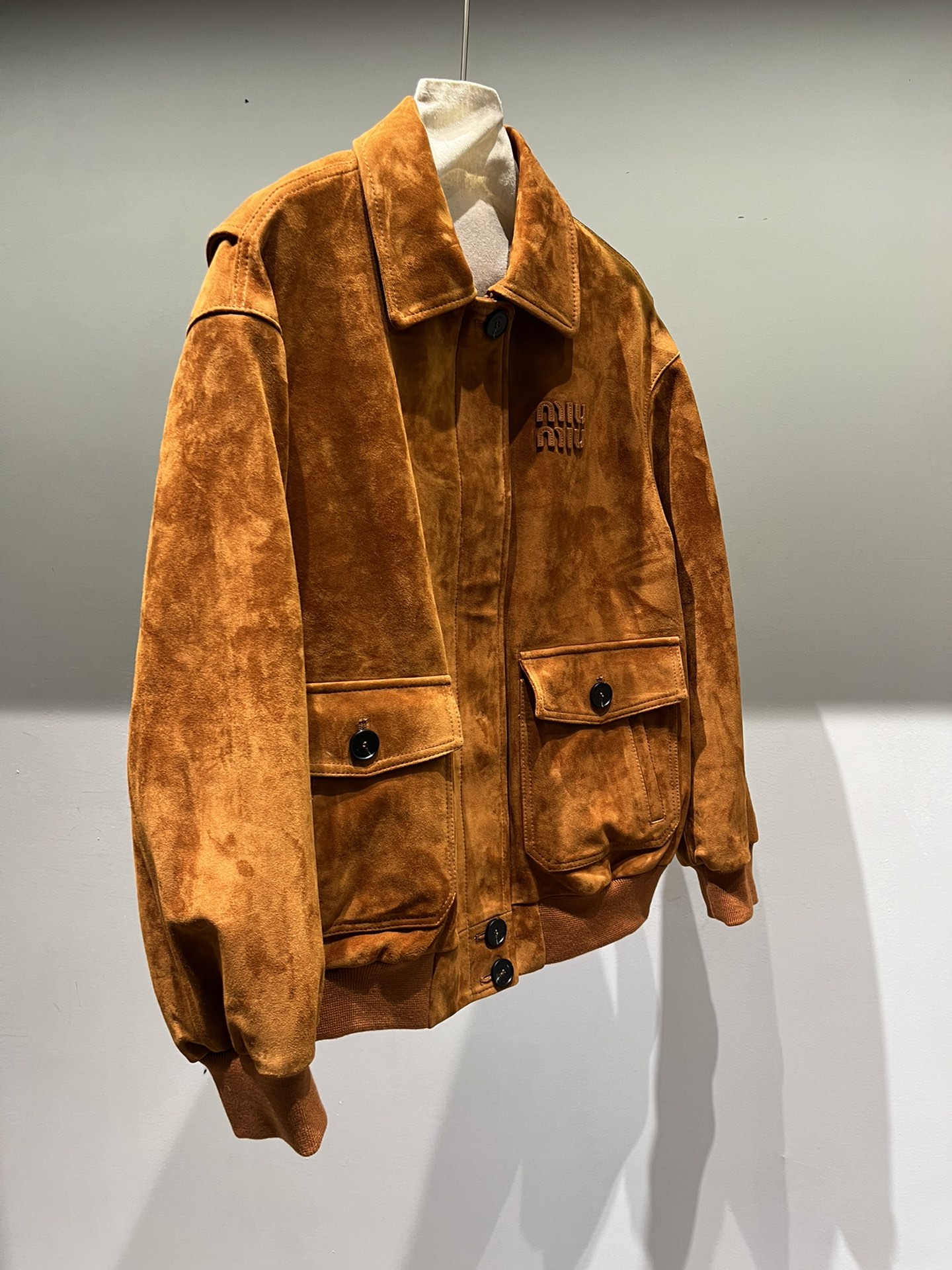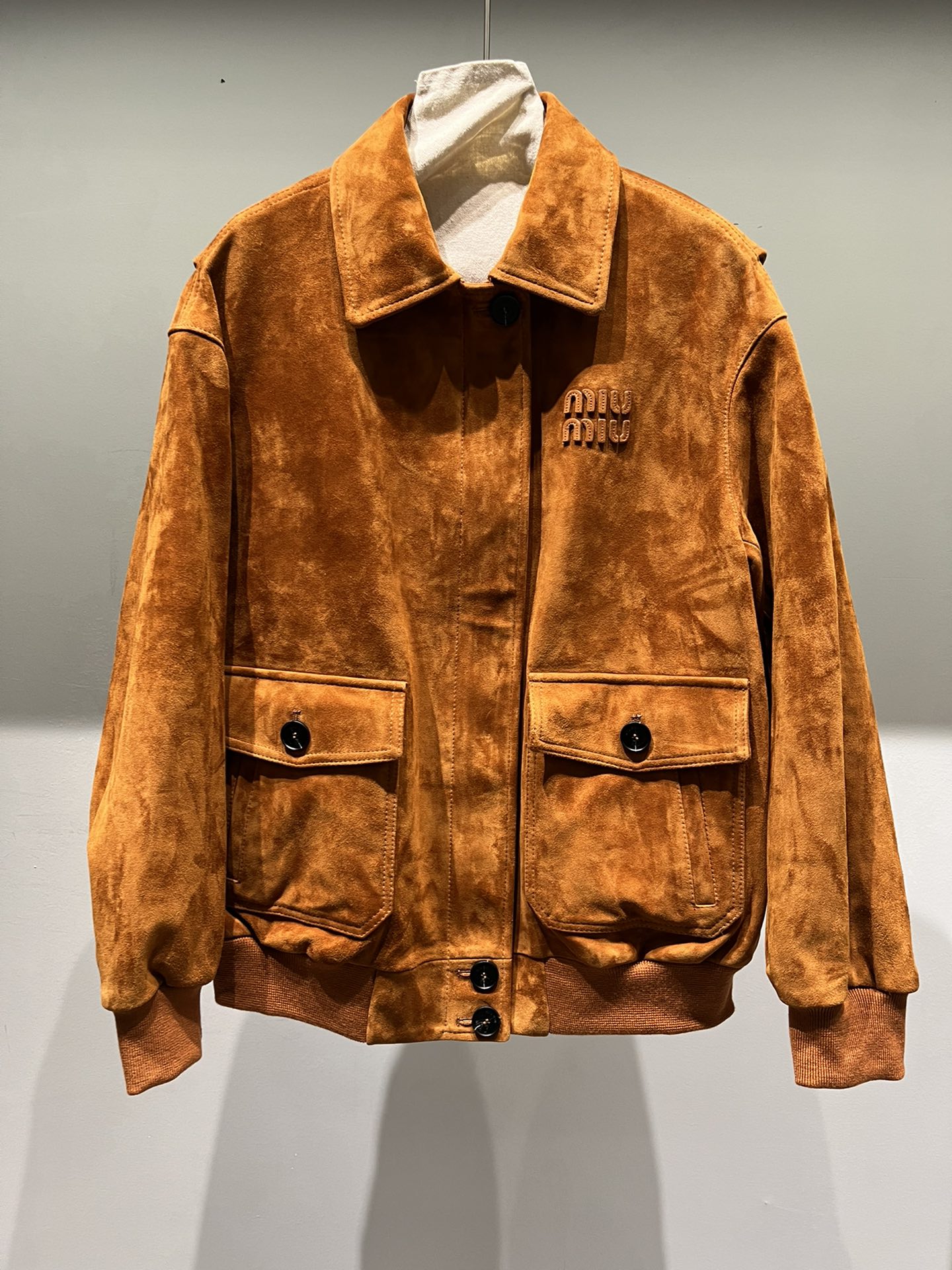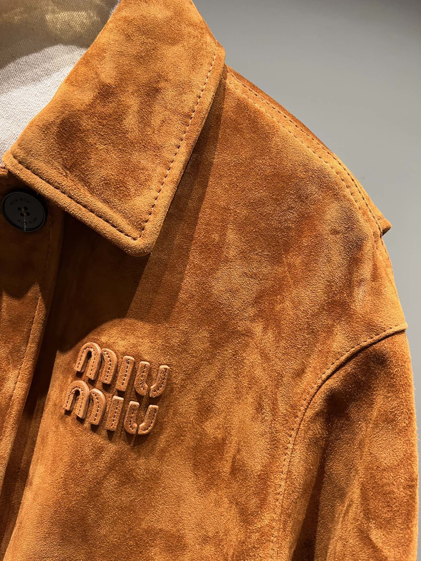 P1070, Miu Miu oversized mid-length shearling suede jacket. The letters feature an edging process that creates a very three-dimensional effect. The buttons are engraved with characters. Available in both light and dark camel, as well as deep brown.