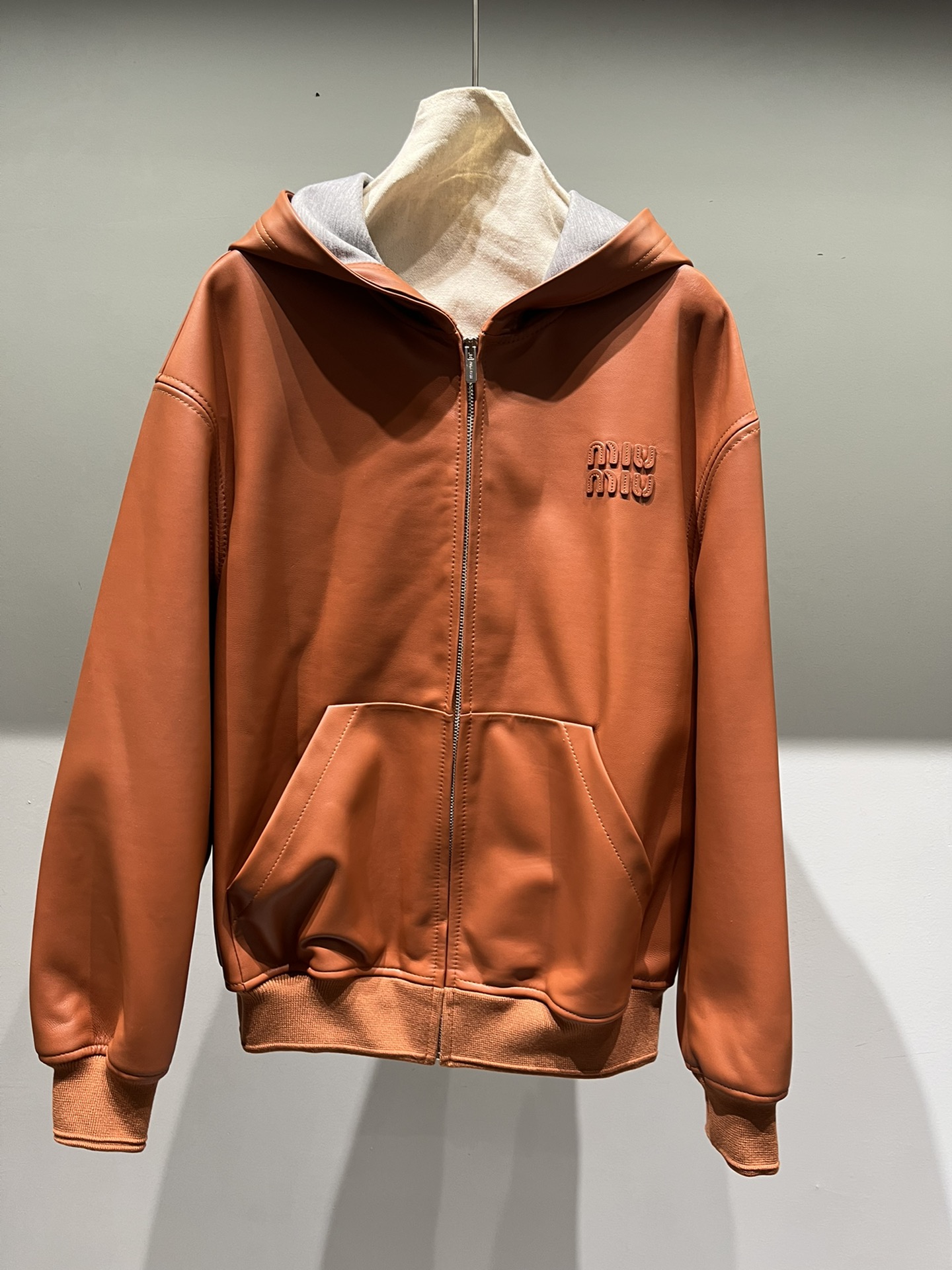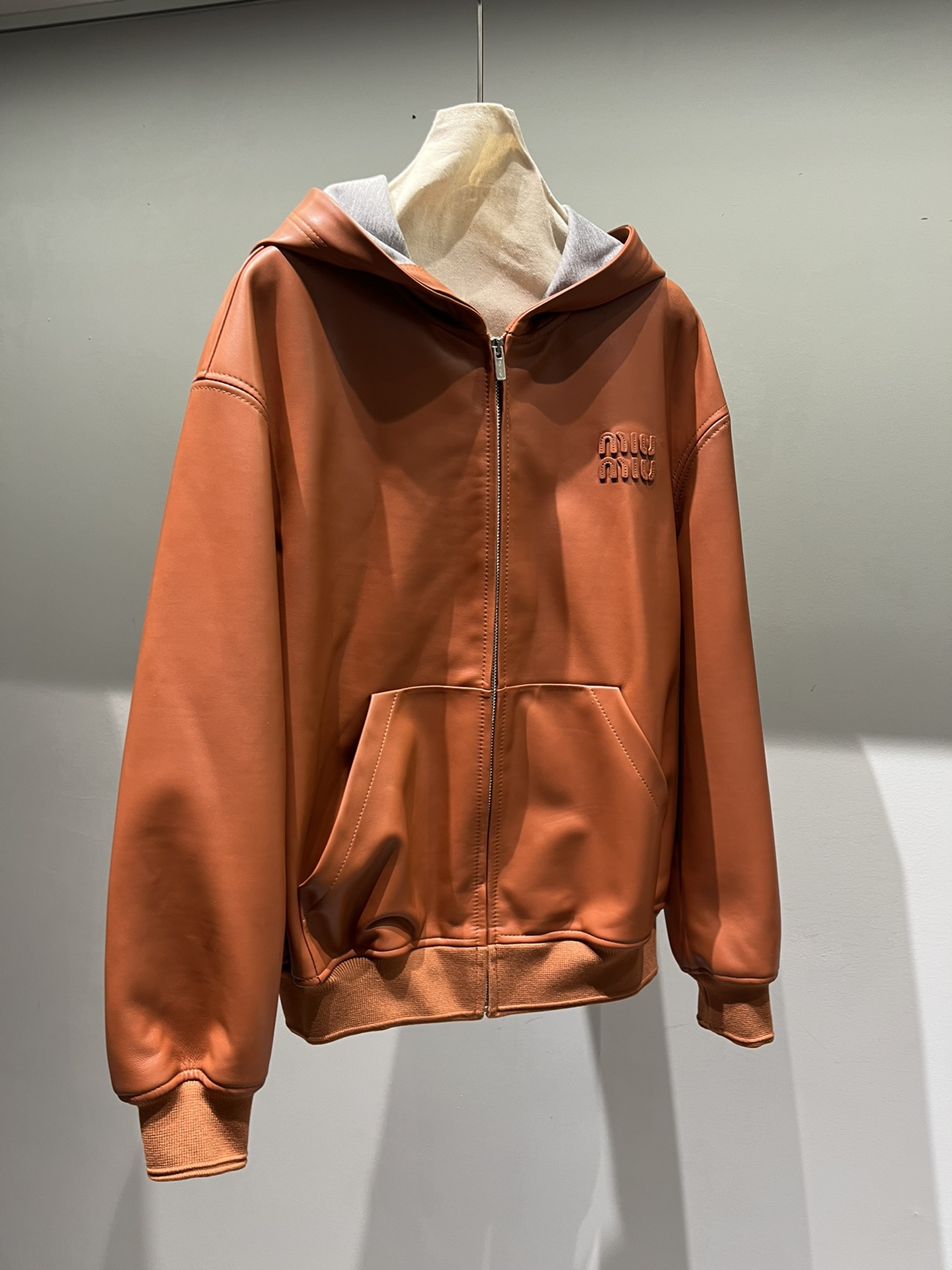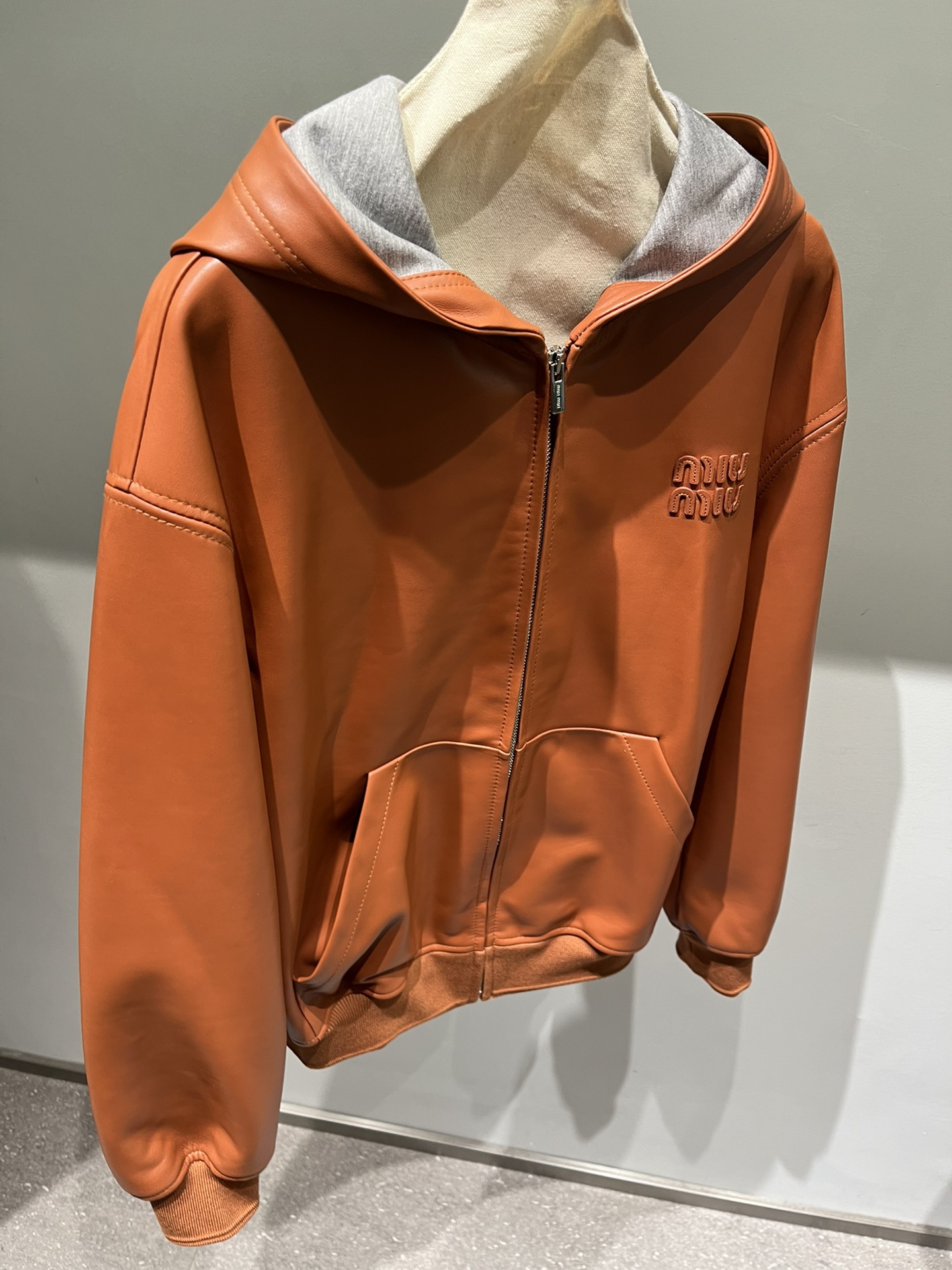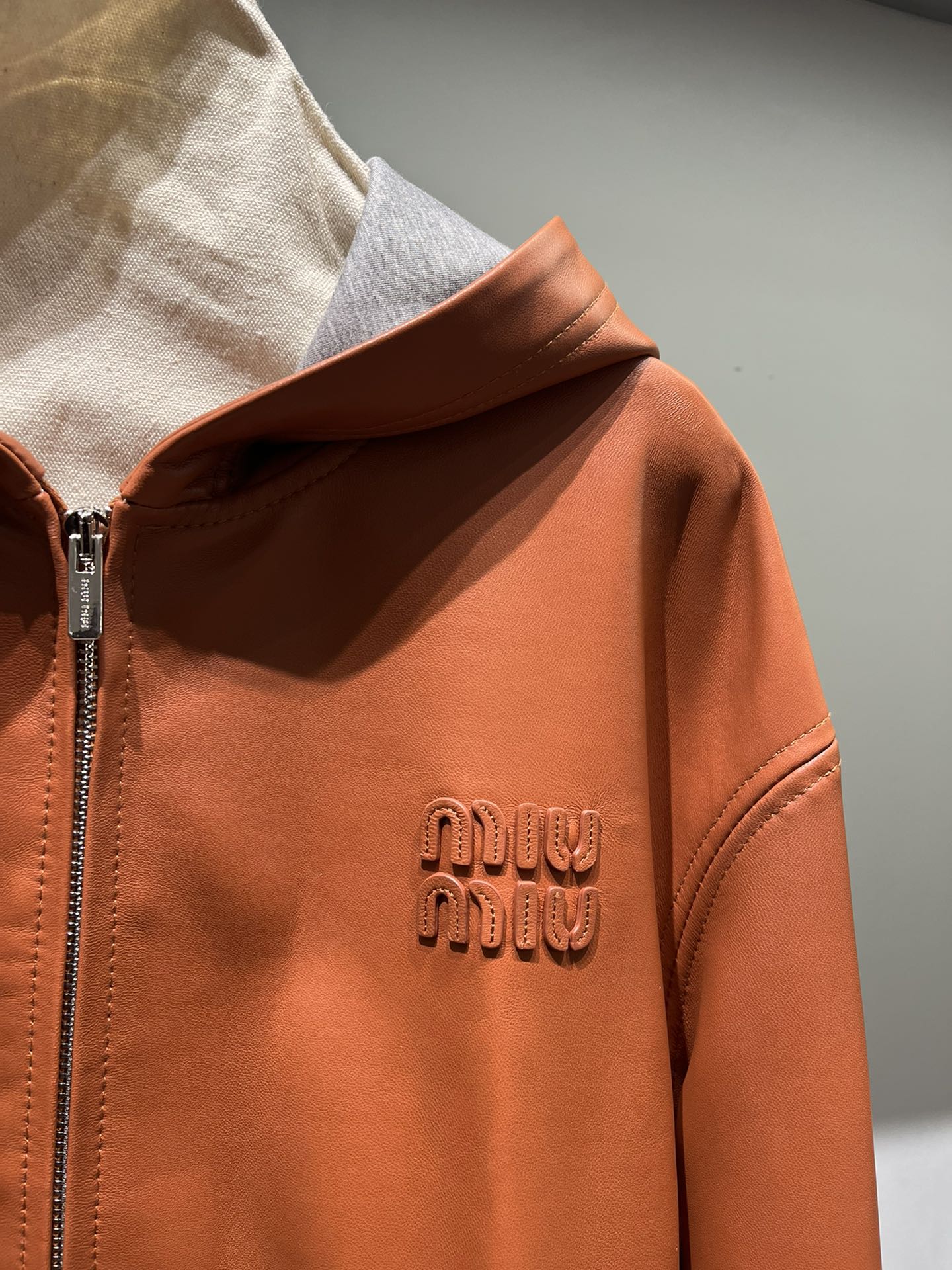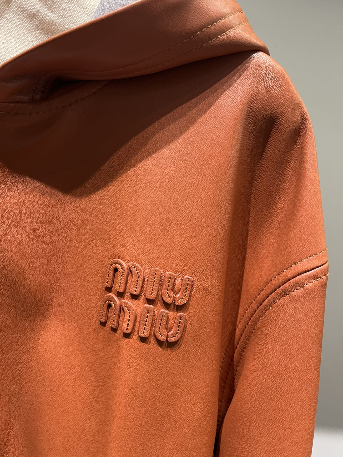 P840, Miu Miu lambskin hooded leather jacket, loose fit. Letters feature edge coating same as in-store, very three-dimensional.
