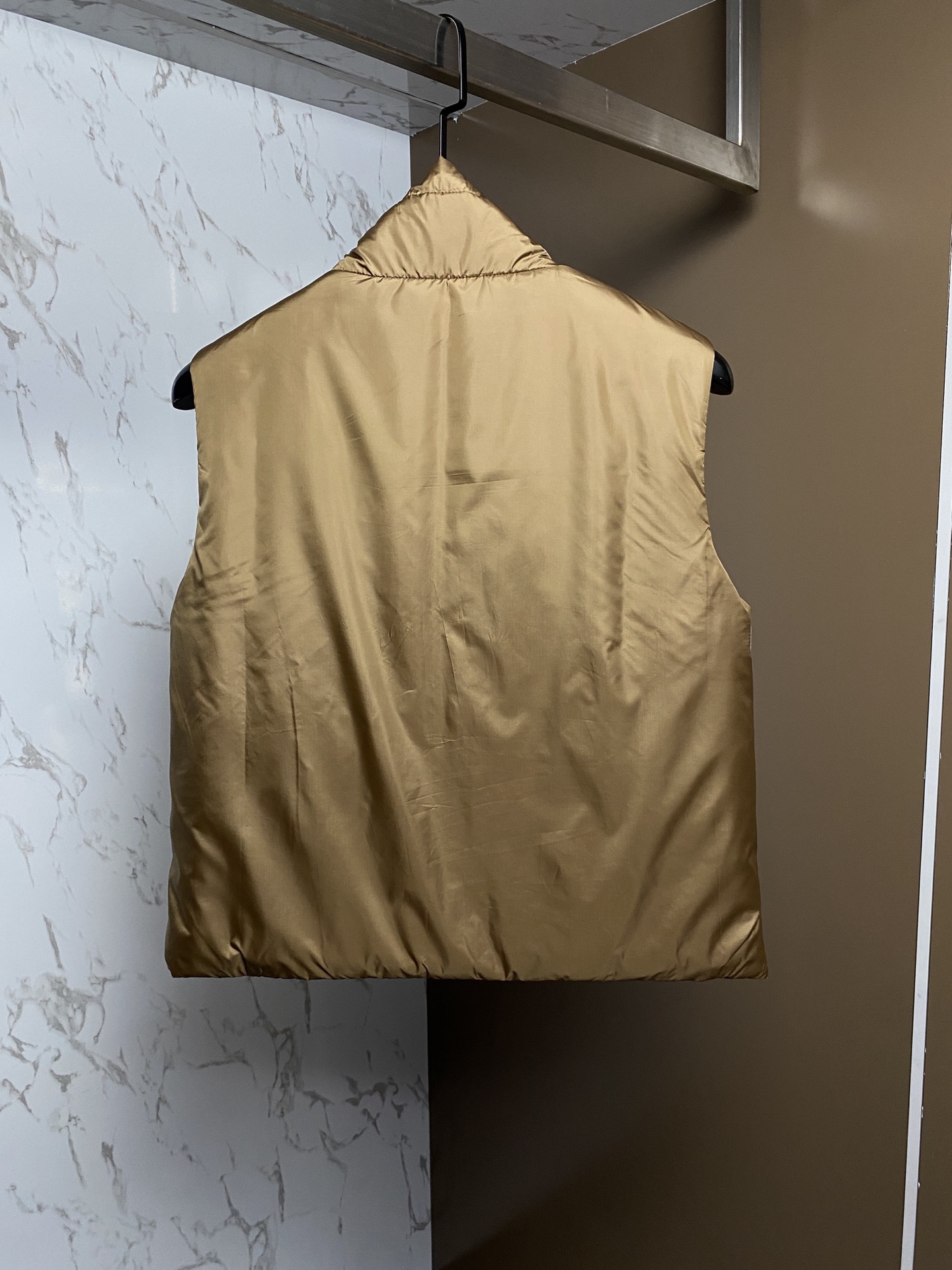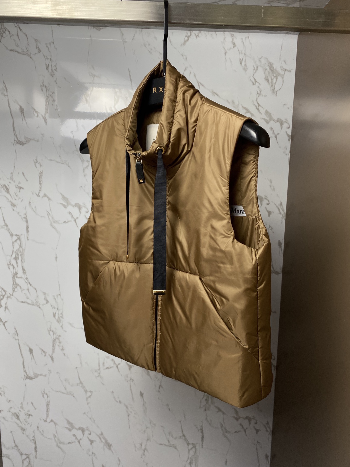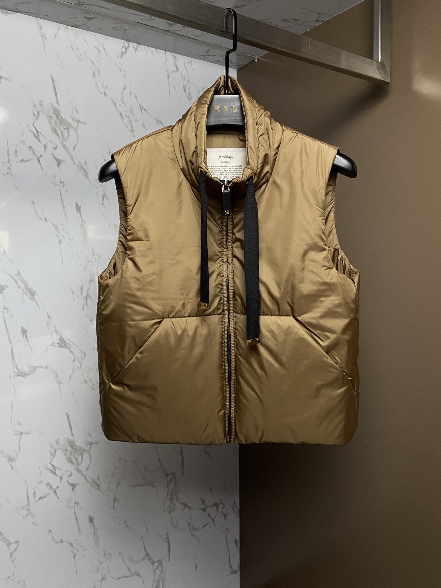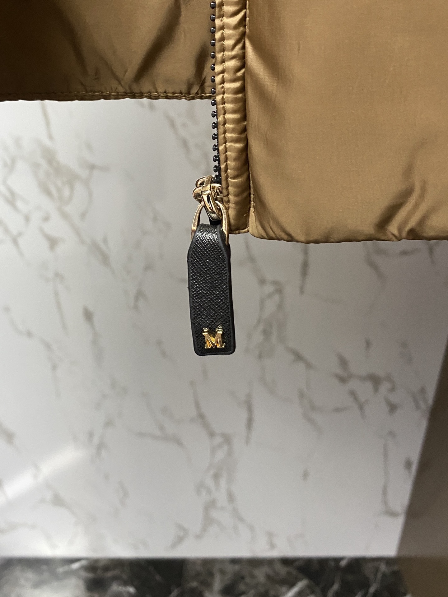This piece is made from polyester fabric with a moderate sheen. The zipper pull is adorned with a metal M logo to create a sense of luxury. The ends of the drawstring on the hood feature metal components, which is also a highlight.