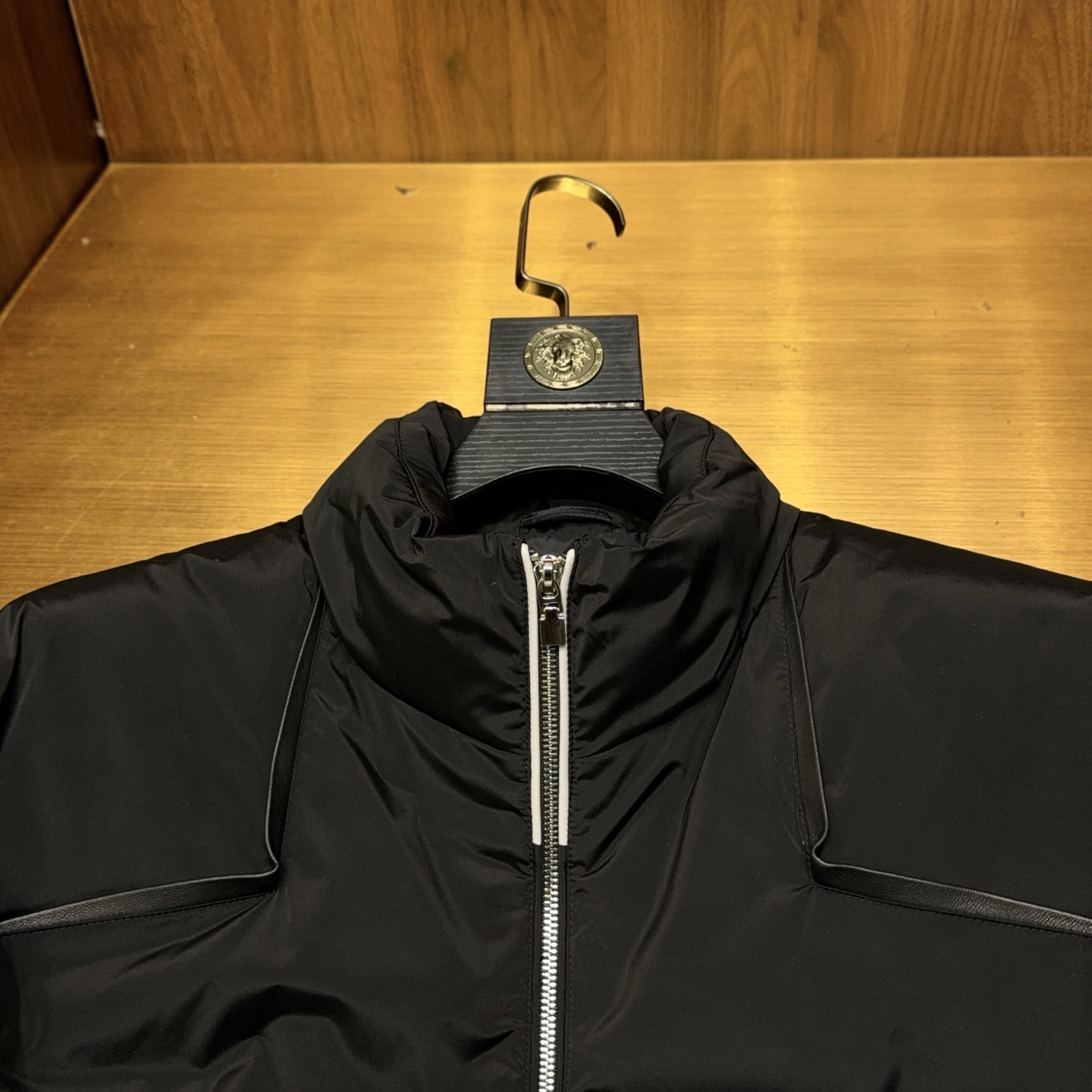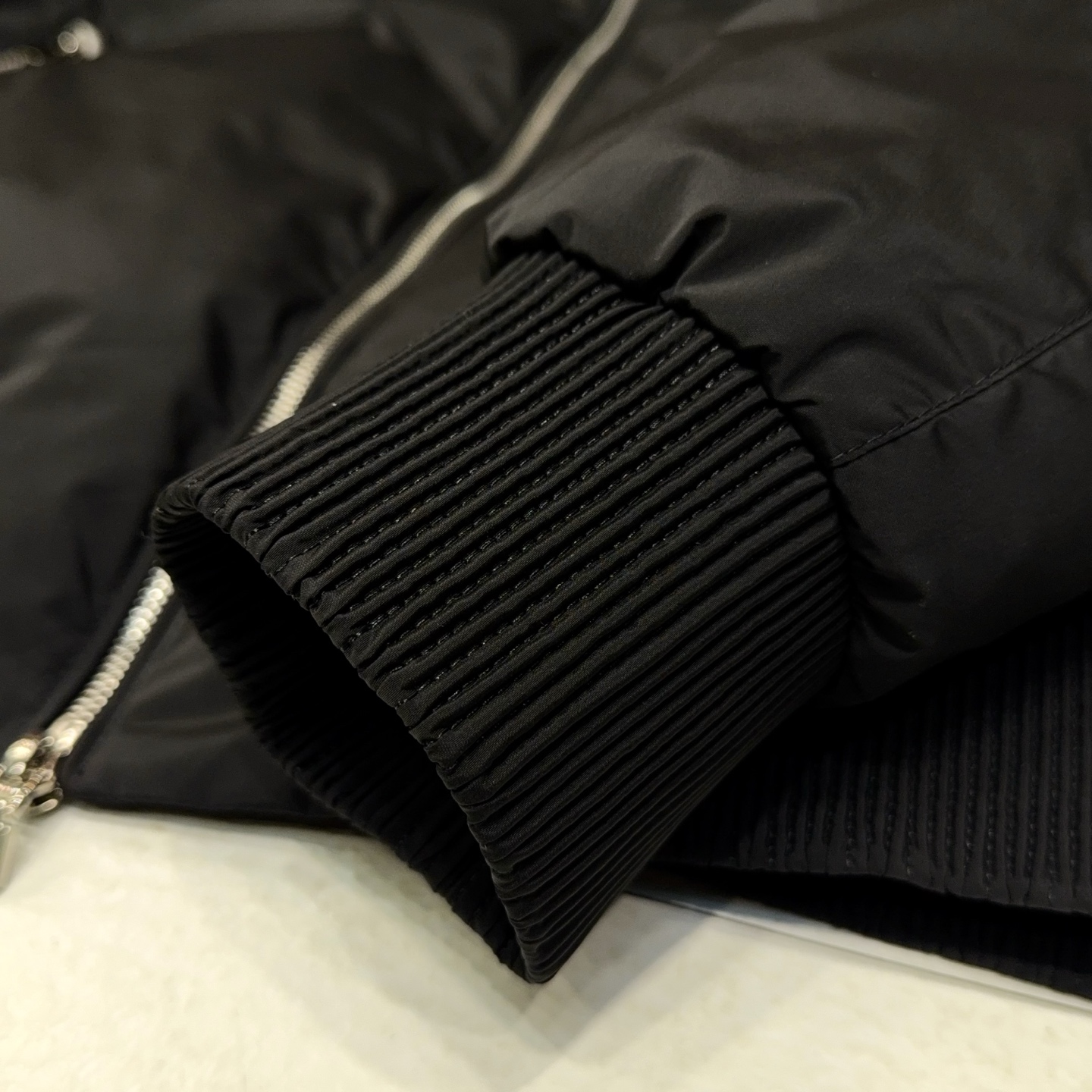 The classic stand collar design follows the neck's curve, providing wind protection and warmth while enhancing body proportions, showcasing a sharp aura. Key areas of the garment are accented with lamb leather trim strips; the delicate leather texture contrasts with the down fabric, hinting at luxurious sophistication within understated design, injecting clever details into the simple silhouette. The jacket-style cut is crisp and streamlined, shedding the bulkiness of long puffers, offering a more youthful and fashionable vibe, suitable for diverse styling needs.